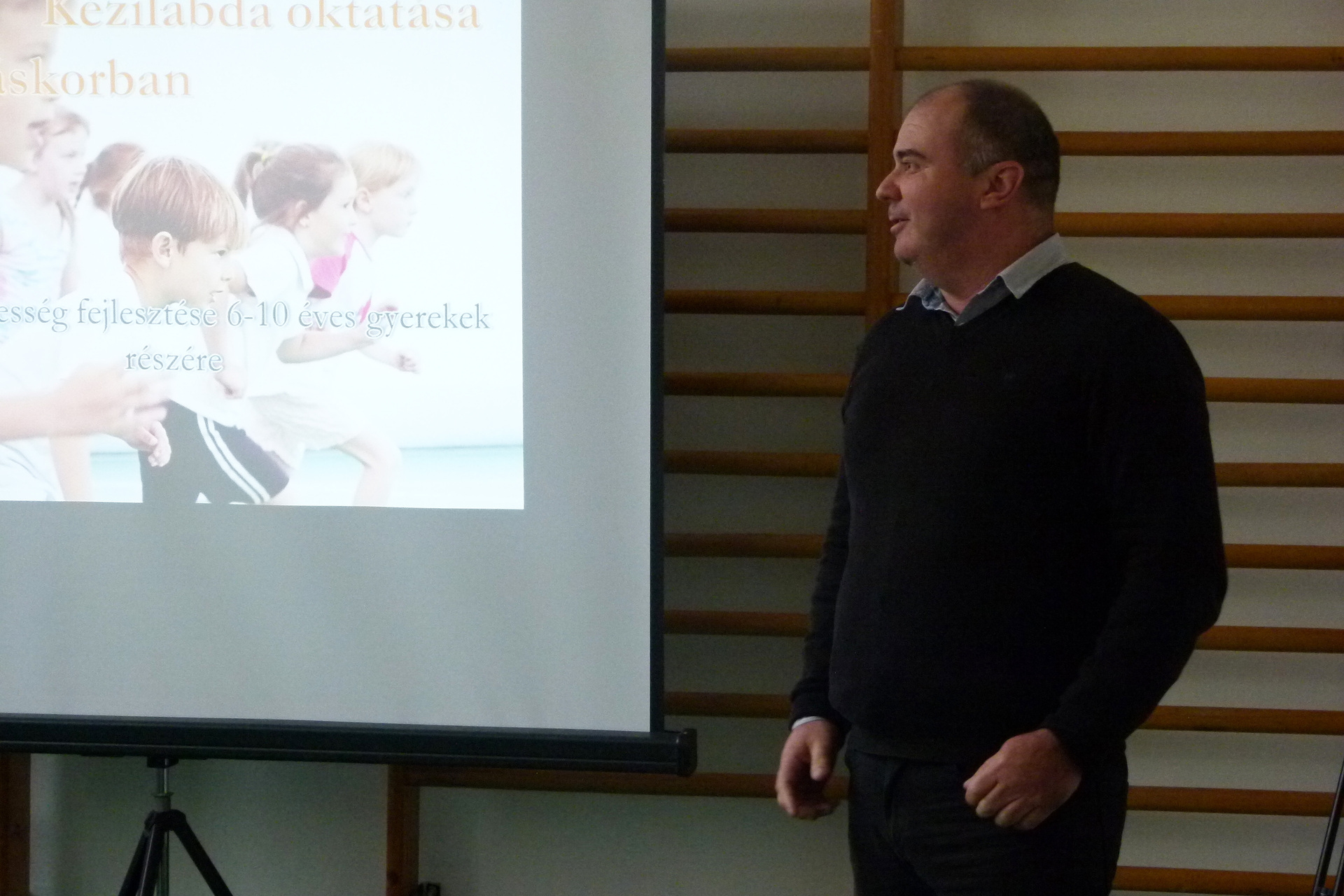 A következőkben a szakember előadást tartott a kézilabda-oktatás testnevelésórán történő megvalósításáról. Az eseményen a 6 és 10 év közötti gyermekek oktatása került terítékre. Az elméleti előadás során a testnevelő pedagógusok és az edzők többek között olyan kérdésekre kaphattak választ, mint a gyermekek kiválasztásának rossz beidegződése, az egyes oktatási folyamatok részei és sorrendjei, valamint a testnevelésórán történő oktatás elméleti és gyakorlati folyamata. Az edzőként Bajnokok Ligája-győztes szakember a kivetítő előtti elméleti előadást egyfajta gyakorlati előadással is fűszerezte, hiszen mindig meg is mutatta, hogy mire gondol pontosan, hogy ezzel is segítséget nyújtson a hallgatóságnak az elmondottak könnyebb megértéshez.