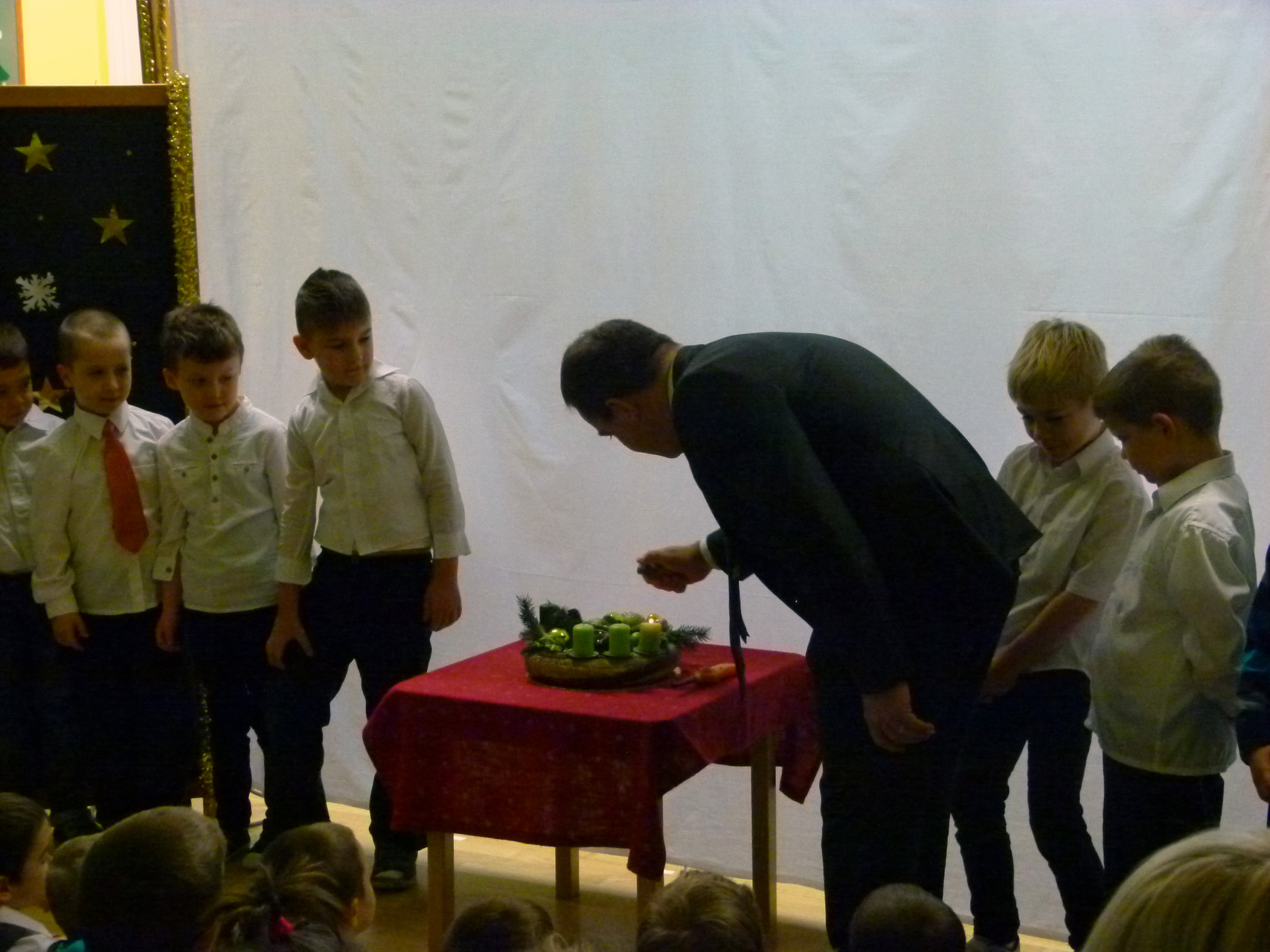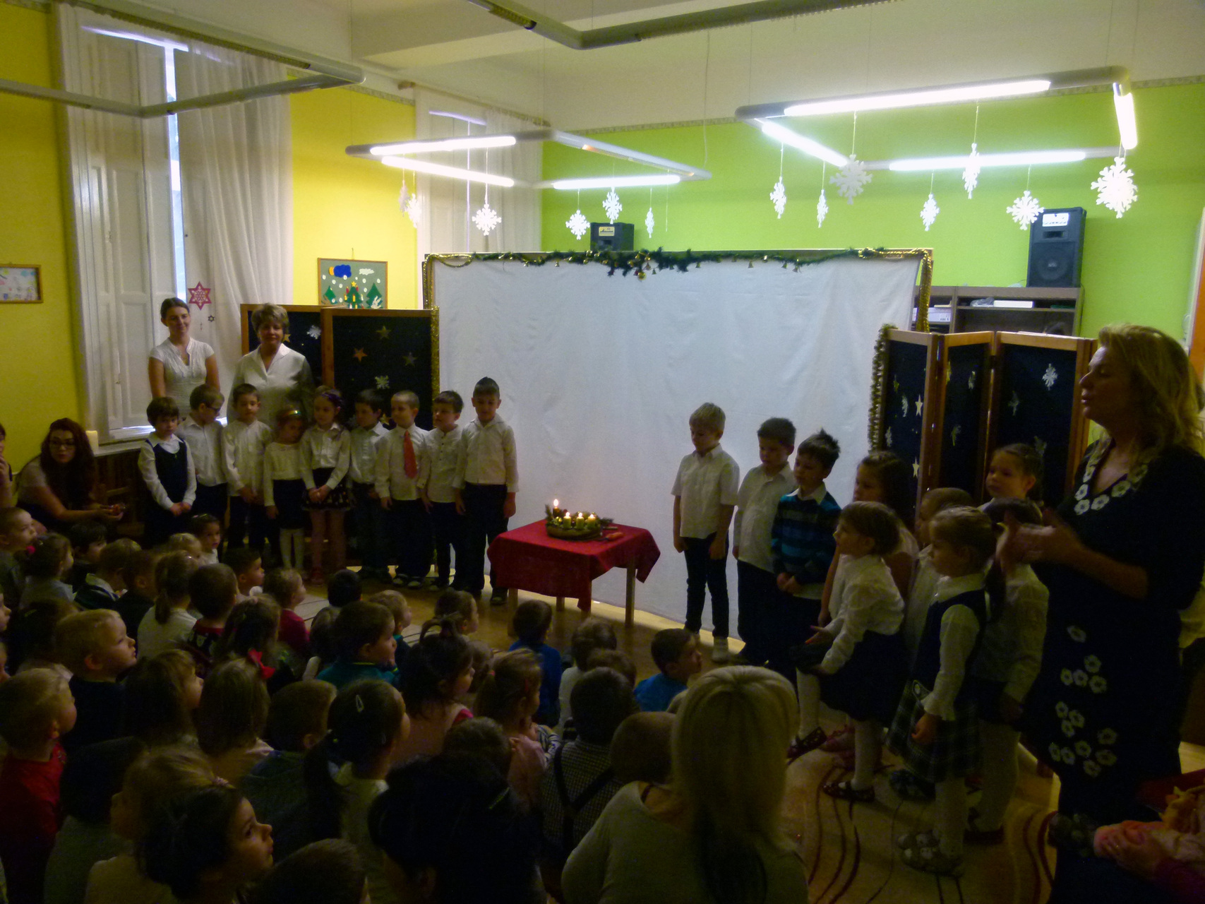 Kónya Istvánnak jutott az a megtisztelő feladat, hogy meggyújthatta az adventi koszorú mind a négy gyertyáját. A tagintézmény Cica és Őzike csoportos gyermekei árnyjáték-előadással varázsolták el a jelenlévőket. A nap további részében az előtérben elhelyezett karácsonyfát állták körül az ovisok, ahol karácsonyi énekeket és dalokat adtak elő. Visszatérve a csoportszobákba örömmel látták, hogy nekik is jutott a karácsonyi csodákból.