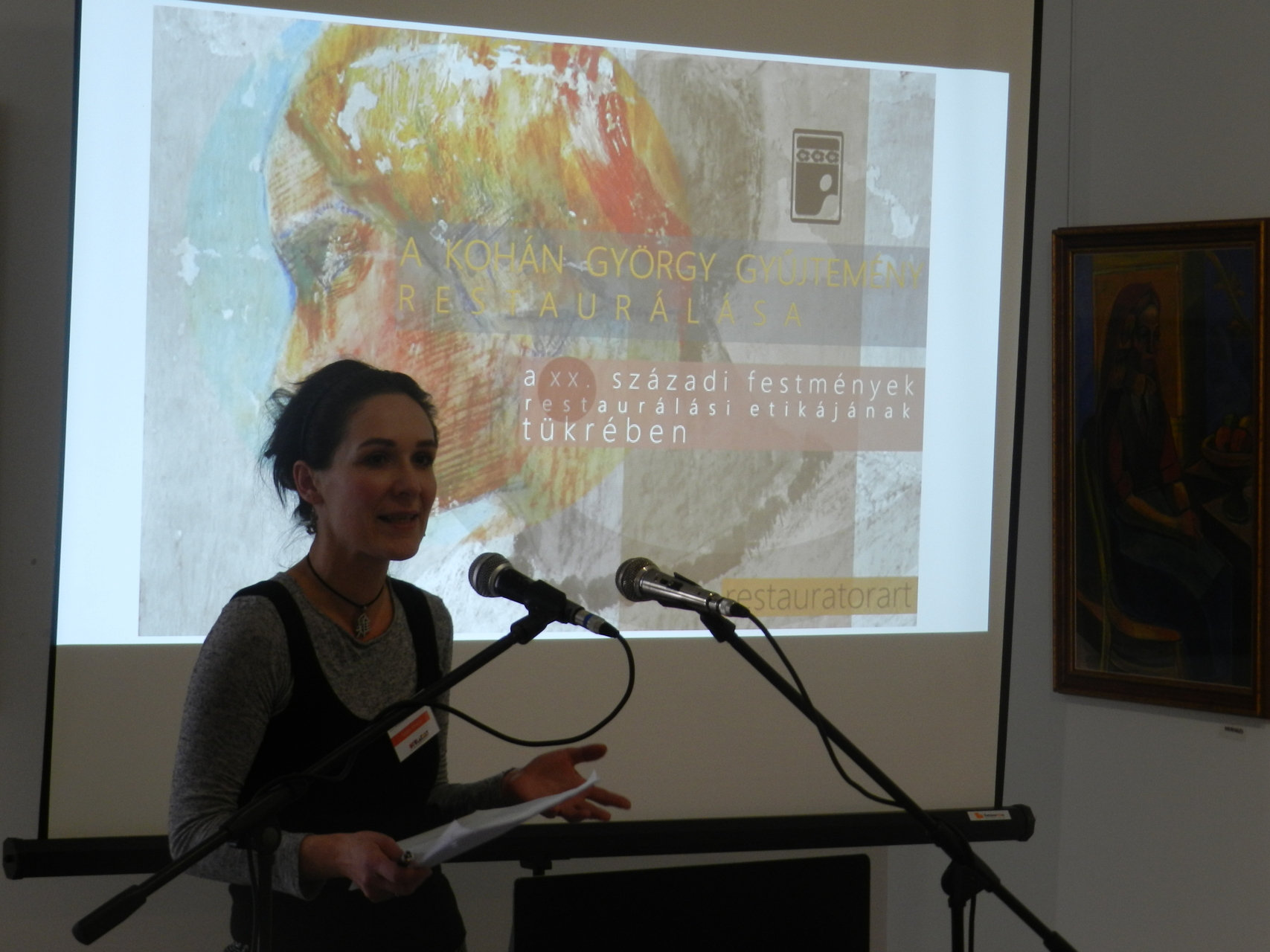 Gyöpös Viktória festő-restaurátor érkezett harmadikként, aki a Kohán György gyűjtemény restaurálásáról szólt néhány szót, a XX. századi festmények restaurálási etikájának tükrében. Megtudtuk, hogy XX. századi festményeket restaurálni – habár kevesen feltételeznék – de elég problémás. Azt gondolhatnánk, hogy mivel viszonylag új alkotások, még nem volt idejük megsérülni vagy károsodást szenvedni, az anyagoknak még nem volt ideje elöregedni. Azonban ez nem teljesen igaz, hiszen a múlt században számos új anyag vált művészeti alapanyaggá. Fel kell fedezni a szándékosságot, ki kell választani, hogy mi az a gesztus, a momentum, amelyet a művész valóban szándékosan tett a képre.