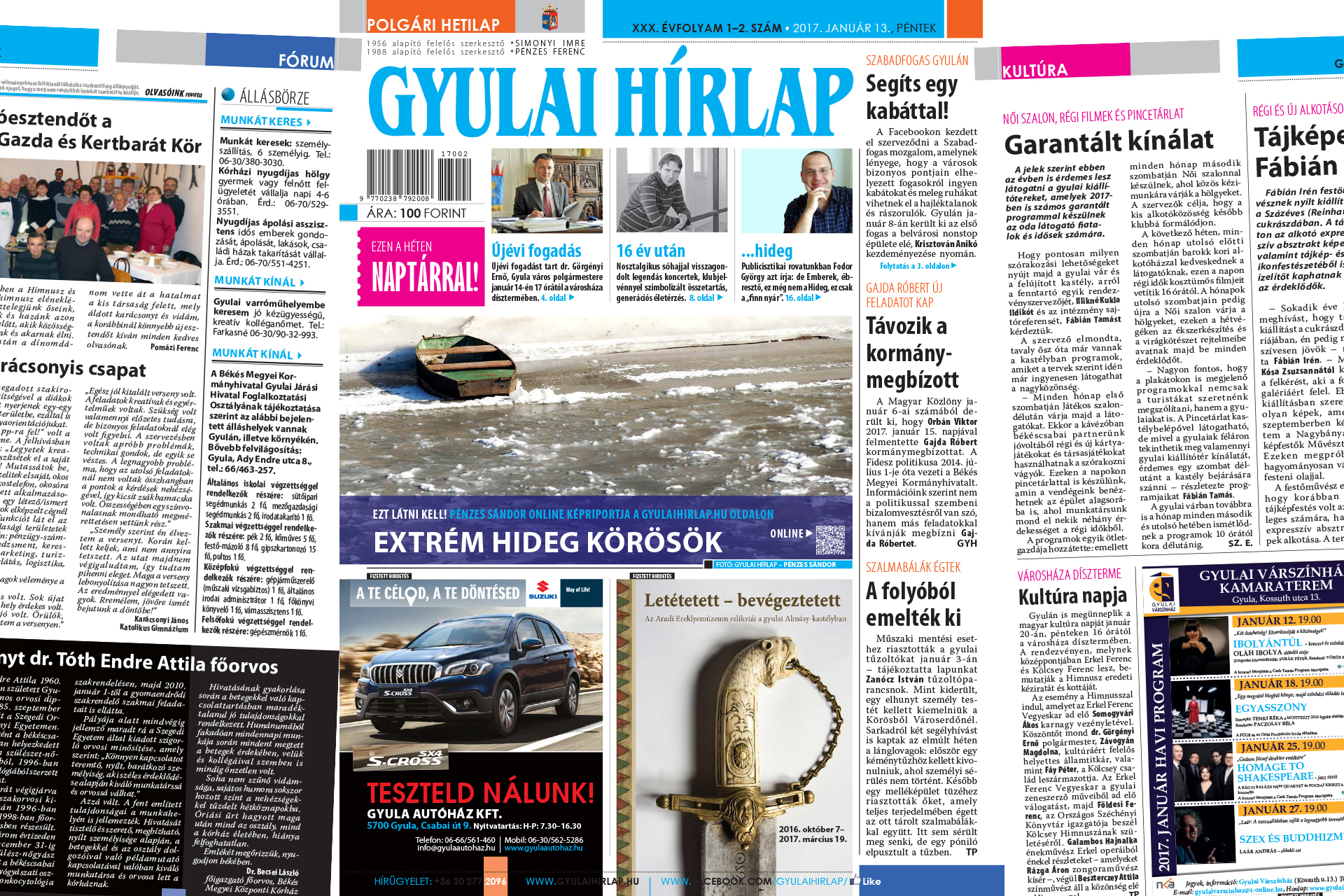 A Gyulai Hírlapot saját kézbesítőink viszik el az önök által megadott lakcímre hétről hétre. Előfizetőink már szerdán este kézbe vehetik és olvashatják a friss Gyulait! Az előfizetésnek más előnye is van, arról nem is beszélve, hogy előfizetve 33 forinttal olcsóbb egy lapszám. A Gyulai Hírlapra egy kerek esztendőre csupán 3500 forintért fizethet elő. Lapunk ajándéknak sem utolsó! Ha az előfizetéssel kapcsolatosan kérdése lenne, hívja Csepregi Brigittát a 06 30 627 6889-es számon.
