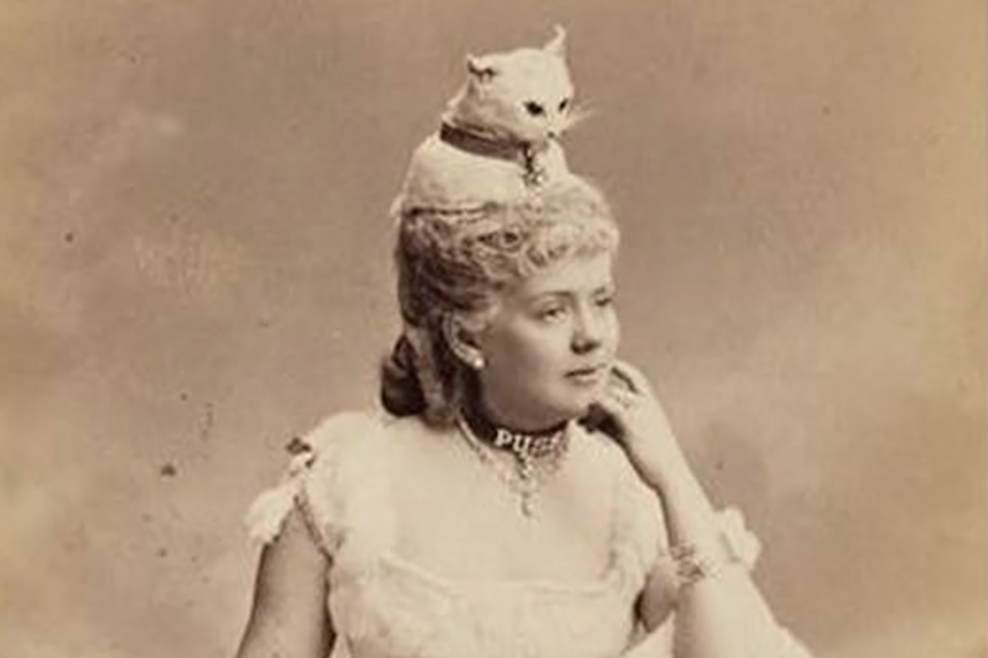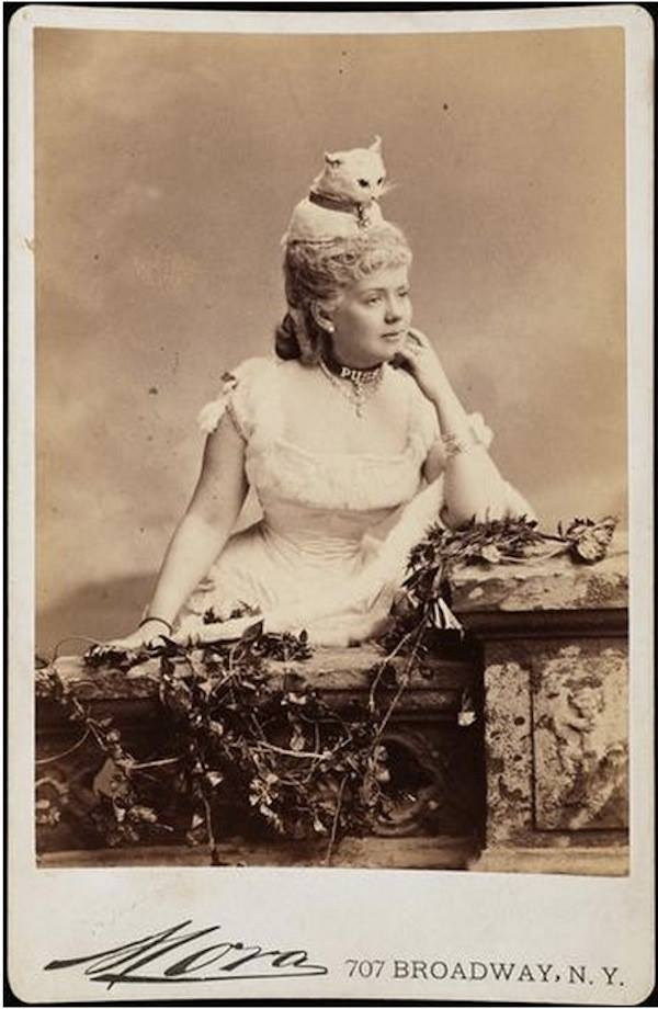 Egy rosszul élő cica, Miss Kate Fearing Strong, becenevén Puss, azaz Macska, meg egy rossz sorsra, helyre juttatott halott cica (stílszerűen) Miss Kate Fearing Strong fején. A képet 1883-ban egy New York-i bálban készítették, de az igazság az, hogy bárhol és bármikor megörökíthették volna. Mert az élet egyesek számára csupa móka és kacagás.