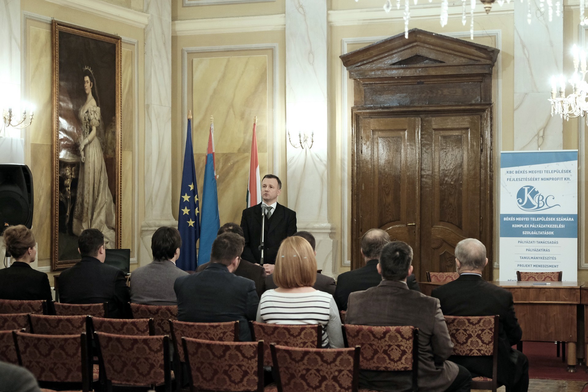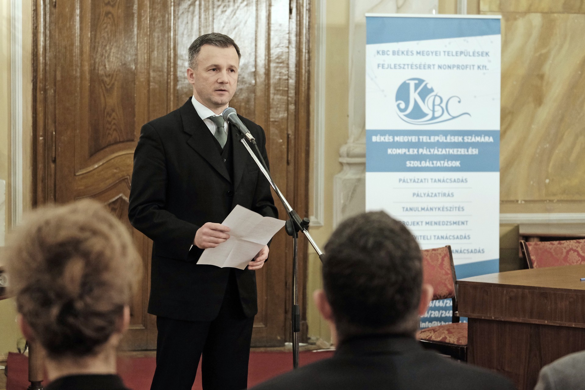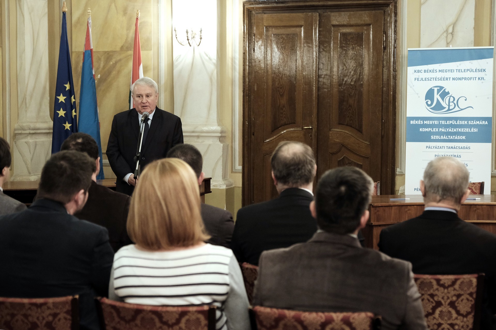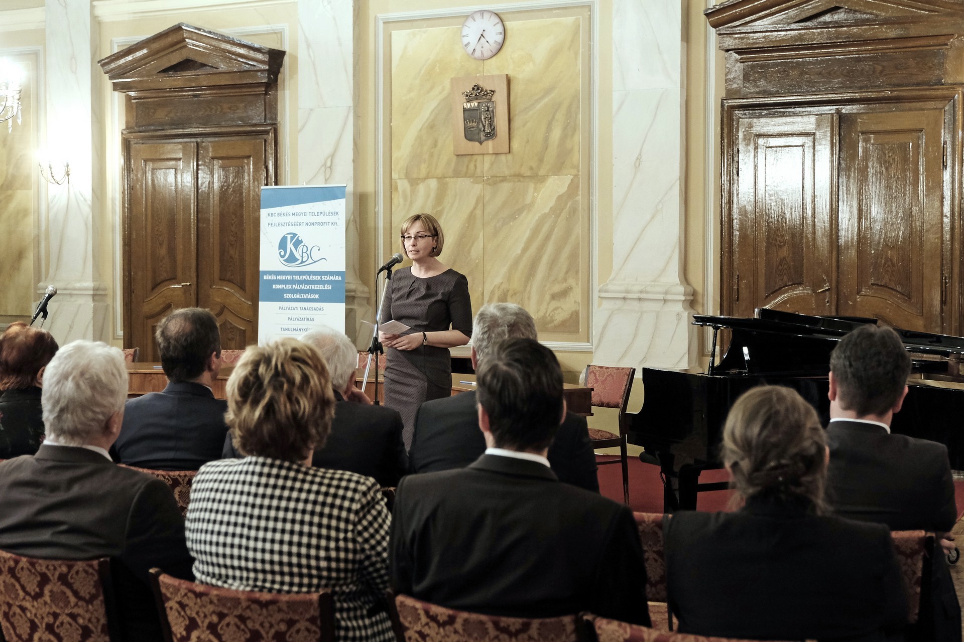 – Megtiszteltetés és bizonyos értelemben szimbolikus, hogy a díszteremben lehetünk ma – fogalmazott dr. Görgényi Ernő. – A Gyulai Városháza egykor a megyeháza volt, idén pedig 140 esztendeje lesz, hogy elkészült ez a díszterem, amelynek a Békés vármegyei települések vannak a mennyezetére festve. Mi, akik itt vagyunk, hiszünk a megyei összefogásban, hiszen mi, akik a KBC-t alkotjuk, szabad akaratunkból egy olyan együttműködési szervezetet hoztunk létre, amelynek az a célja és küldetése, hogy erőforrásainkat egyesítve írjunk pályázatokat, az elnyert pályázatokat pedig menedzseljük településeink fejlődésének érdekében és a polgárok jólétének növelésének céljából.