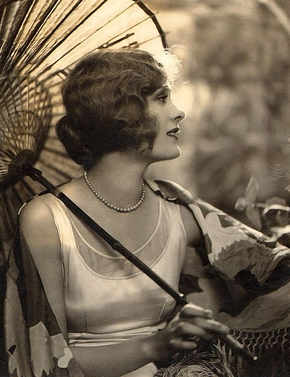 Imádom, amiként szétfolyik az él a kézfejen, ahogyan kiéleződik és határt szab a gyöngysor. Imádom a kompozíció egyensúlyát, a fehér és a fekete millió tónusát, a természet árnyékait a háttérben, a hiányzó részleteket, a mű esetlegességét. A nyél hangsúlyos keresztvonalát, a vállakról finoman leomló kendő párhuzamát, a nézőpontot, amely felszabadítja a tekintetet, közelebb visz a távolban megjelenő szeretett személyhez. Káprázatos az ernyő testét megvilágító napfény. Mennyivel kevesebb lenne ez a kép nélküle.