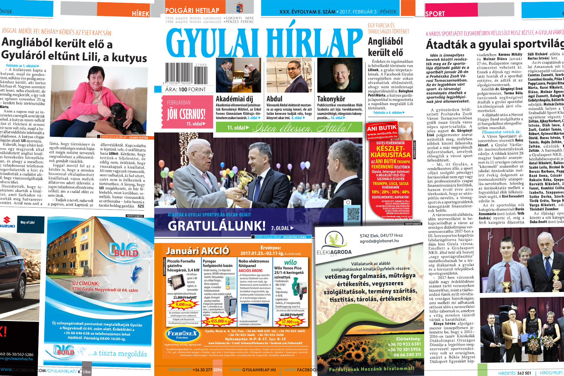 Székelyhidi Attila 75. születésnapját ünnepelte január 30-án, a festőművészt mi is felköszöntöttük. A héten több gyulai díjazottról is írunk lapunk hasábjain. Kereskényi Miklós, az Erkel Ferenc Gimnázium tanára akadémiai elismerést vehetett át, Bántainé Sipos Éva zenetanár pedig a Magyar Művészeti Akadémia tagozati díját kapta meg nemrégiben. A sportbálon kiosztott elismerésekről Bimbó Lajos számolt be.