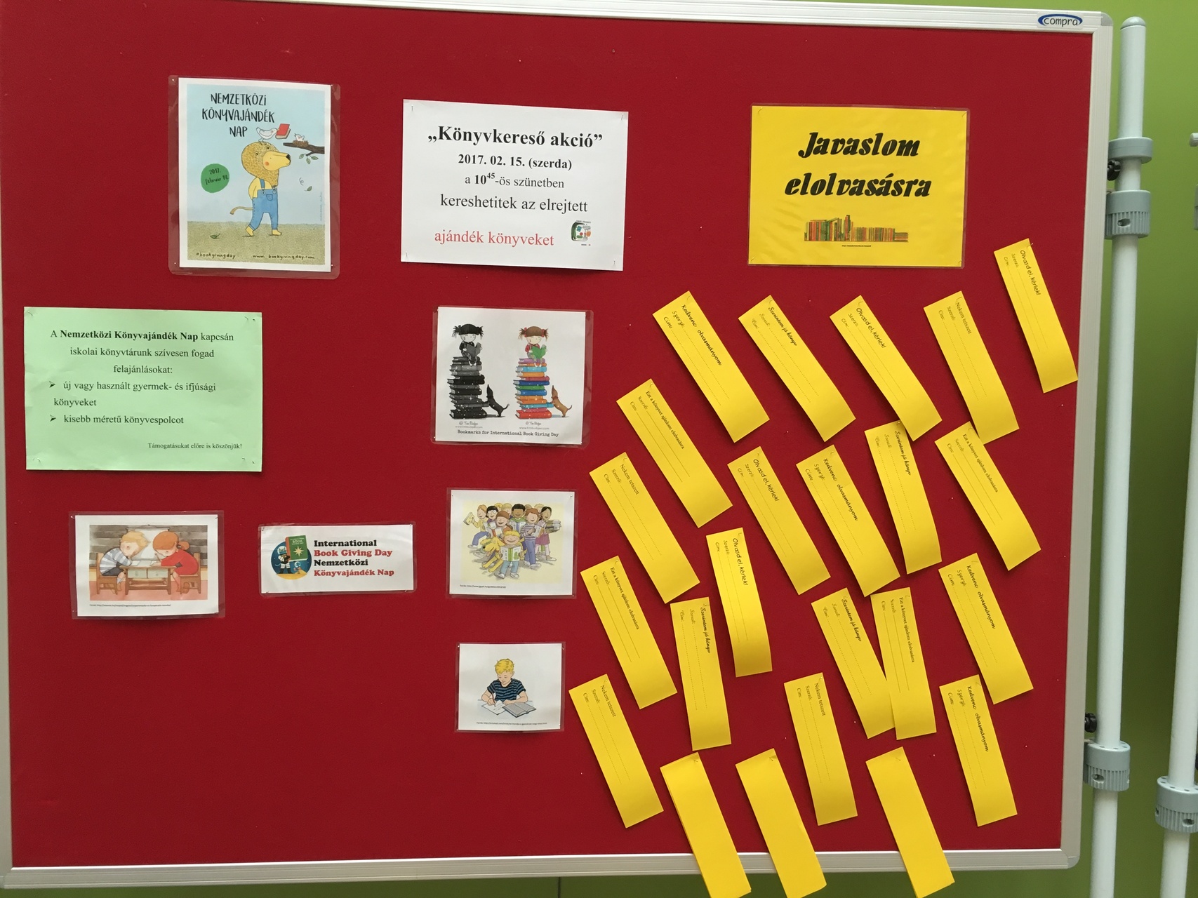 A Gyulai Implom József Általános Iskola Könyvtára harmadik alkalommal hirdette meg a „Könyvkereső akcióját”. Szponzorokat kutattak fel, akik támogatásával 56 darab új könyvet tudtak becsomagolni, s elrejteni az iskola közösségi tereiben. Egy óraközi szünet állt rendelkezésre a könyvvadászathoz. Hatalmas lendülettel kezdték meg a tanulók a keresgélést, hiszen a megtaláló boldog tulajdonossá válhatott. Jó volt látni, hogy a könyvajándékok ekkora örömet tudnak okozni.