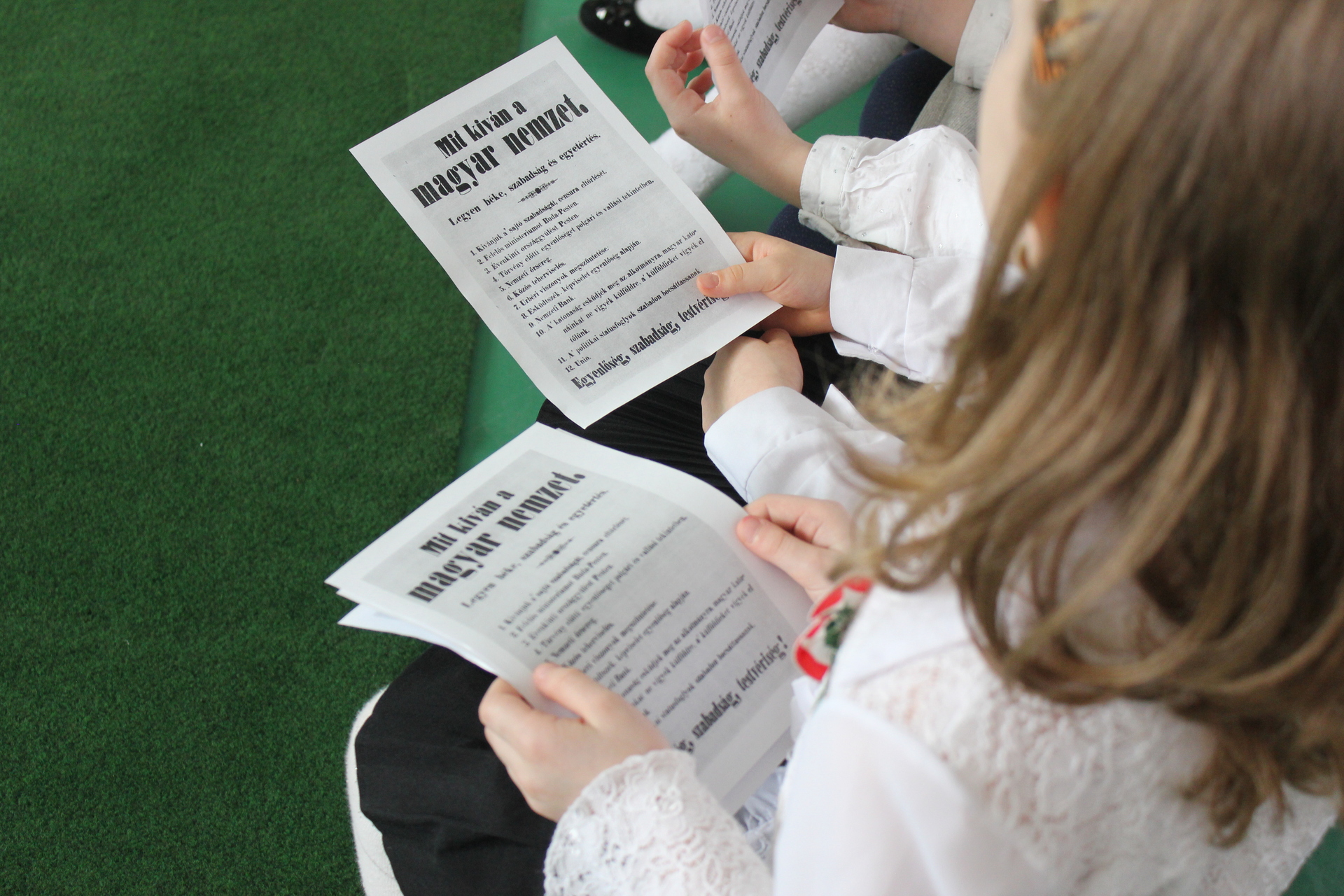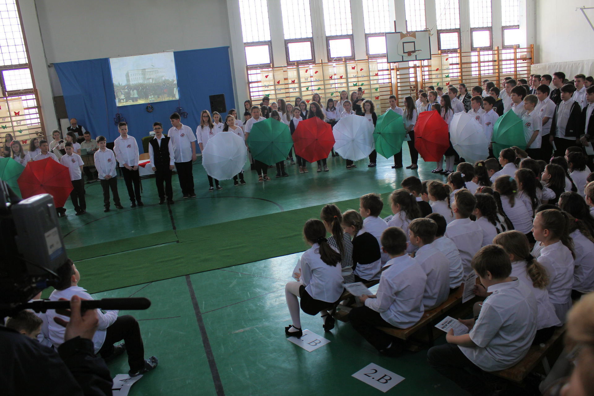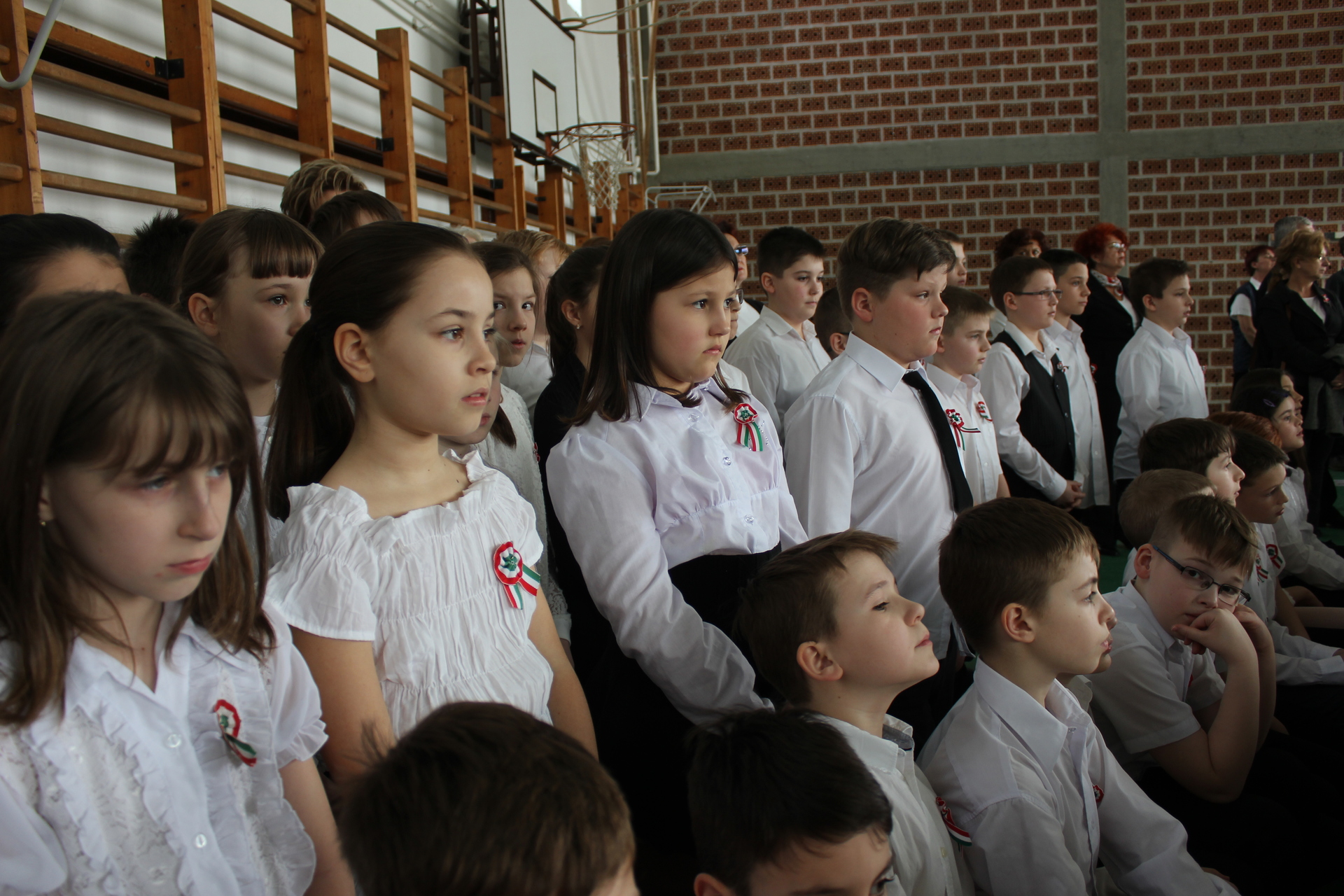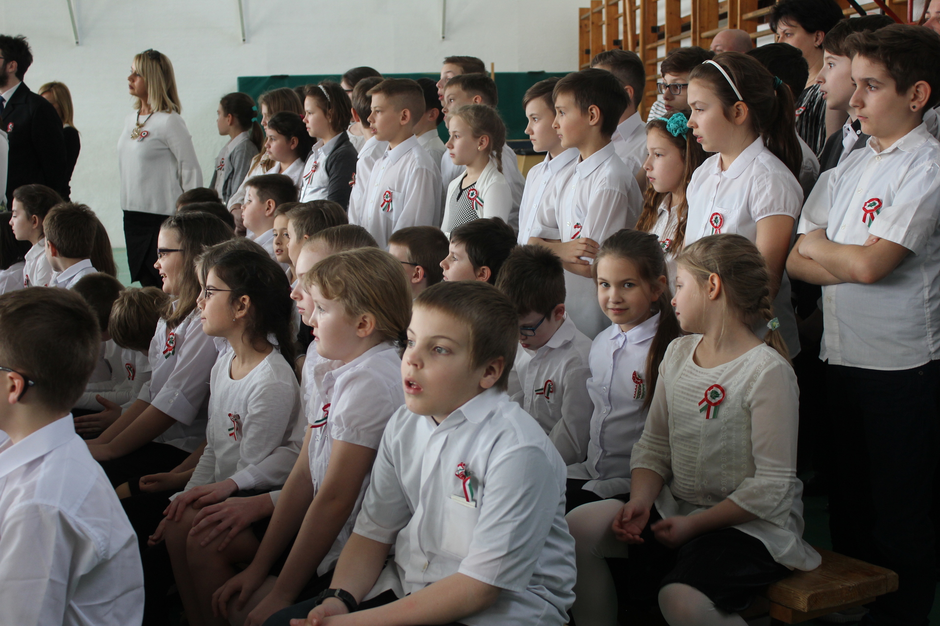 Az iskola minden diákja hivatalos volt a március 14-i, ebéd után kezdődő eseményre, melyre az intézmény sportterme is díszbe öltözött. A háttérben a márciusi ifjak kivetített fényképe és egy hatalmas kokárda volt látható.