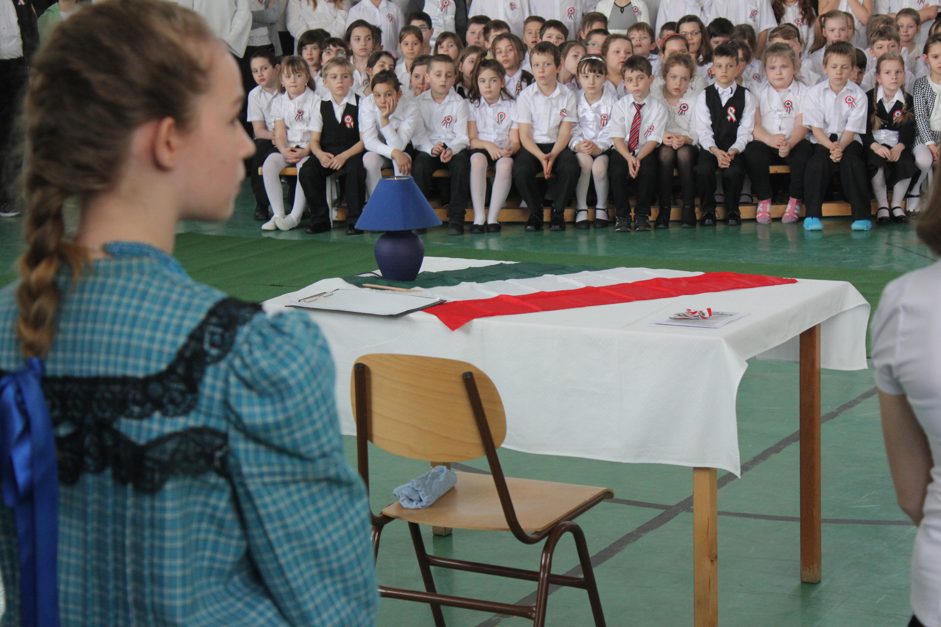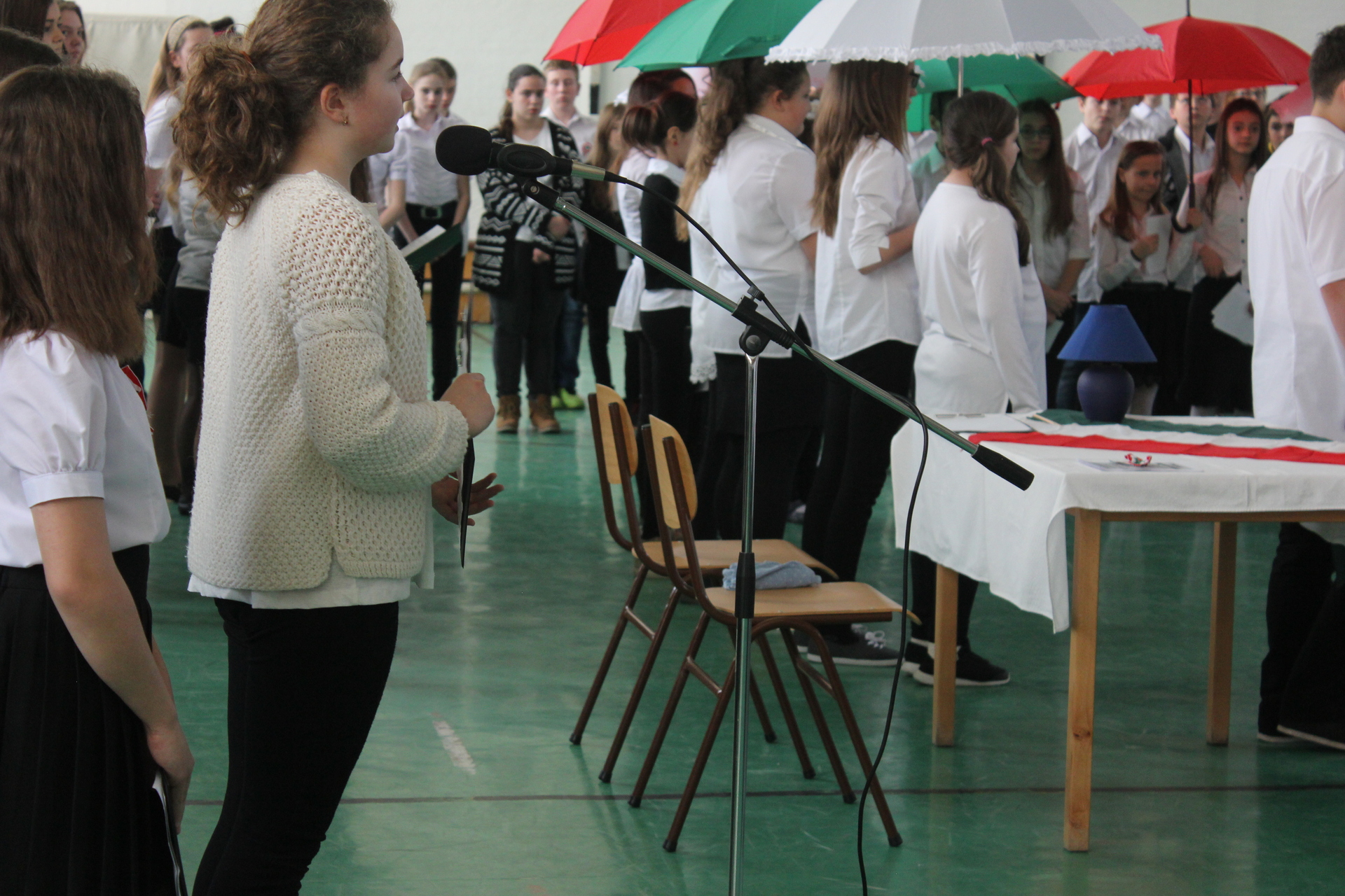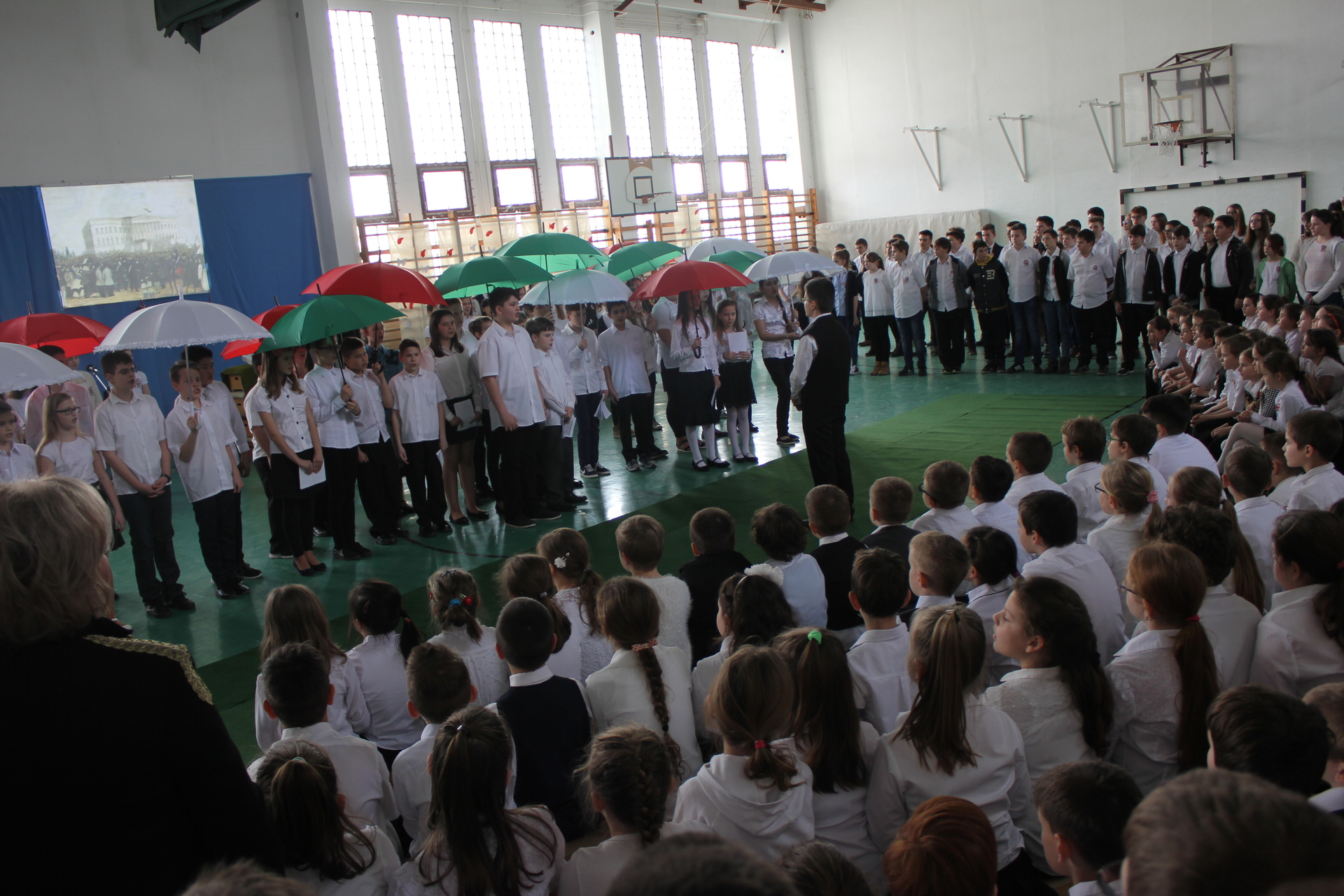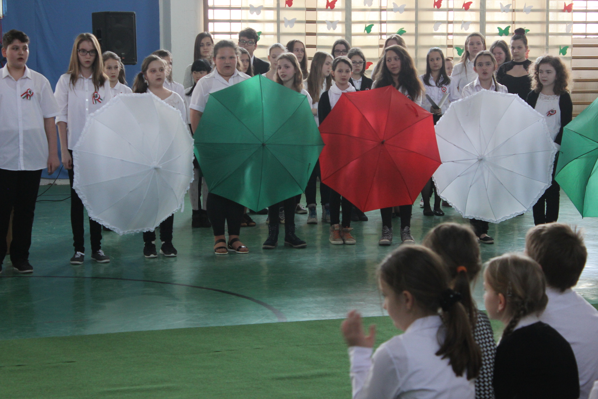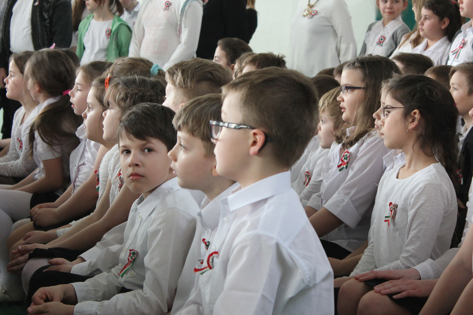 Az iskola minden diákja hivatalos volt a március 14-i, ebéd után kezdődő eseményre, melyre az intézmény sportterme is díszbe öltözött. A háttérben a márciusi ifjak kivetített fényképe és egy hatalmas kokárda volt látható.
