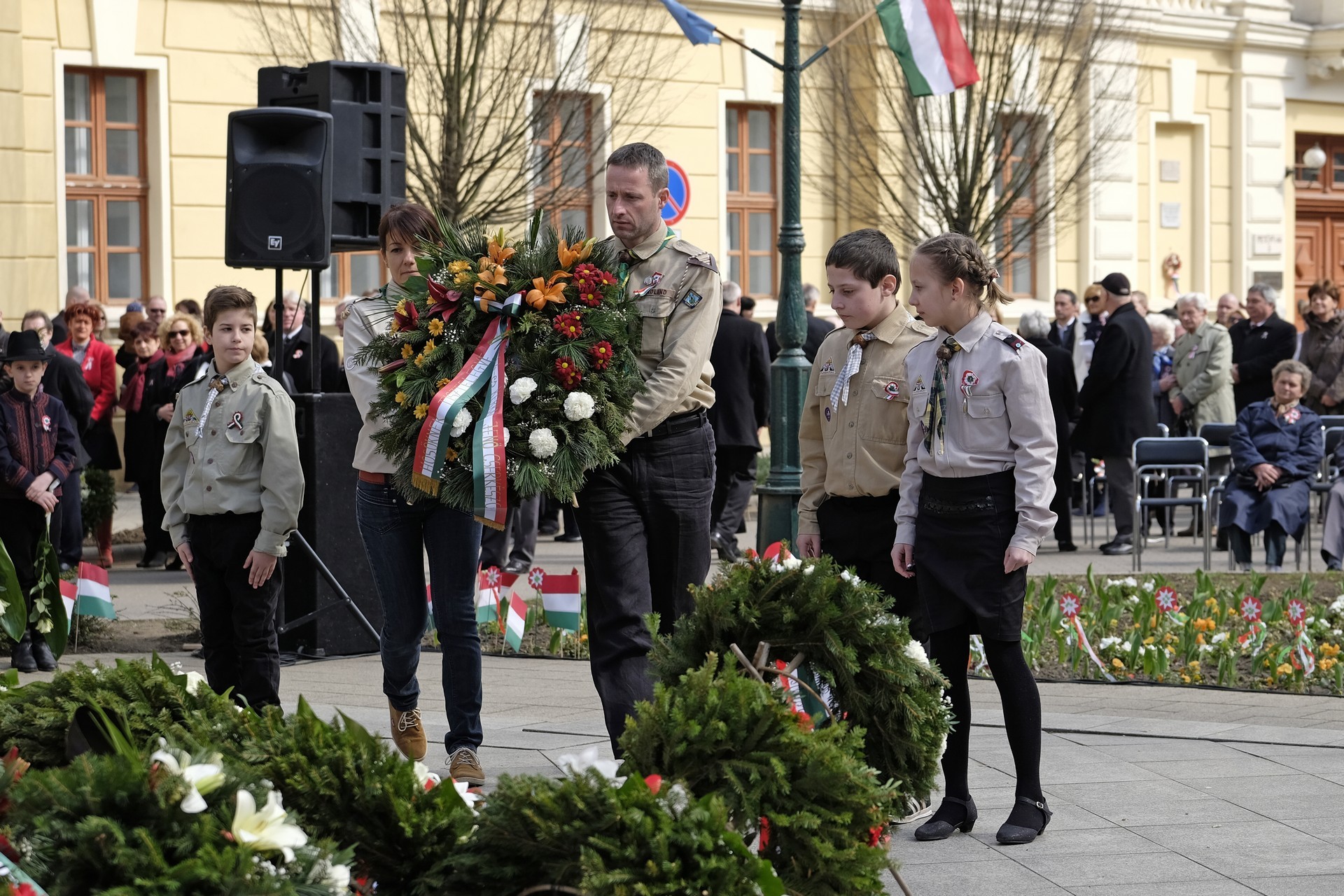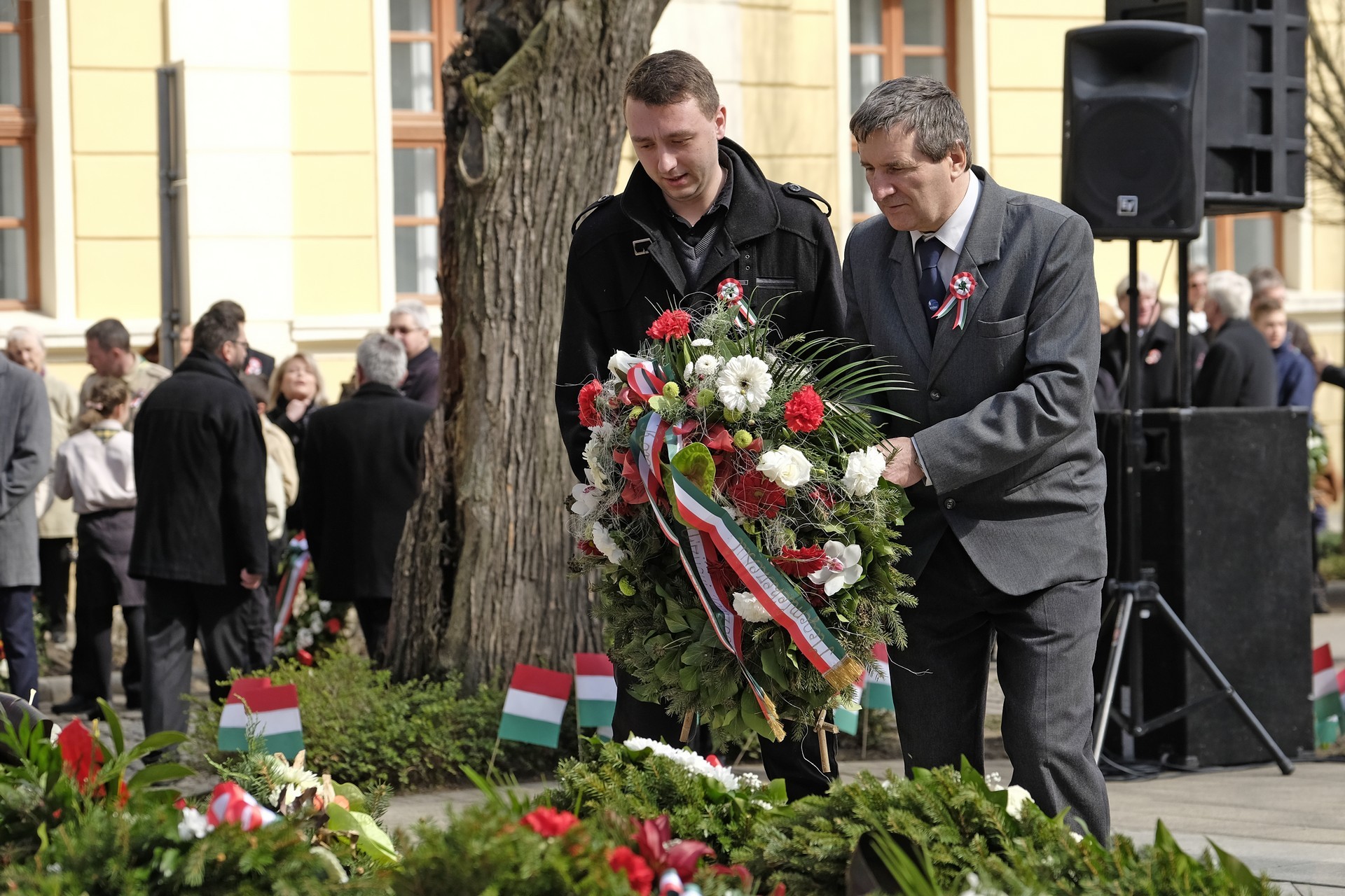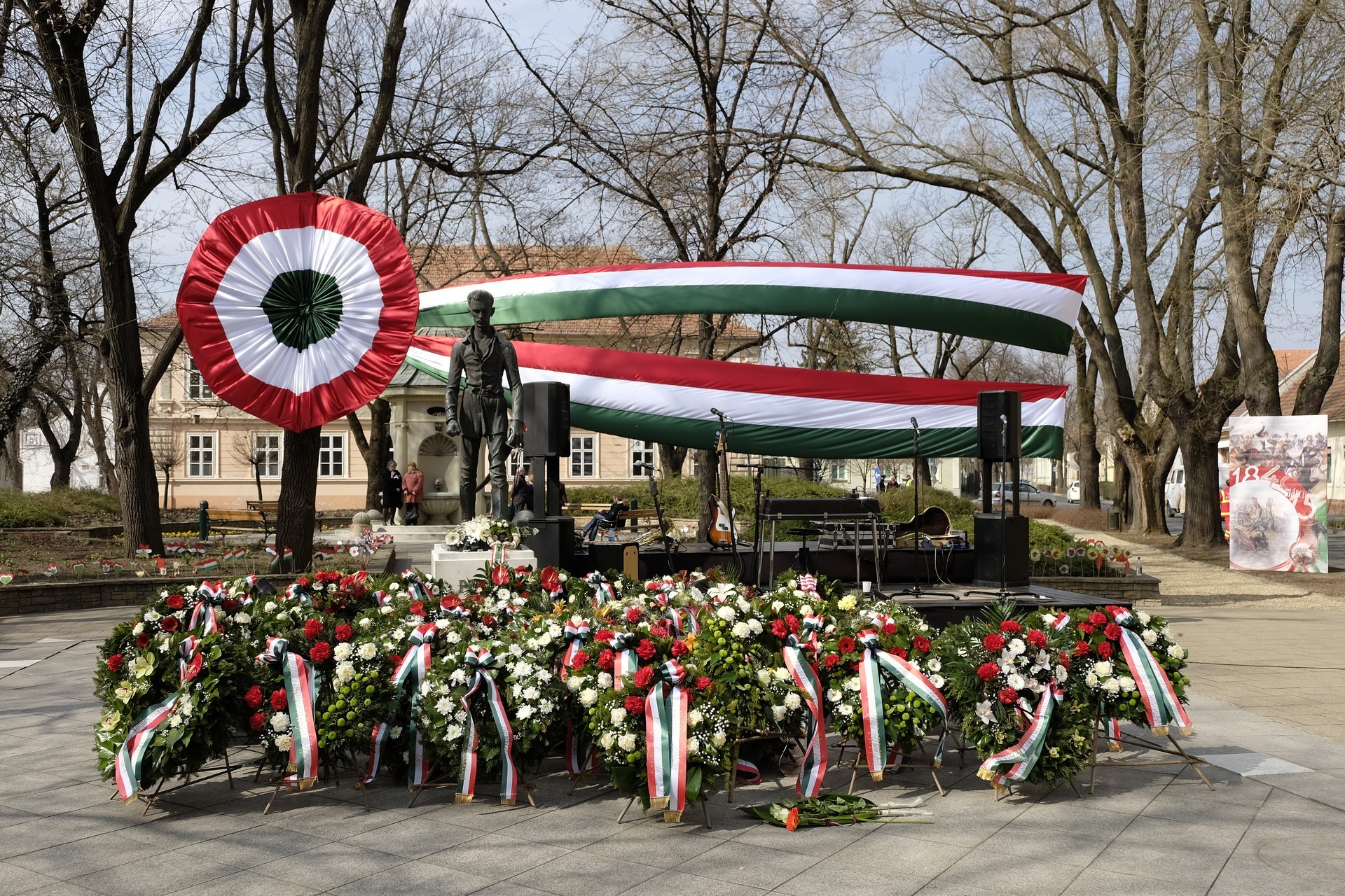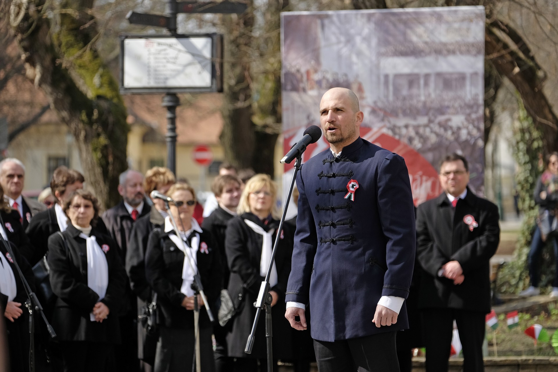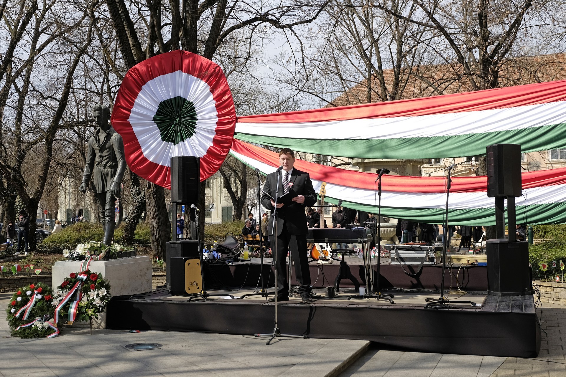 Viseljük büszkén azt az eszmét, amit a márciusi ifjak ránk hagyományoztak – hangsúlyozta ünnepi beszédében Hajdú András felvidéki hadtörténész Gyula város önkormányzatának Petőfi térre szervezett megemlékezésén.