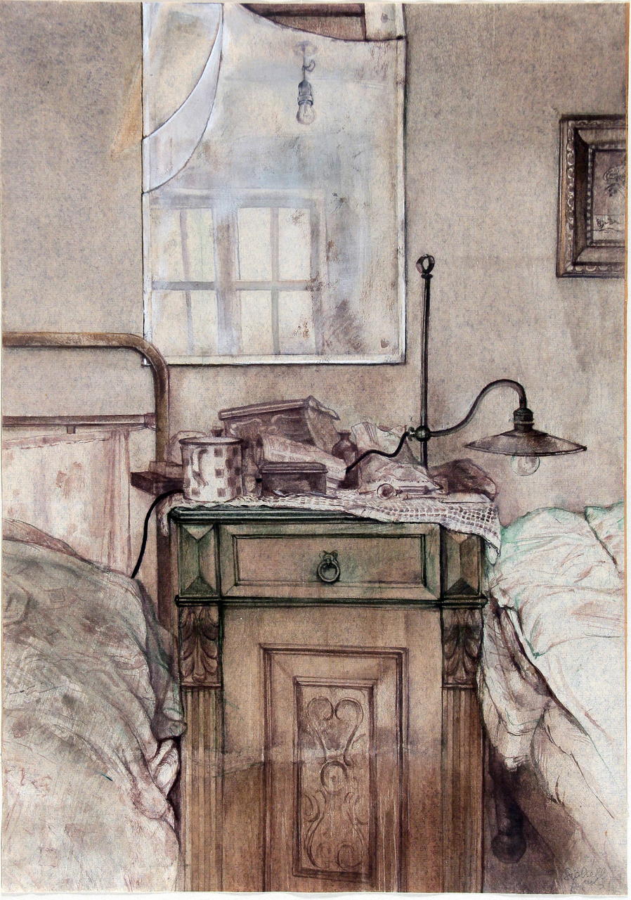Szakáll Ágnes: Egy magárahagyott éjjeliszekrény (szinezett ecsetrajz, 45x32 cm) – 1980