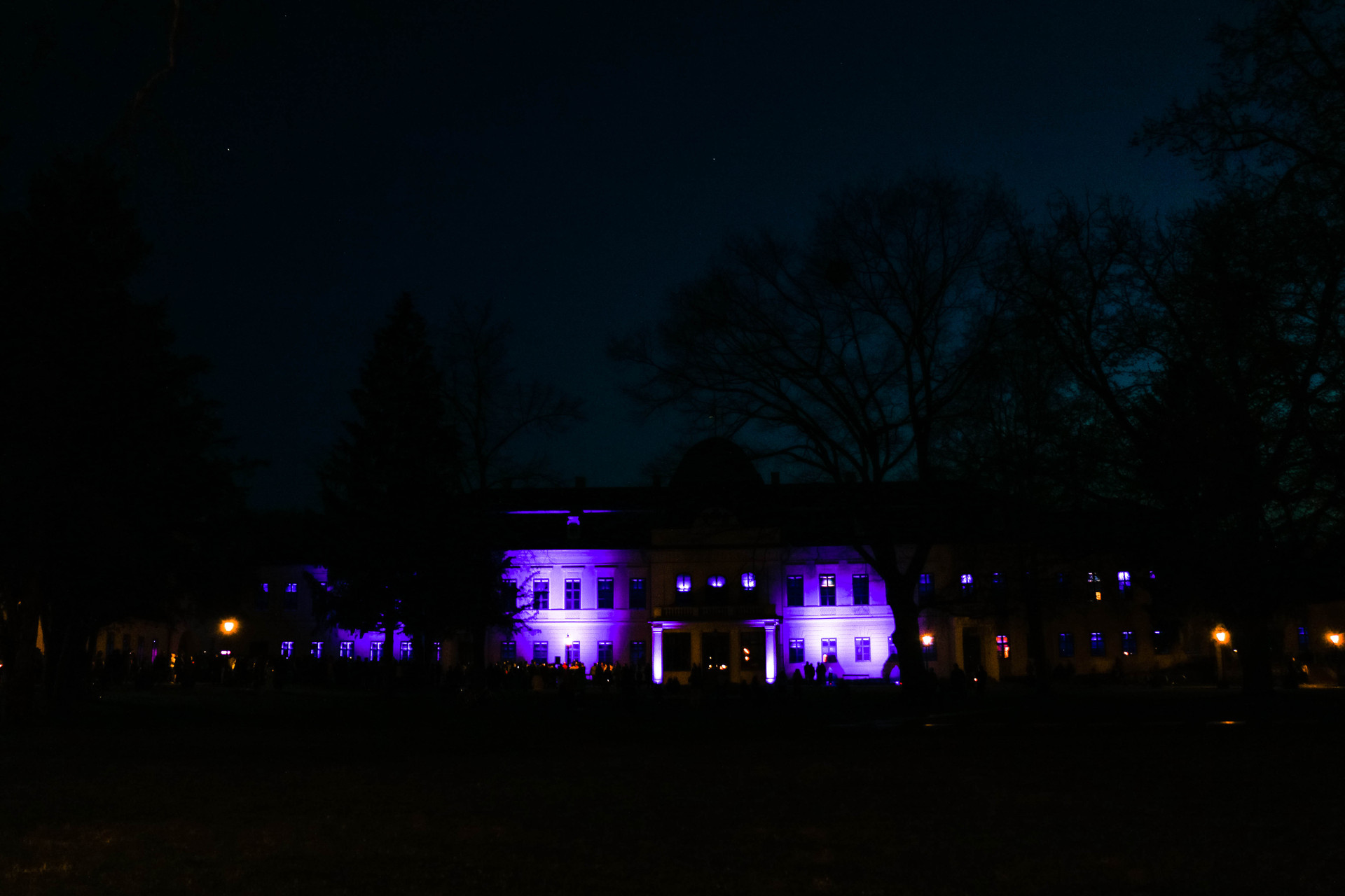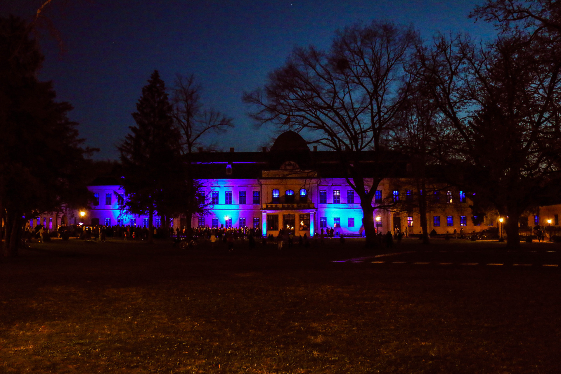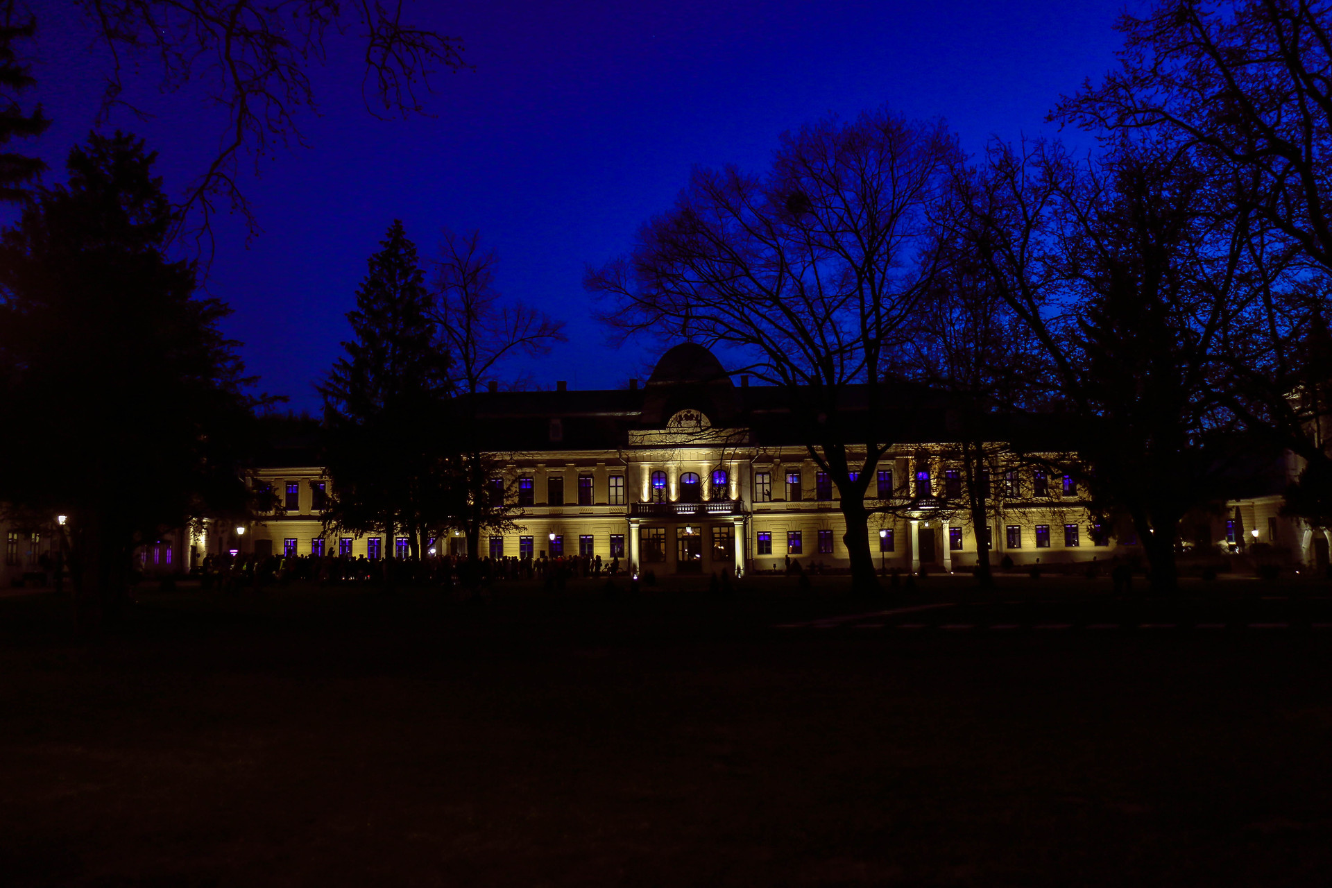 Az est végén kék fényárral tették figyelemfelkeltőbbé az Almásy-kastélyt.
