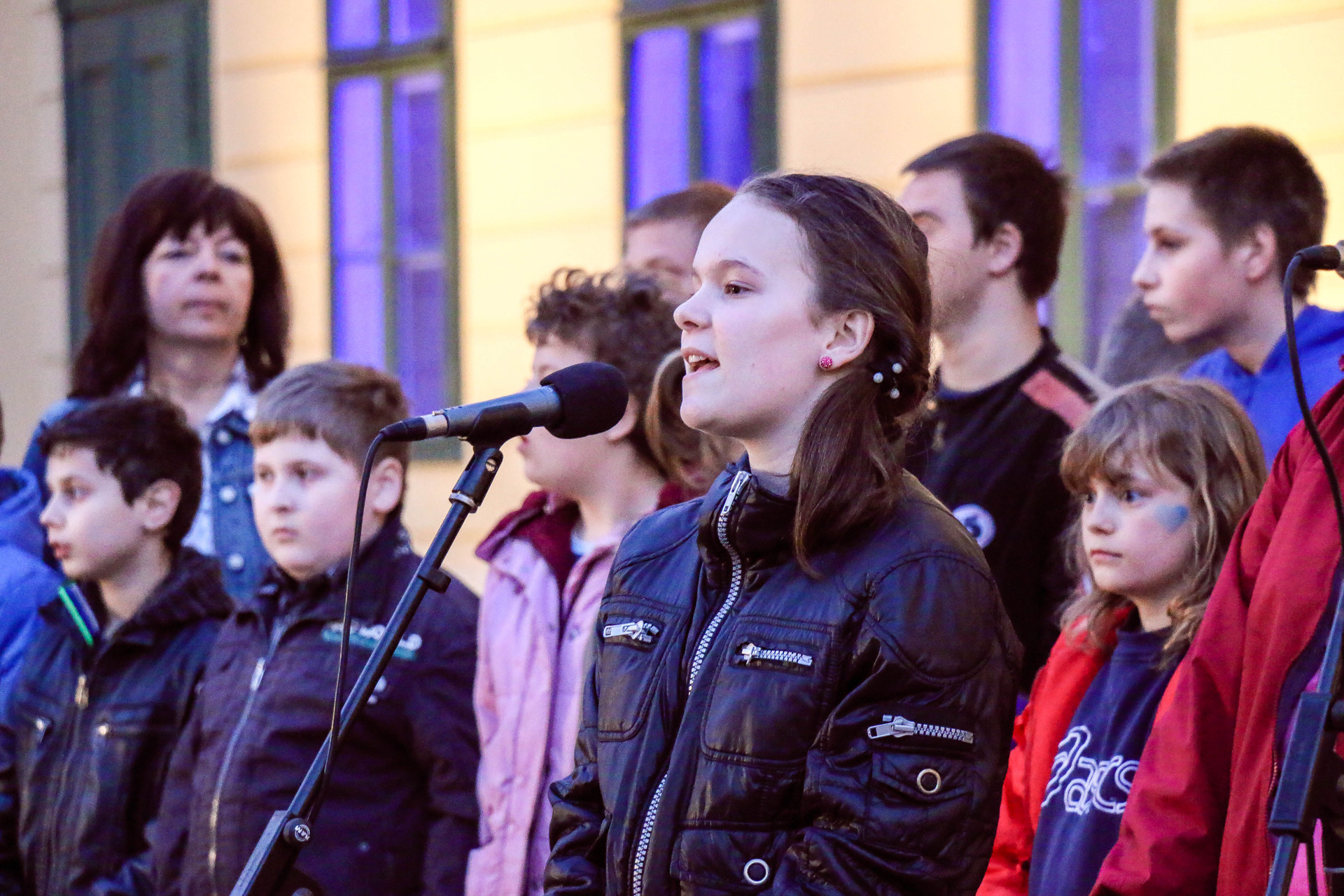 Az énekkar, a szólista és Gellén Gáborné pedagógus (balra, a háttérben)