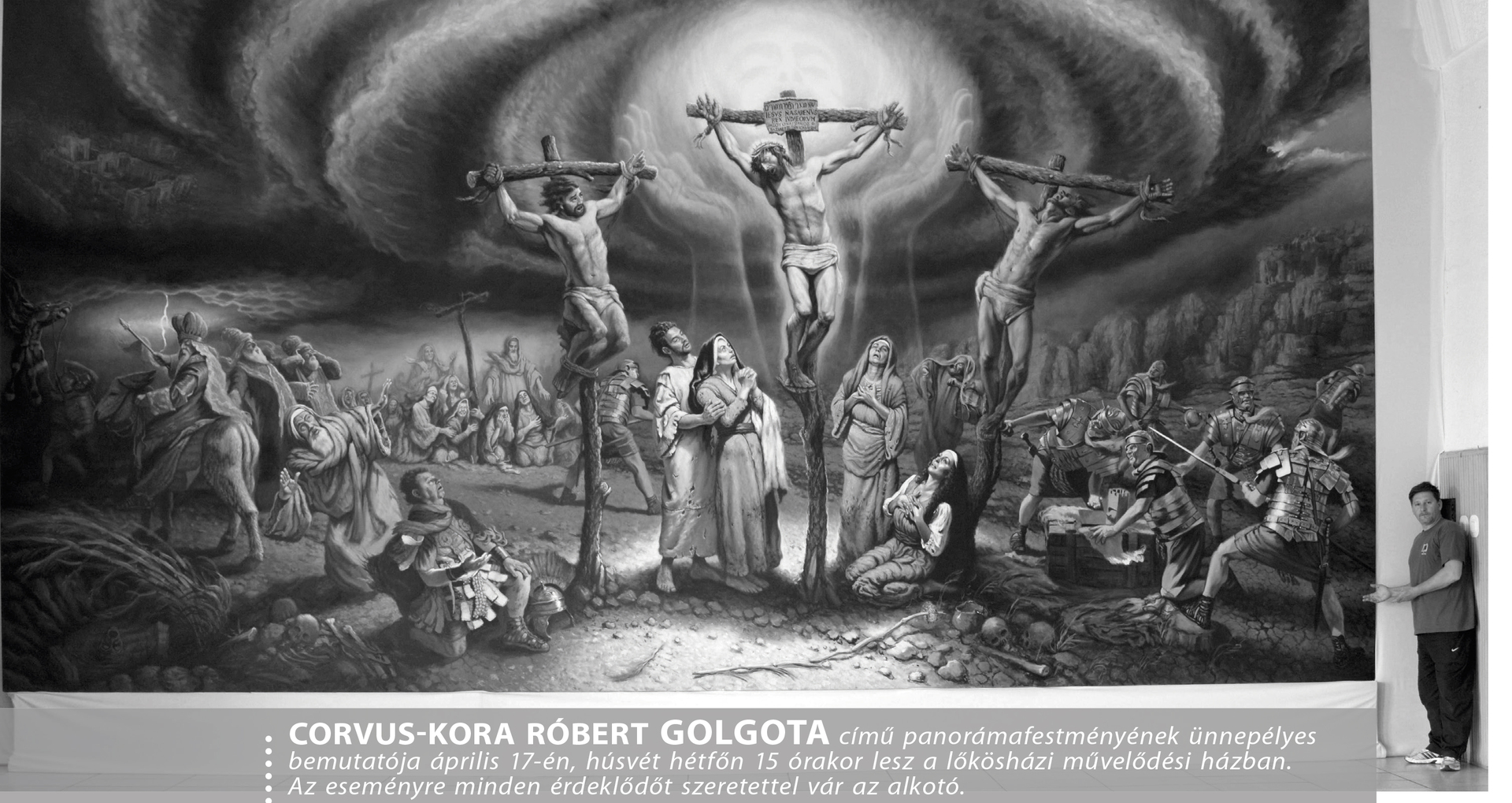 Ami a jövőt illeti, Corvus-Kora Róbert Attila legendáját, a Rákóczi-szabadságharcot és az 1956-os forradalmat is meg szeretné festeni. Ami pedig a jelent: most a legújabb, hetedik óriásművét ajánlja a művészetbarátok figyelmébe. A Golgota ünnepélyes bemutatója a lőkösházi művelődési ház nagytermében lesz húsvét hétfőn délután 3 órától. Az alkotó ugyanis ebben a Békés megyei községben él, és noha számos távoli vidékre eljutott már tanulmányútjai során, soha nem költözne el innen.