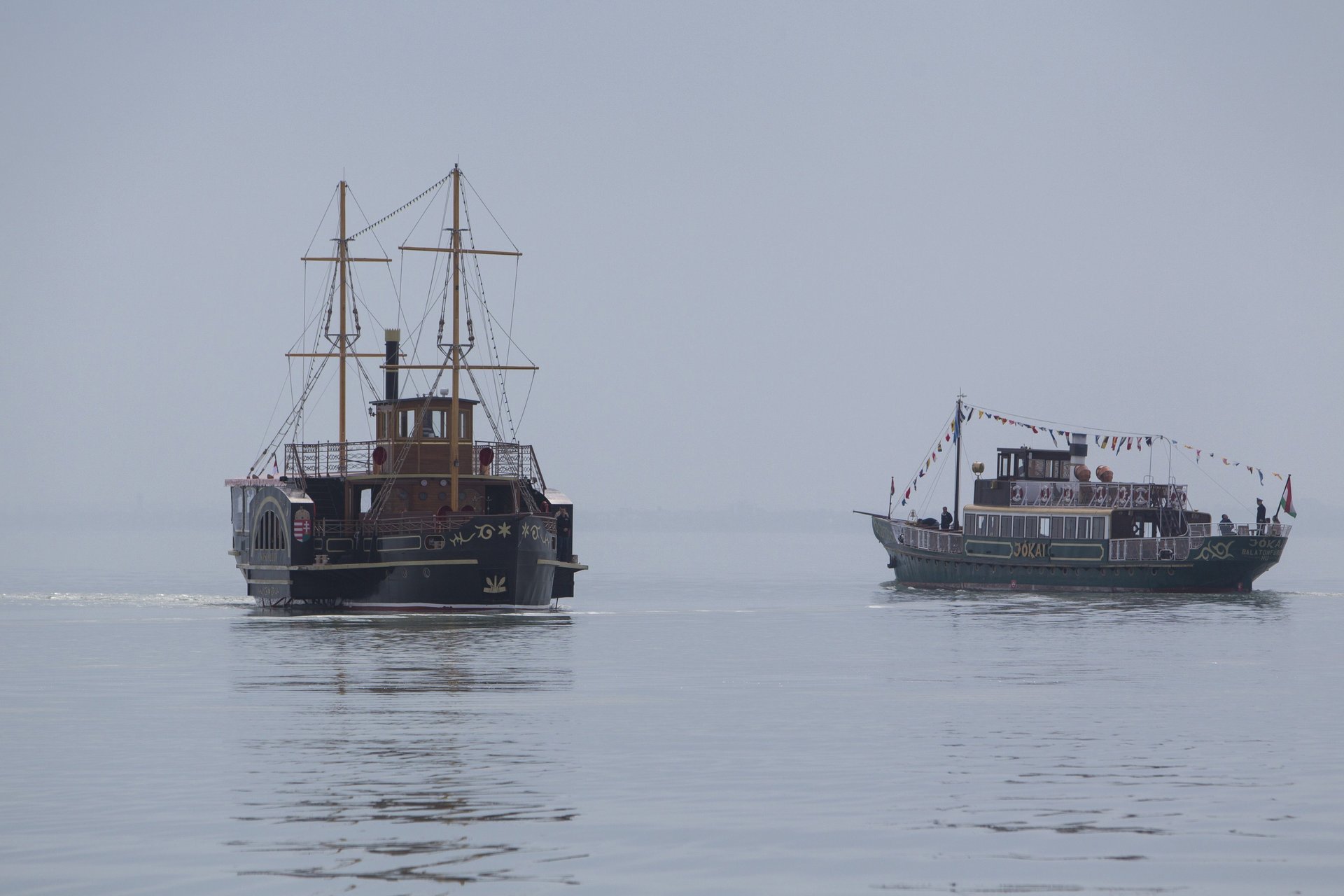 Az első képen az idény első hajója, a Nemzeti Regatta nevű motoros érkezik Siófokról a balatonfüredi kikötőbe a balatoni hajózási idény első napján, április 15-én. A második fotón a Kisfaludy és a Jókai hajó látható a balatonfüredi kikötőnél.