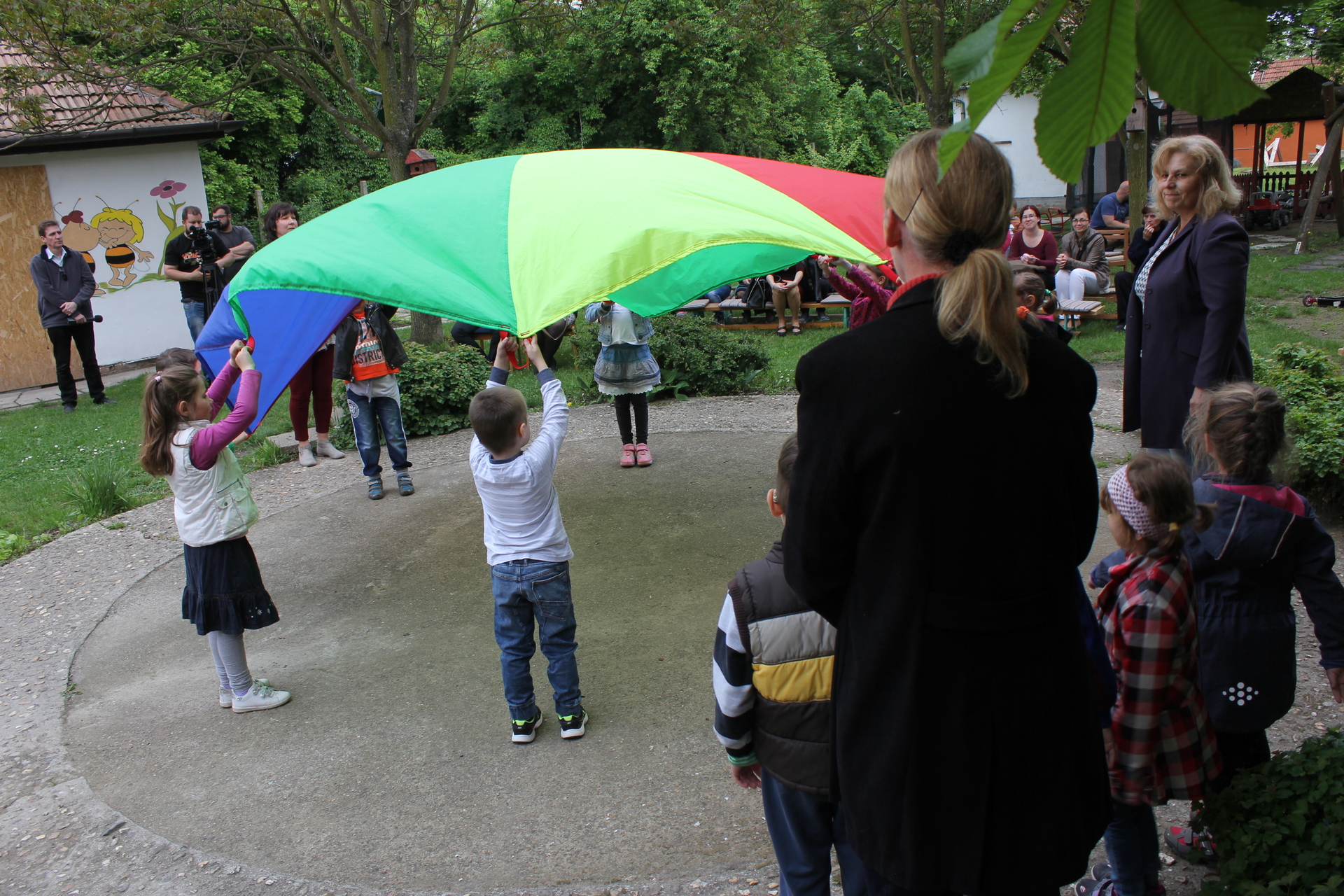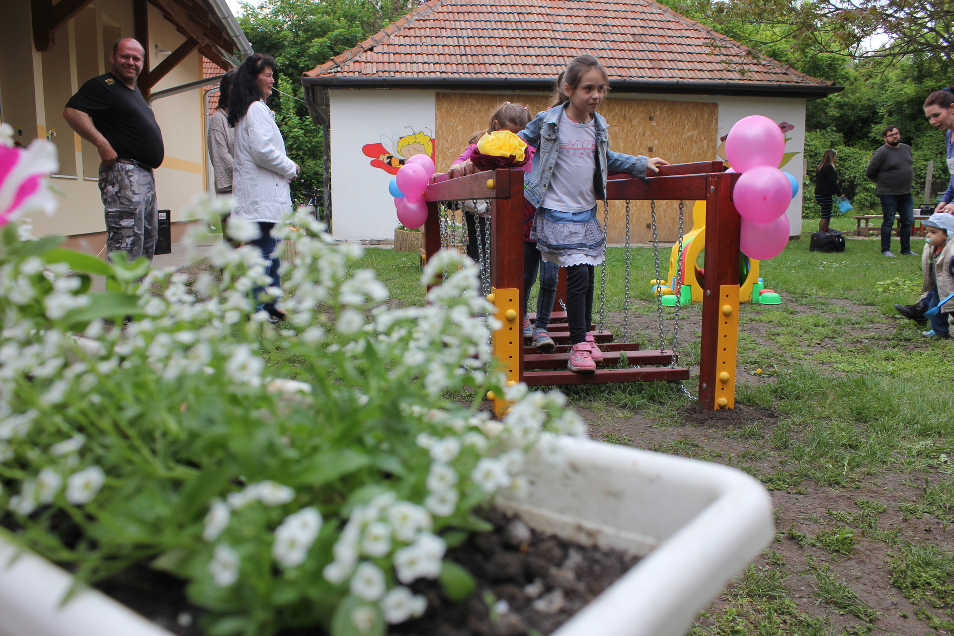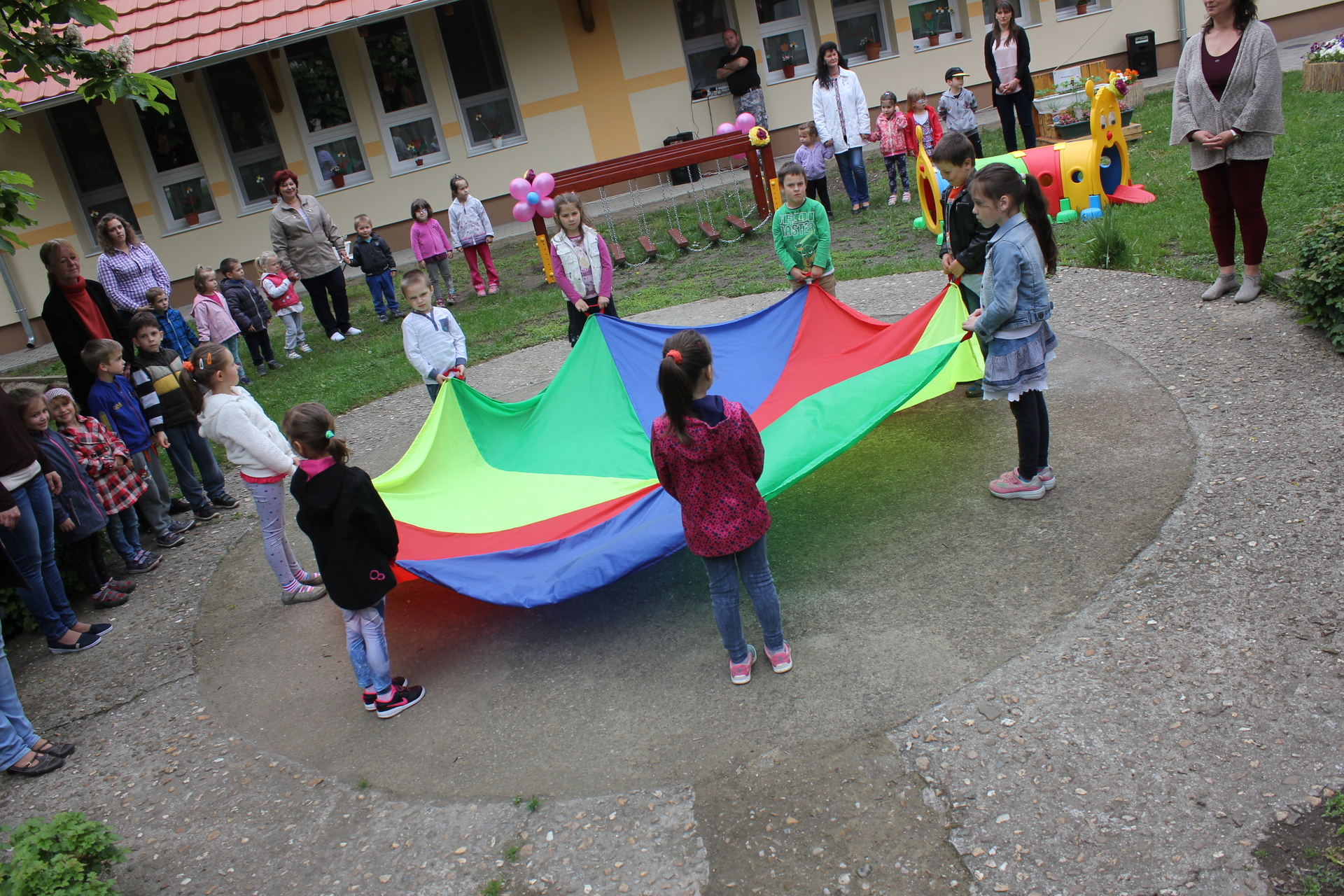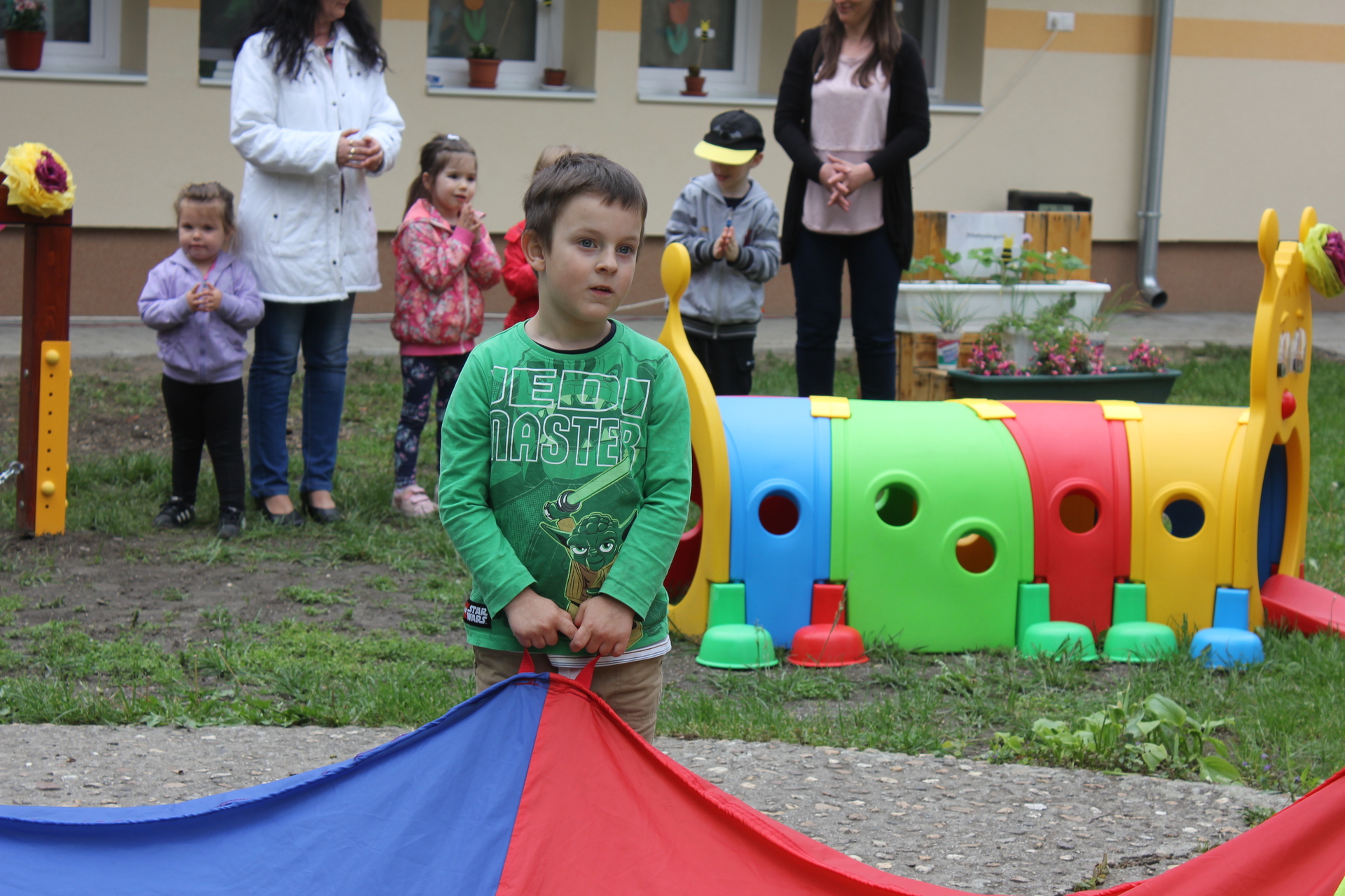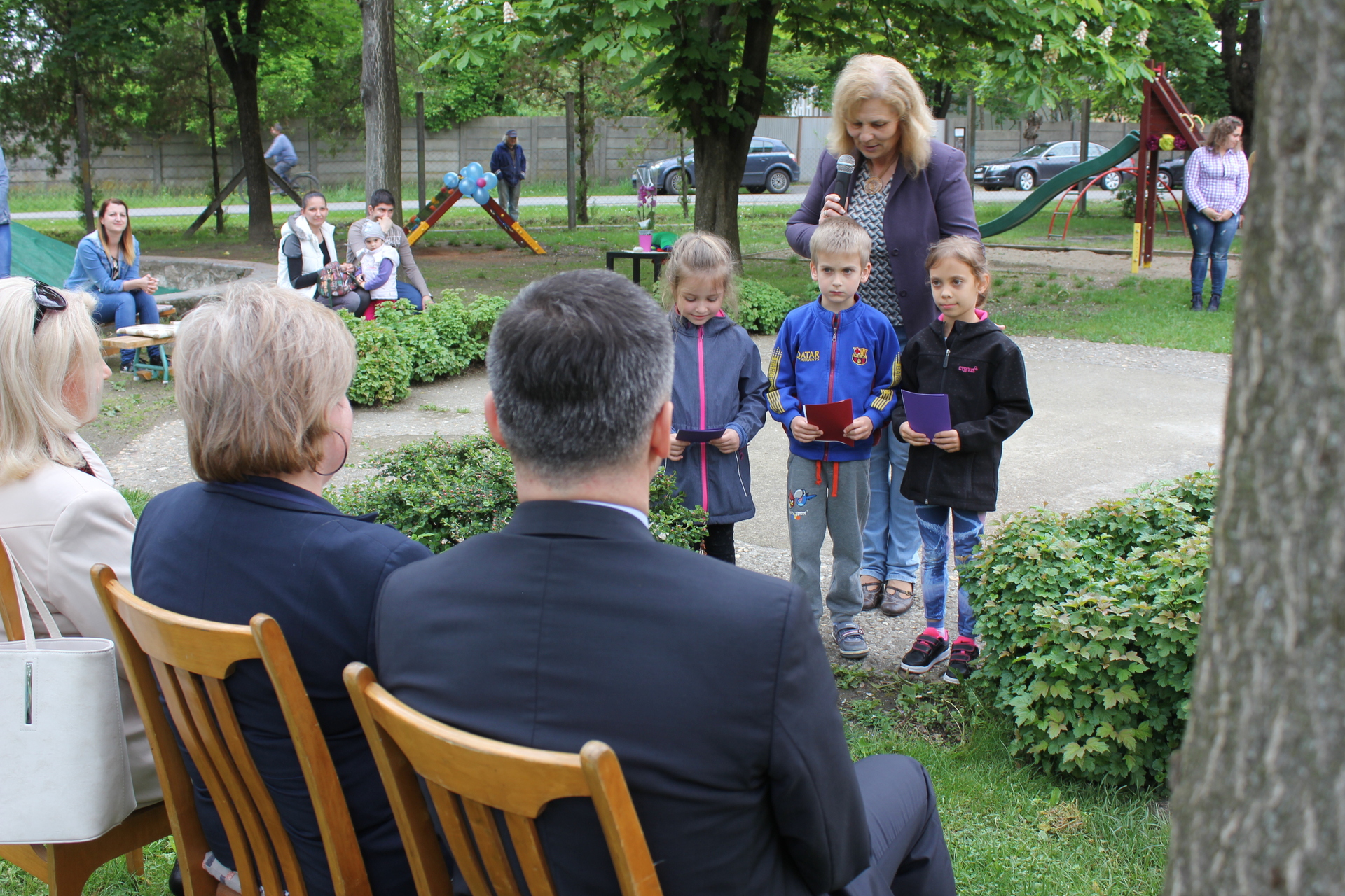 Az esemény az óvodások zenés műsorával indult, melyen a kicsik tavaszidéző, szivárványos játékot mutattak be, majd Kiss Tamásné köszöntötte a jelenlévőket. A választókerület képviselője üdvözlő gondolataiban azt hangsúlyozta, hogy a képviselői feladatokat elvállalni épp azt jelenti, hogy a hasonló helyzetekben segítséget nyújt az ember, és örömmel látja, hogy „új tulajdonosai” nagyon élvezik a játszóeszközöket.