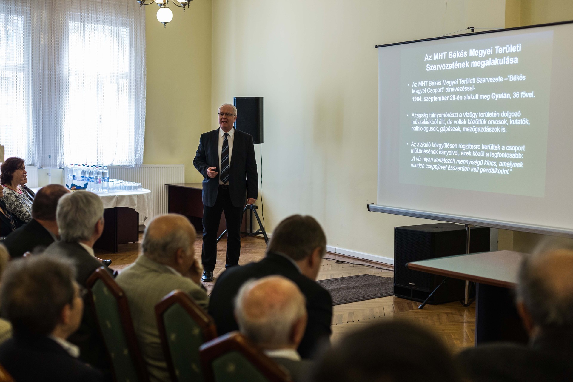 Réti László, a területi szervezet titkára előadásában elmondta: az MHT Békés Megyei Területi Szervezete – Békés Megyei Csoport elnevezéssel – 1964. szeptember 29-én alakult meg Gyulán 36 fővel. A szervezet létrehozásának célja olyan szakmai szervezet és vitafórumrendszer megalkotása volt, amely a fővárosi és a nagyvárosi tudományos intézményektől, a rangos tervező, kivitelező vállalatoktól távol segíti az aktuális vízgazdálkodási kérdések komplex, magas színvonalú elemzését, a szakmai ismeretterjesztést, a tagság szakmai fejlődését, valamint megvalósítja a szakmai utánpótlás-nevelést. A megyei területi szervezet az elmúlt csaknem 53 év alatt mintegy kétszáz előadást, kilenc ankétot, hat konferenciát, hat bemutatót, számos filmvetítést és kiállítást, valamint tizenöt szakmai tanulmányutat szervezett.