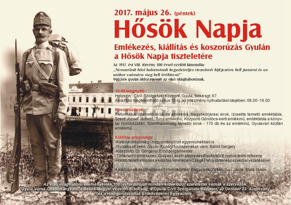 Köszöntőt mond Görgényi Ernő, Gyula város polgármestere és Gulyás László alezredes, a Békés Megyei Védelmi Bizottság honvédelmi referense. A kiállításhoz kapcsolódóan Czégé Petra levéltáros tart a előadást.