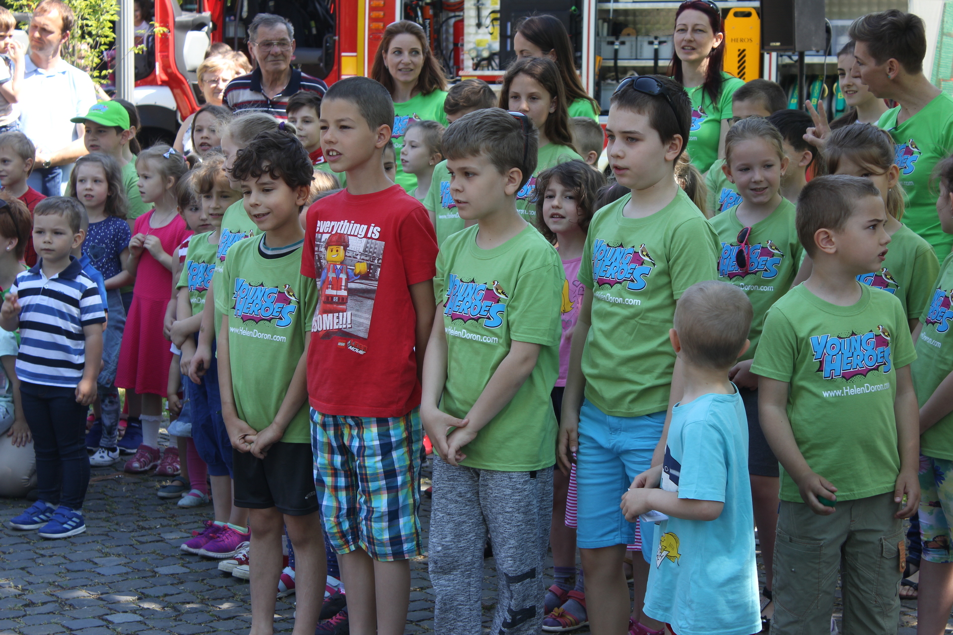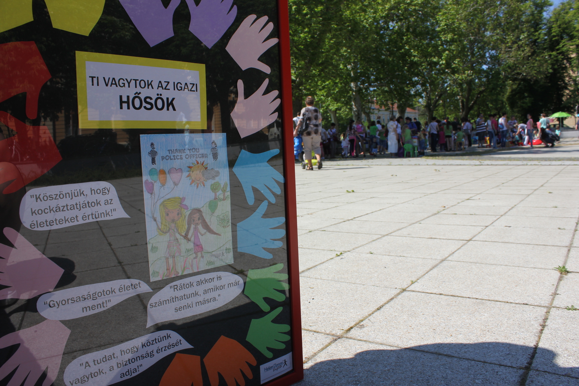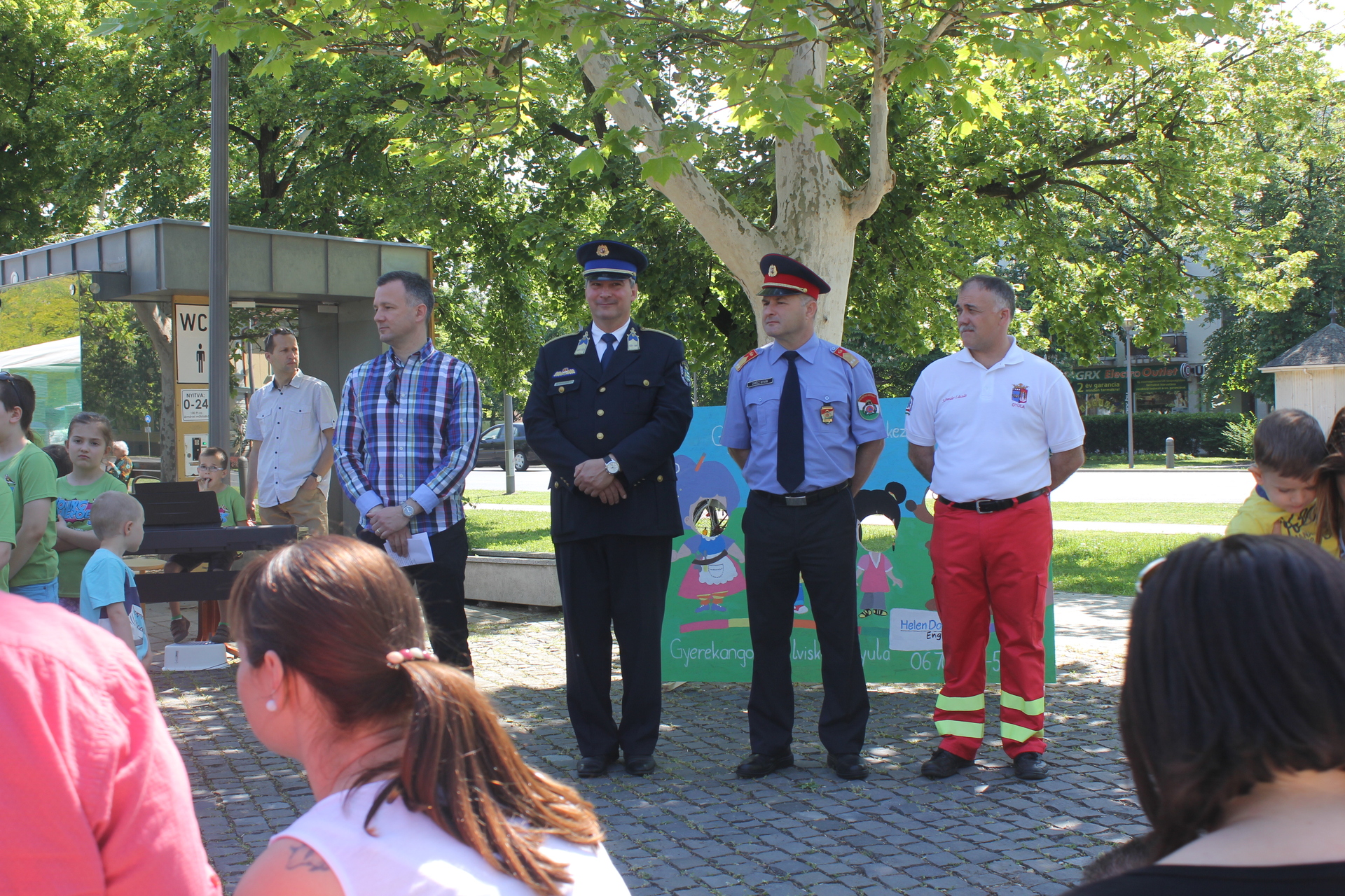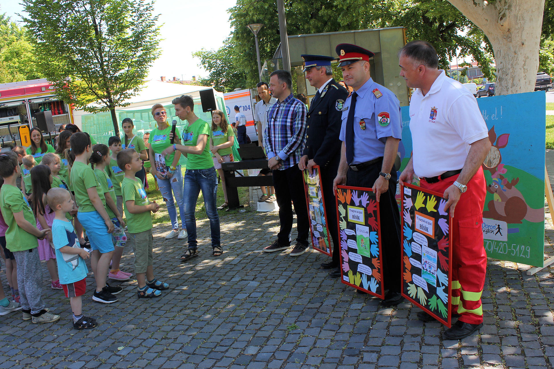 A köszöntő után az iskola tanulói rajzaikkal ajándékozták meg a helyi mentők, rendőrök és tűzoltók képviselőit: Zanócz István tűzoltóparancsnokot, Schneider Lászlót, a helyi mentőállomás vezetőjét és Kolysza Zoltán rendőr alezredest. A nebulók egy dalt is előadtak a hétköznapok hőseinek. A móka délig folytatódott a Kossuth téren.