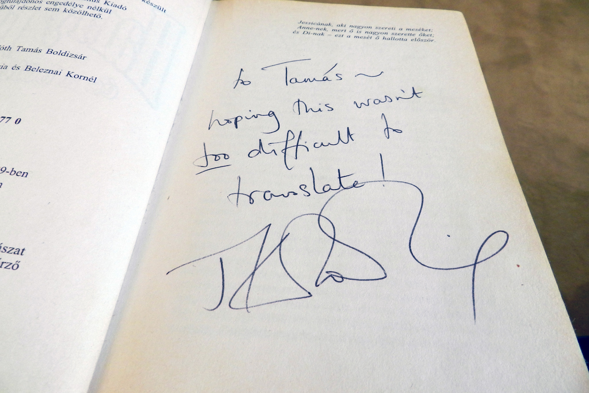 A fordító a Harry Potter és az azkabani fogoly című harmadik könyvet nevezte meg kedvencének. Kiemelte, hogy gyorsan és könnyen tudott vele dolgozni, valamint a legjobban megírt résznek tartja. J. K. Rowling-gal, a sorozat írójával nem tudott találkozni, habár kétszer is majdnem sikerült: először az első film londoi bemutatóján voltak közel egymáshoz, később Lipcsébe látogatott az írónő, amikor Tóth Tamás Boldizsár ott dolgozott, de abban az időben kellett hazautaznia. Öröm az ürömben, hogy a felesége által sikerült egy aláírást szereznie.