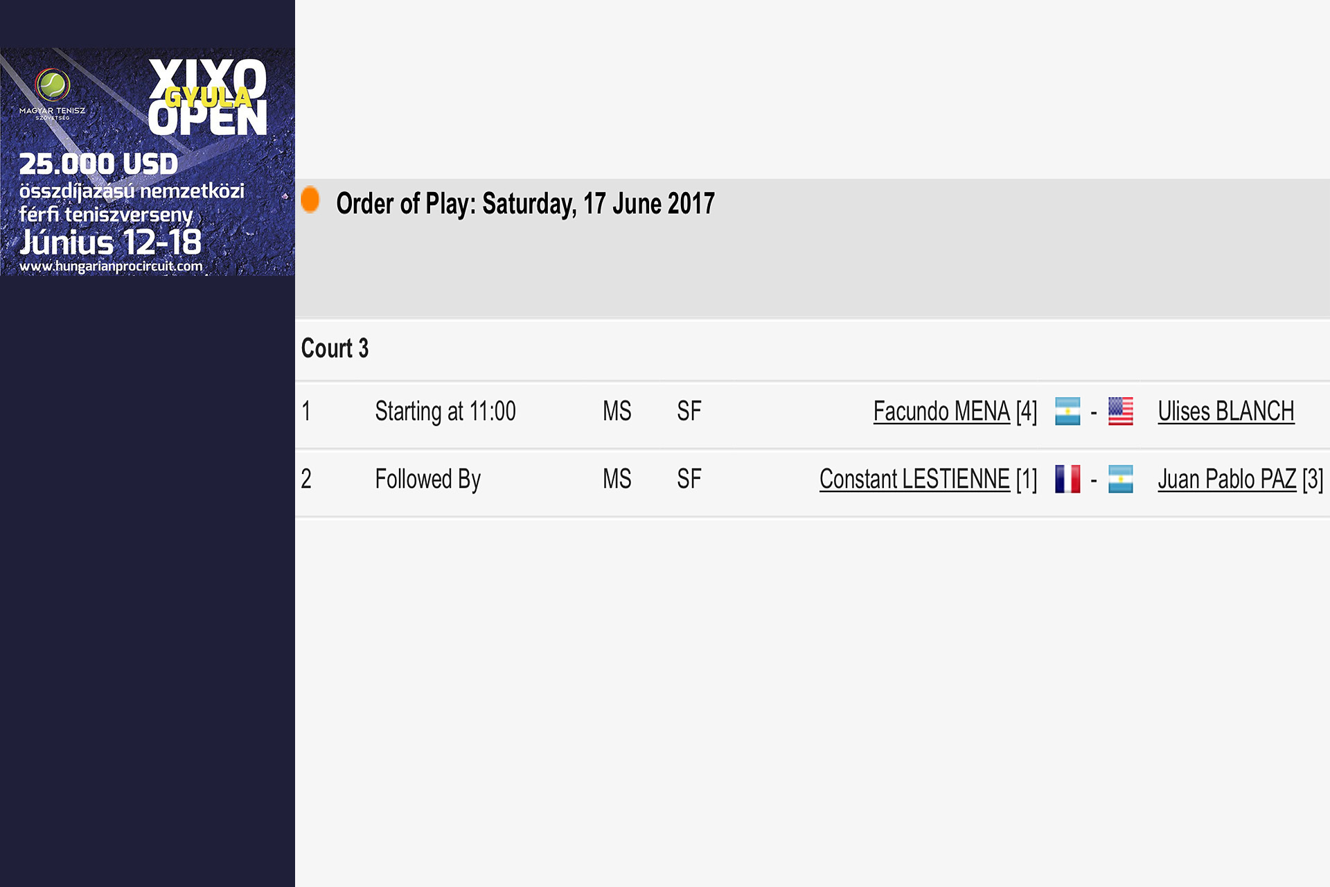 A gyulai Id. Christián László Sporttelep pályáin zajló 25 ezer dolláros profi teniszverseny pénteki játéknapján nem jártak szerencsével a magyarok: Valkusz Máté a francia Constant Lestienne-től, míg Gödry Levente és Nagy Péter a szerb Nikola Cacic és az ausztrál Scott Puodziunas alkotta kettőstől kapott ki. Az elődöntők ma délelőtt 11 órakor kezdődnek. Az argentin Facundo Mena az amerikai Ulises Blanch ellen lép pályára, Constant Lestienne pedig az argentin Juan Pablo Paz ellen csatázik.