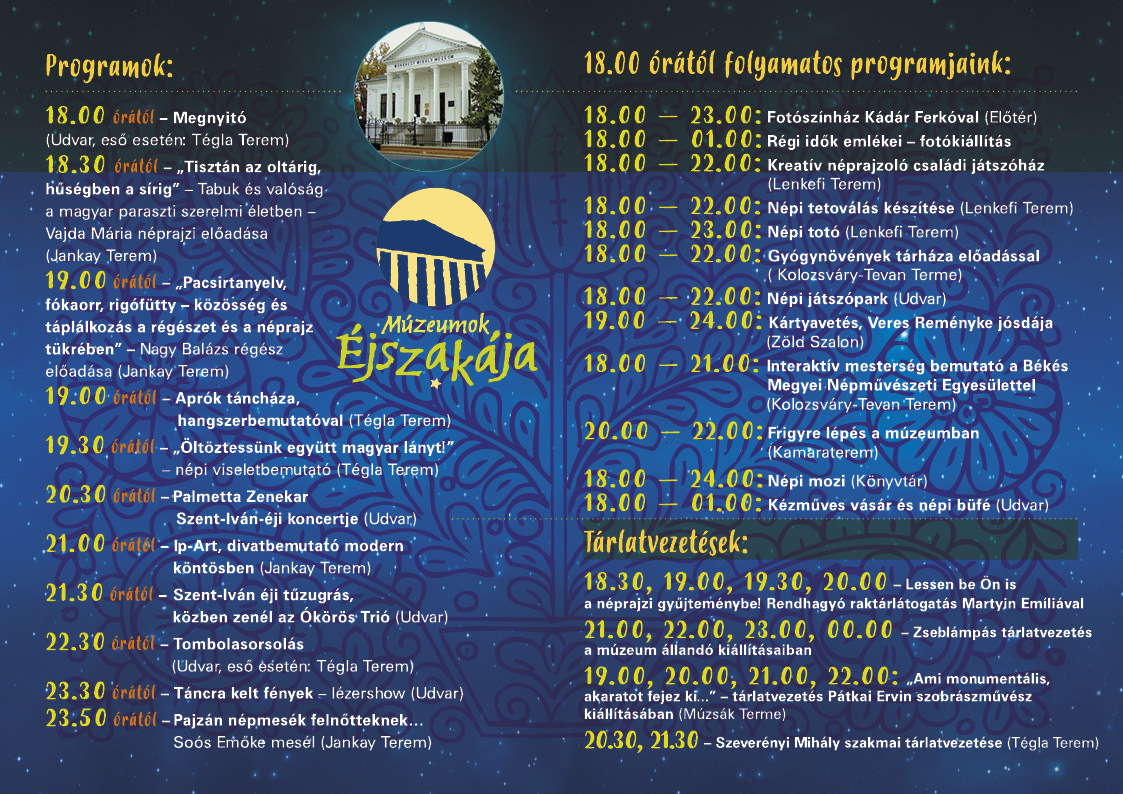 A rendezvény 18 órakor kezdődik, és egészen éjjel 1 óráig tart. Ezalatt az idő alatt a betérők részt vehetnek az állandó tárlatvezetéseken, így megtekinthetik a néprajzi gyűjteményt, szakmai tárlatvezetésen járhatják be a Tégla Termet Szeverényi Mihállyal, valamint zseblámpával is körbemehetnek a múzeumban.