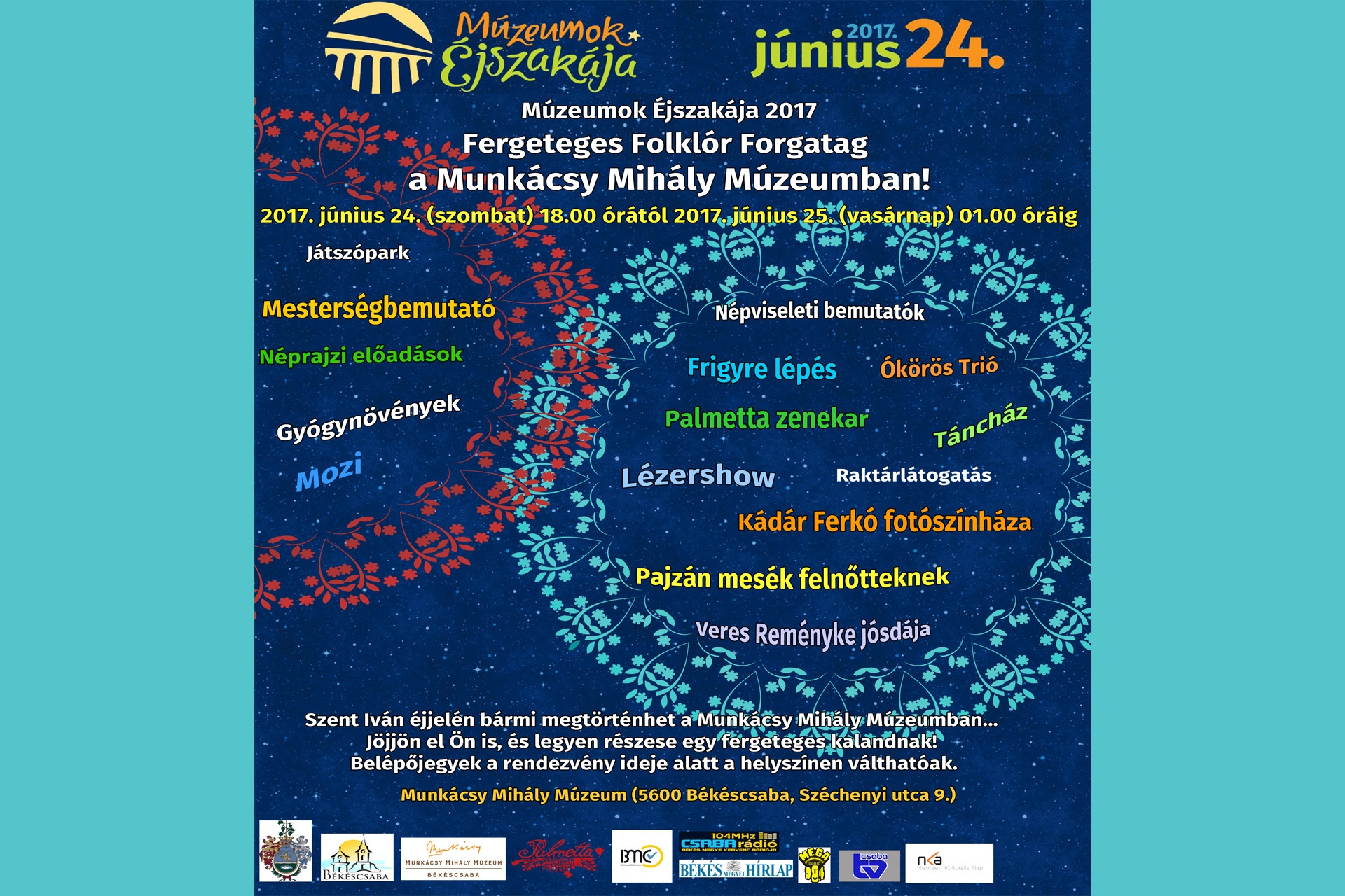 Az este folyamán a Palmetta zenekar és az Ókörös Trió zenél, lesz lézershow és divatbemutató, a felnőtteknek pedig Soós Emőke fog pajzán népmeséket mondani a Jankay Teremben.