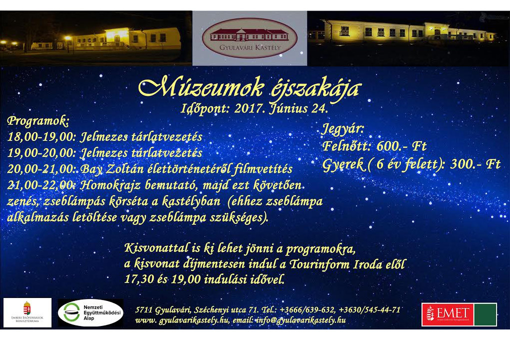 A kastély dolgozói kétszer is tartanak jelmezes tárlatvezetést, majd Gyula egyik híres szülöttének, Bay Zoltánnak az életével is megismerkedhetnek az érdeklődők egy filmvetítés keretében. 21 órától homokrajz-bemutatót láthatnak a vendégek, majd zenés kísérettel, zseblámpával tehetnek sétát a kastély épületében.