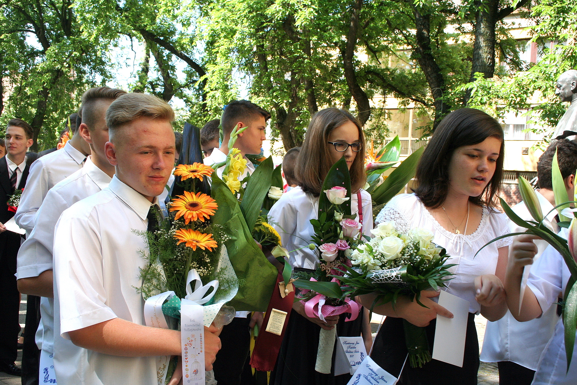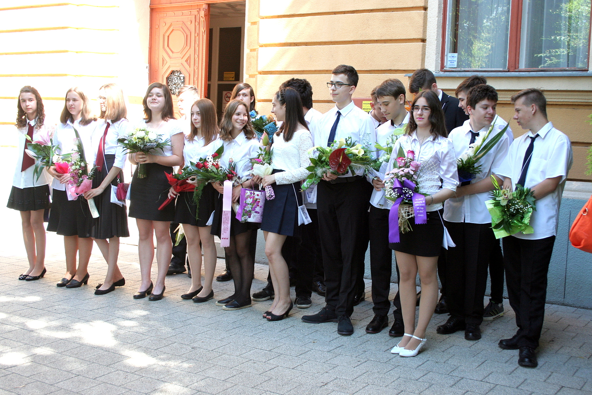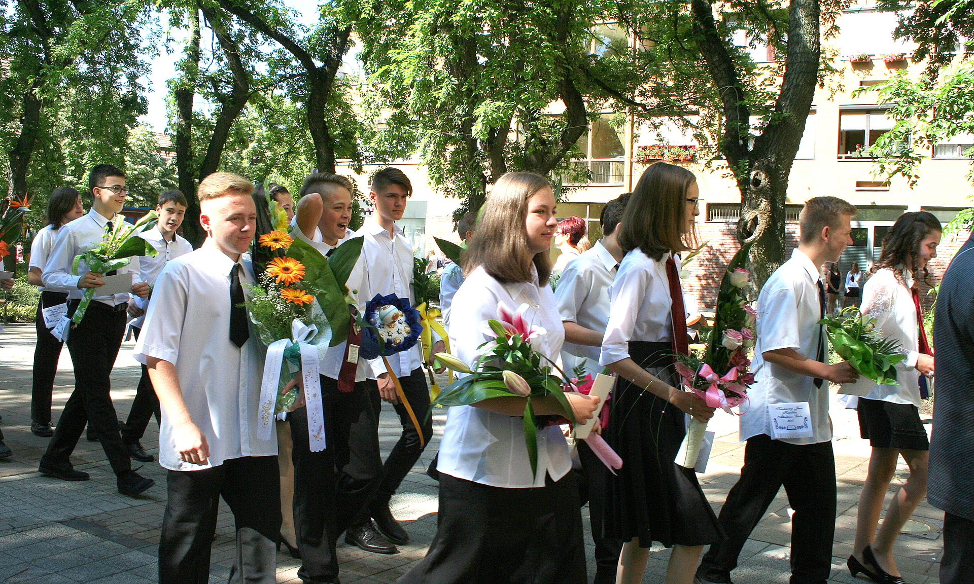Mosolygós ballagók a Karácsonyi János katolikus iskola előtt
