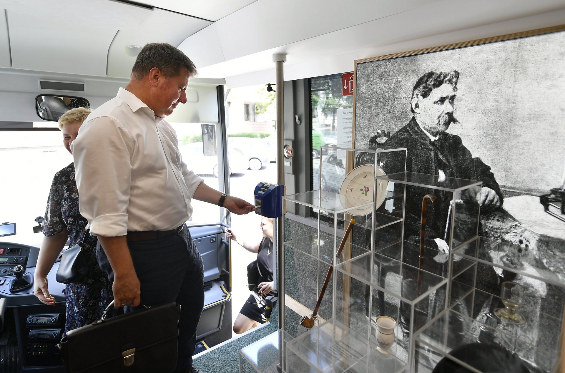 Szilágyi Judit, a kiállítás kurátora kiemelte, a járművön a PIM Önarckép álarcokban című Arany-kiállításának digitális tartalmai is megtalálhatók, köztük a Toldi erőpróba videojáték, és az az interaktív térkép, amely az ünnepelt költő életének állomásait, utazásait, kultuszhelyeit jeleníti meg, és valójában egy alkalmazás.