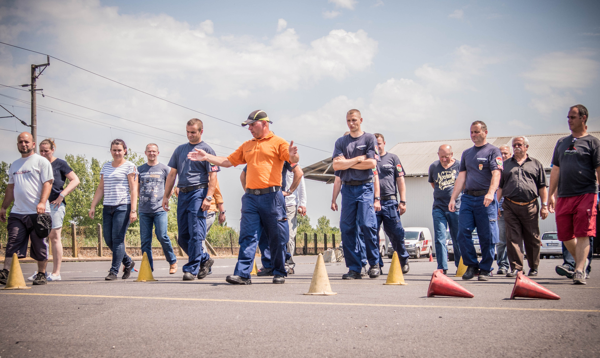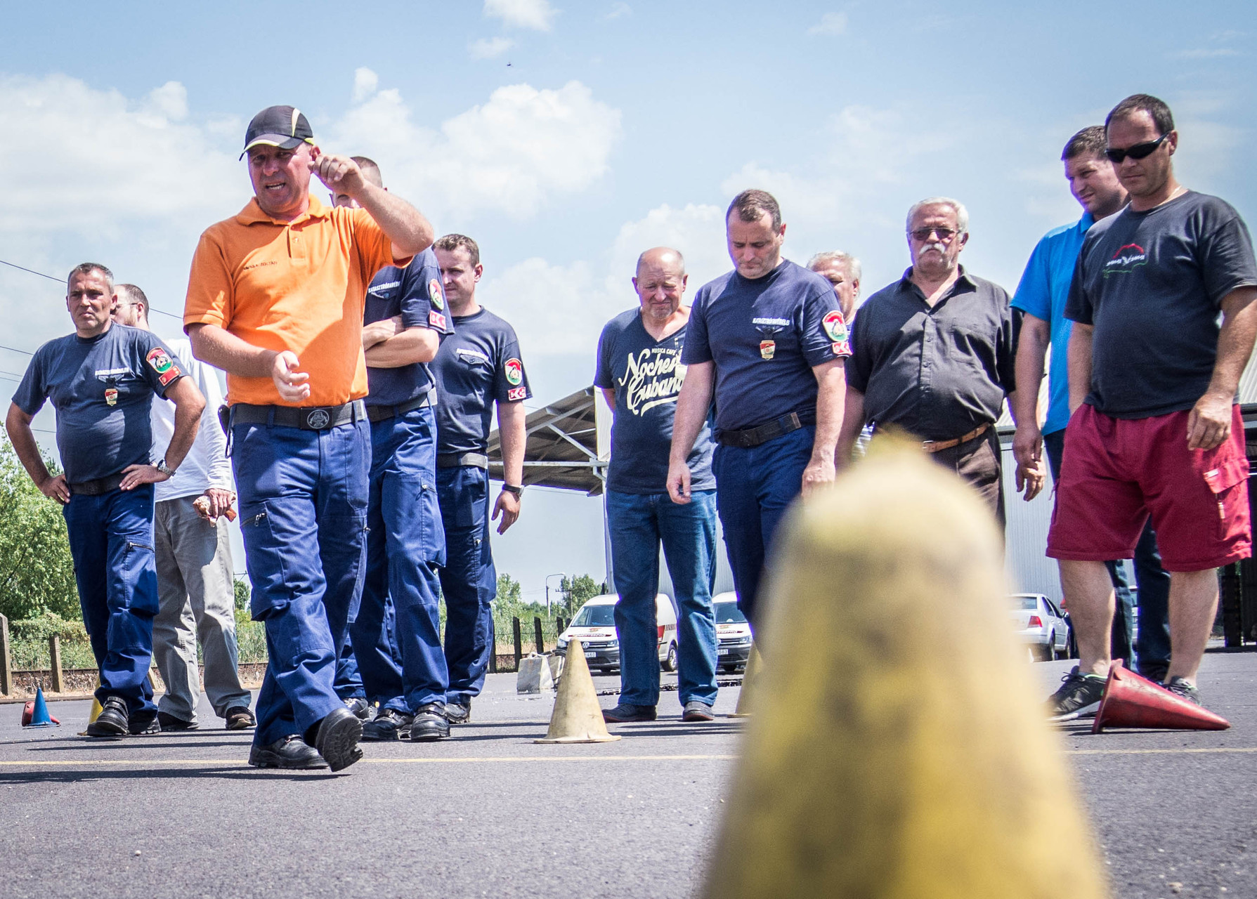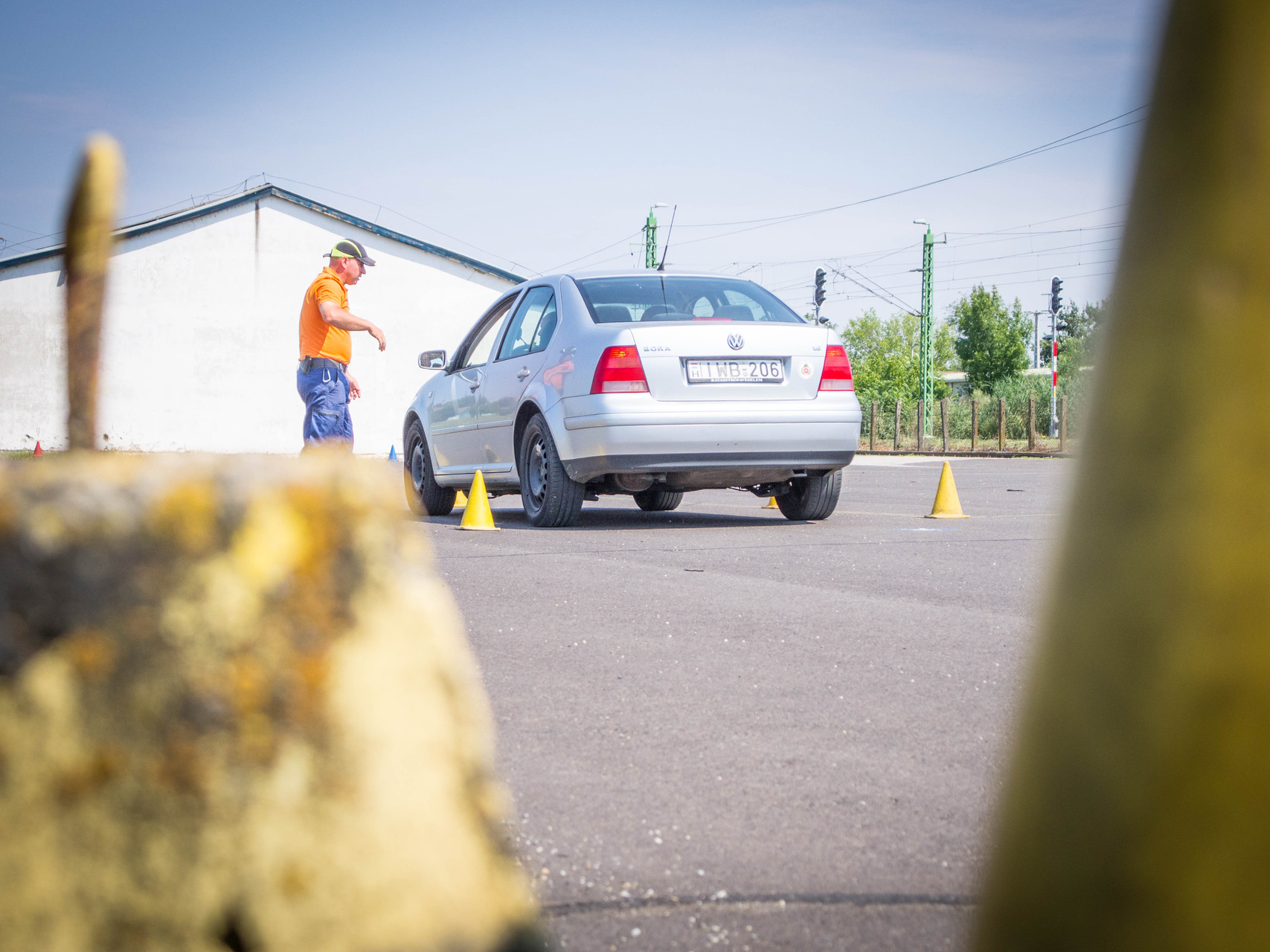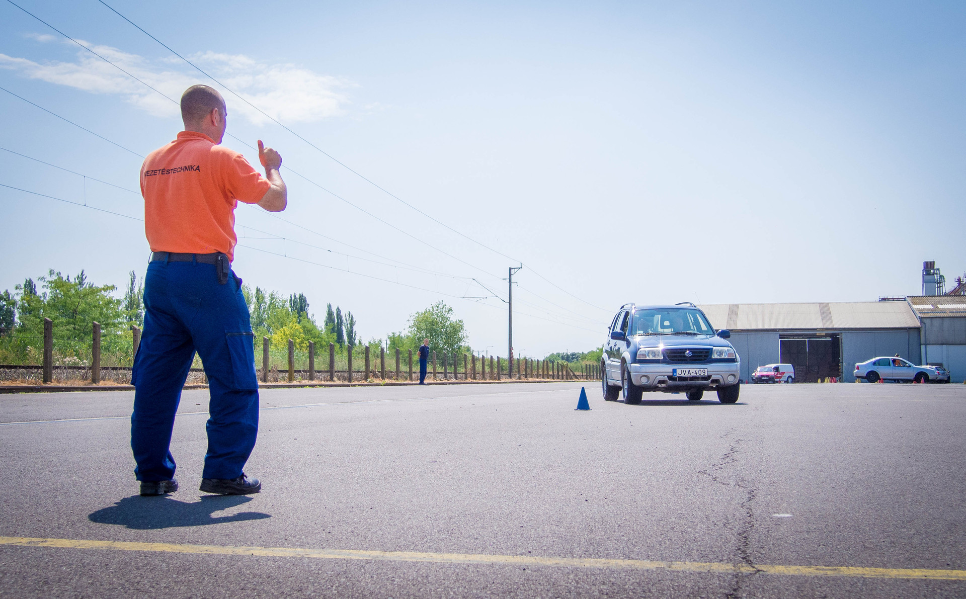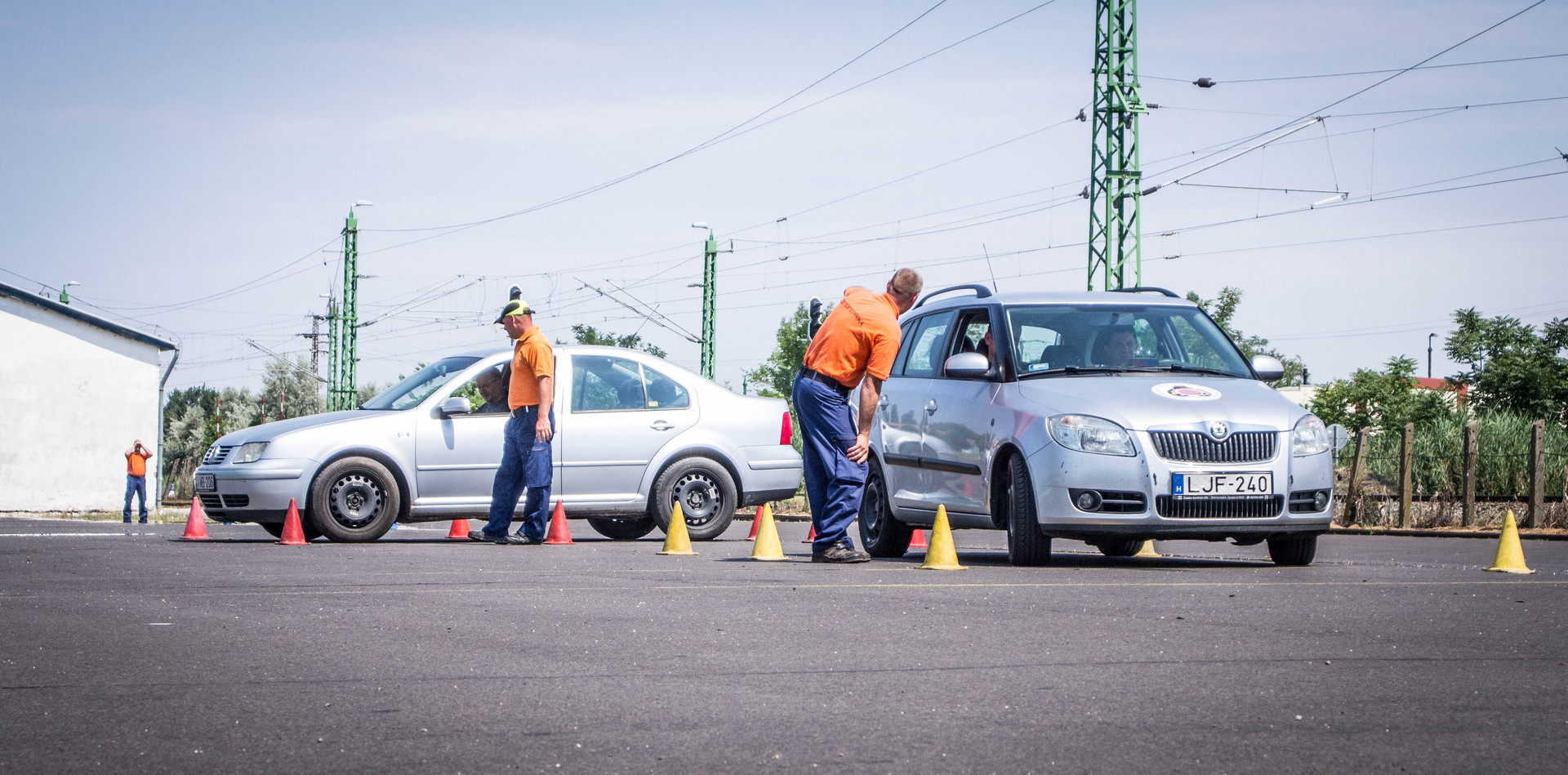 Ezek a fiúk egész héten itt vannak, napi húsz emberrel foglalkoznak átlagban ezen a tanpályán. Hogy milyen apropóból? A 16/2013 (V.28) BM-utasítás alapján, mely a hivatásos katasztrófavédelmi szervre is vonatkozik, szolgálati gépjárműveket csak olyan személy vezethet, aki megfelel egy alapszintű vezetéstechnikai vizsgán. Ennek keretében zajlik ország szerte az oktatás, melyen több ezer főnek kell részt vennie. A rendelet alapján ide tartoznak a katasztrófavédelem hivatásos, valamint kormánytisztviselői és közalkalmazotti, valamint munkavállalói állománya, de még a Bevándorlásügyi Hivatal emberei is. Utóbbiak ugyan nem tartoznak a katasztrófavédelemhez, de a BÁH-nak nincs saját csapata erre a feladatra, így esett a választás a katasztrófavédelem trénereire.