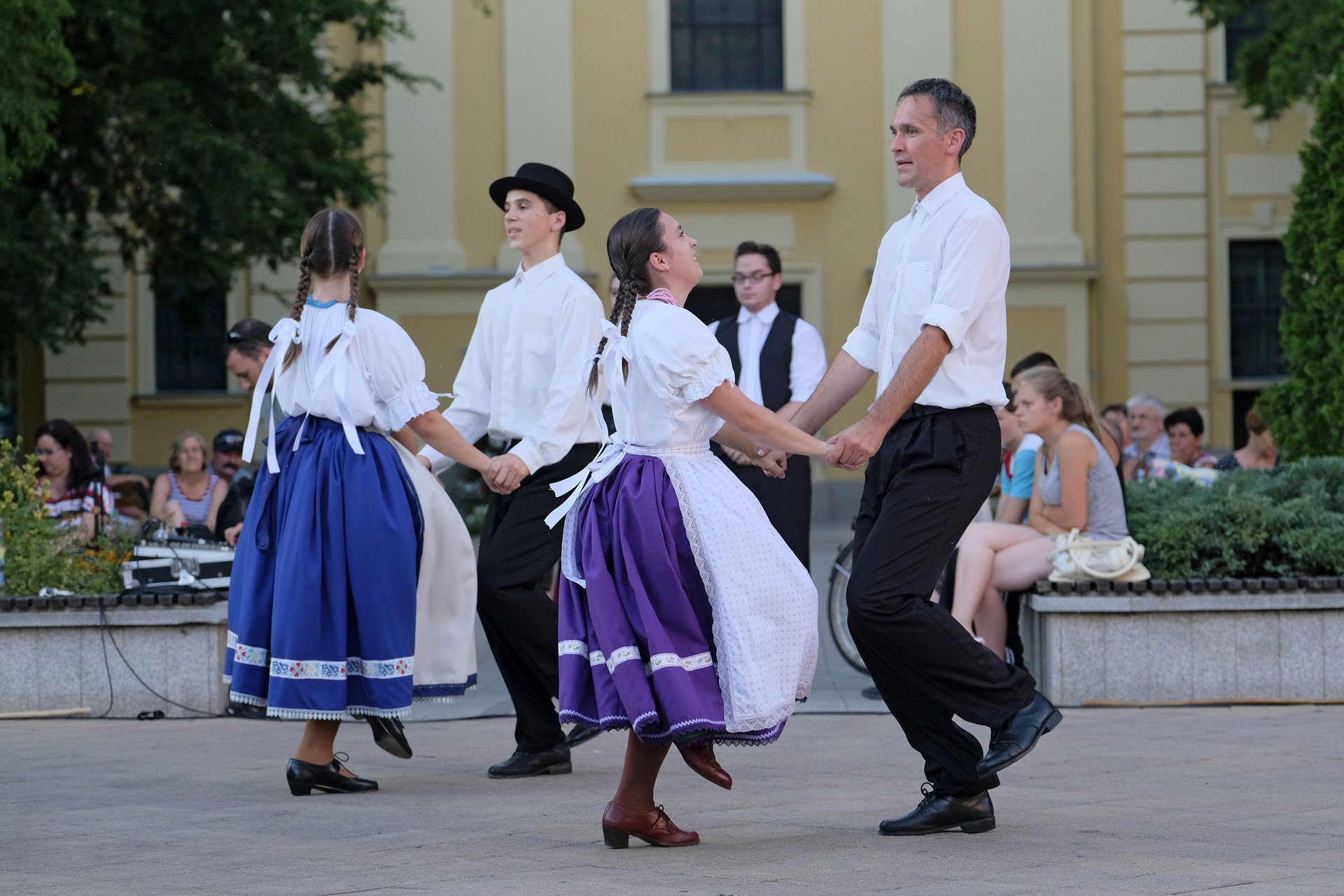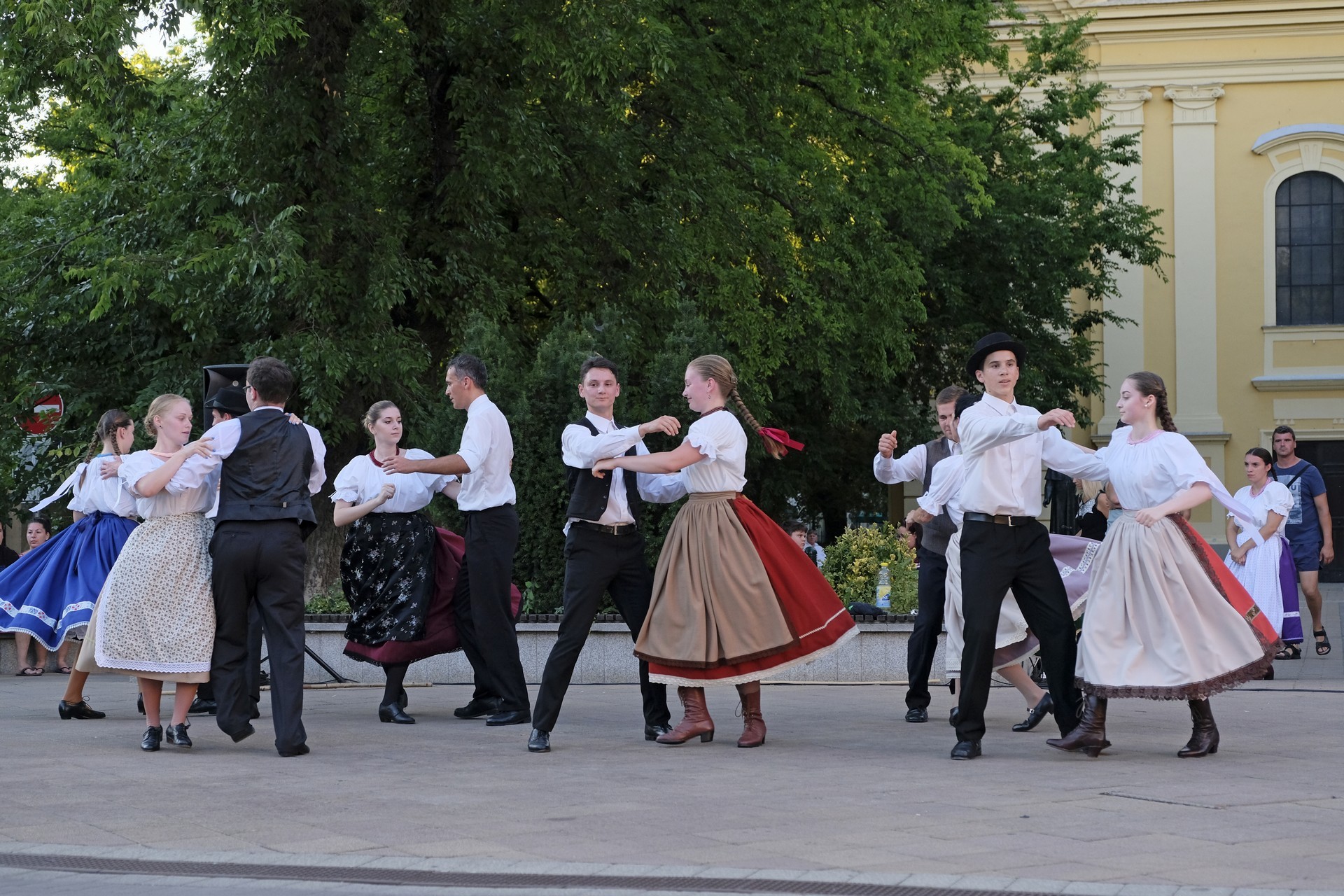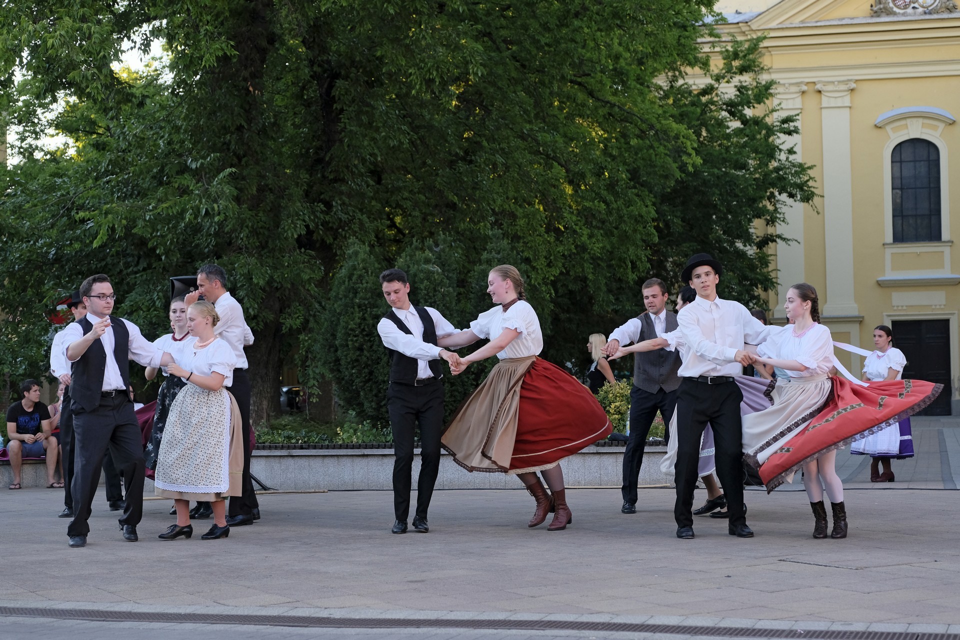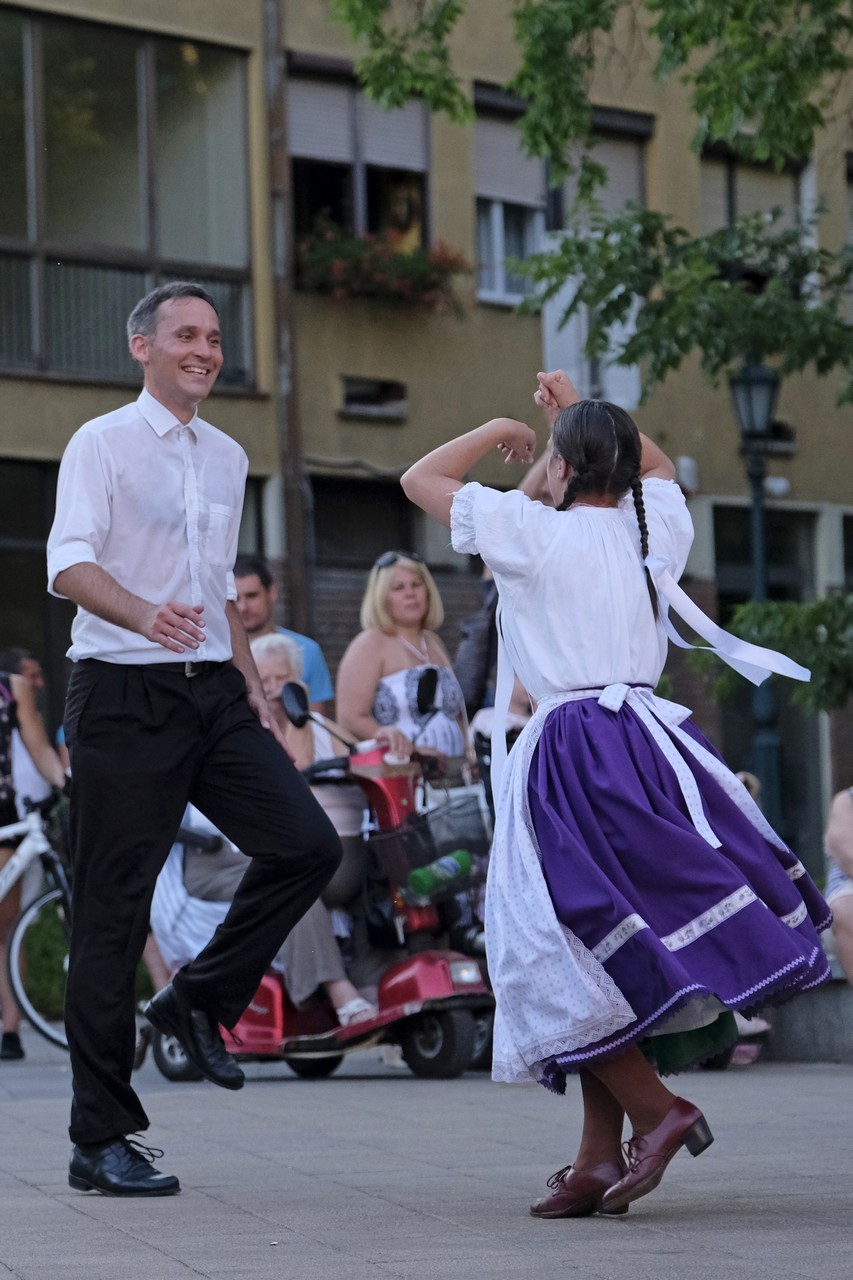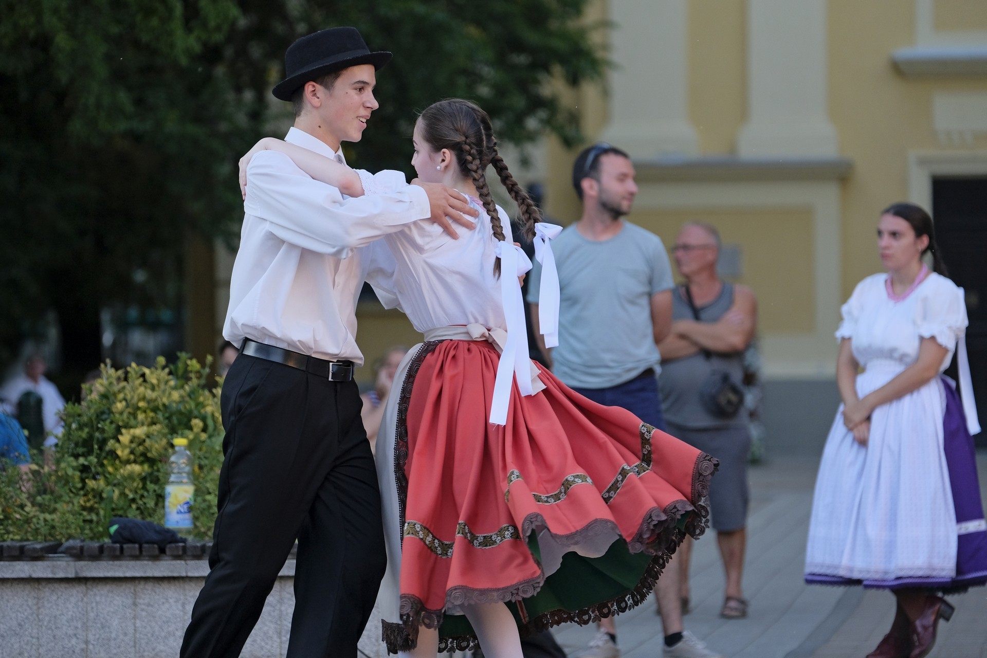 A mostani alkalomkor a Harruckern téren járók izgalmas produkciónak lehettek szemtanúi, hiszen a néptánc fürdővárosi képviselői táncolták el repertoárjukat. A népviseletbe öltözött előadók a Körösök-völgyének helyi sajátos tánchagyományaiból adtak elő. A több mint fél órás előadást gyönyörű zenék tették impozánsá.