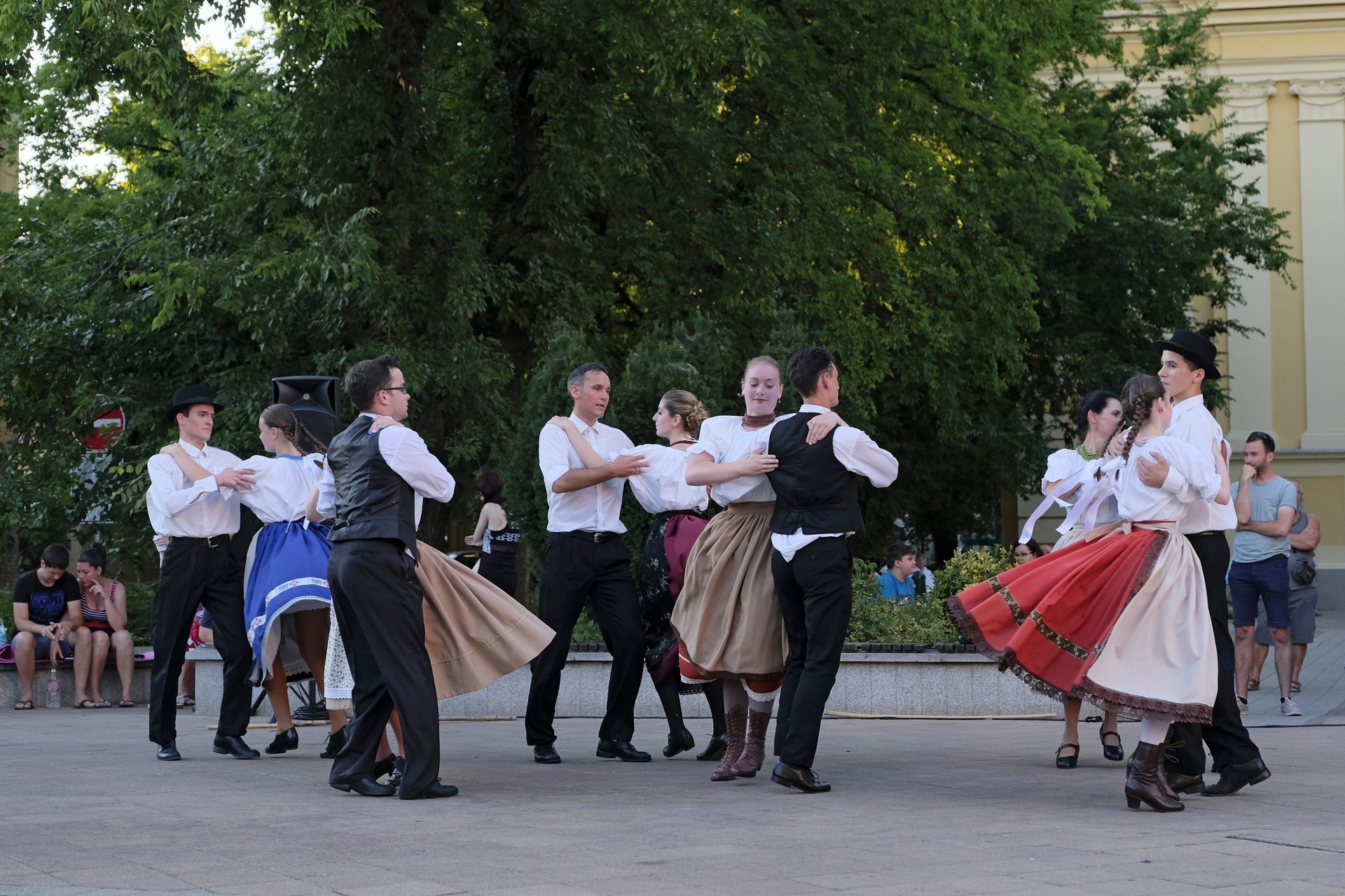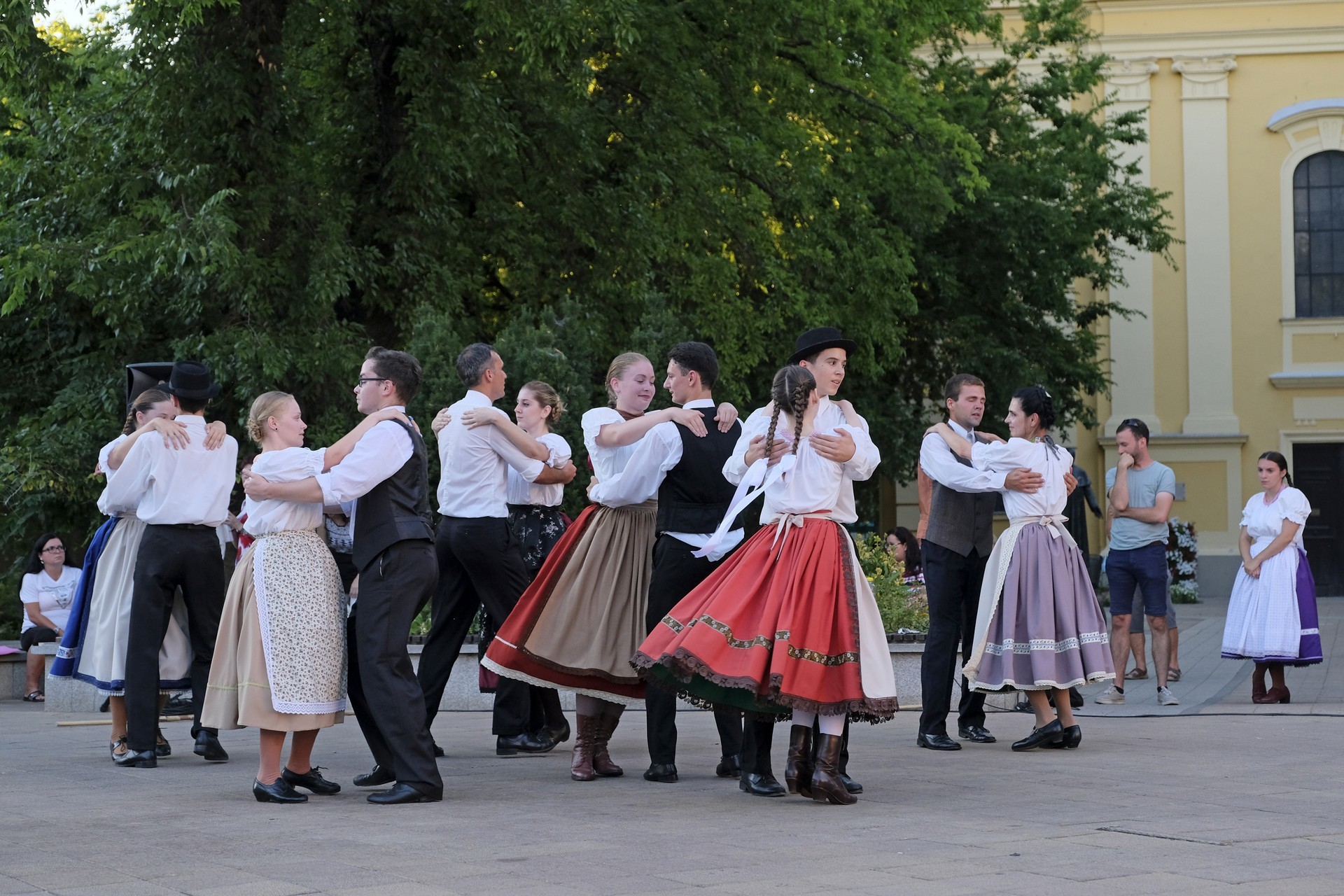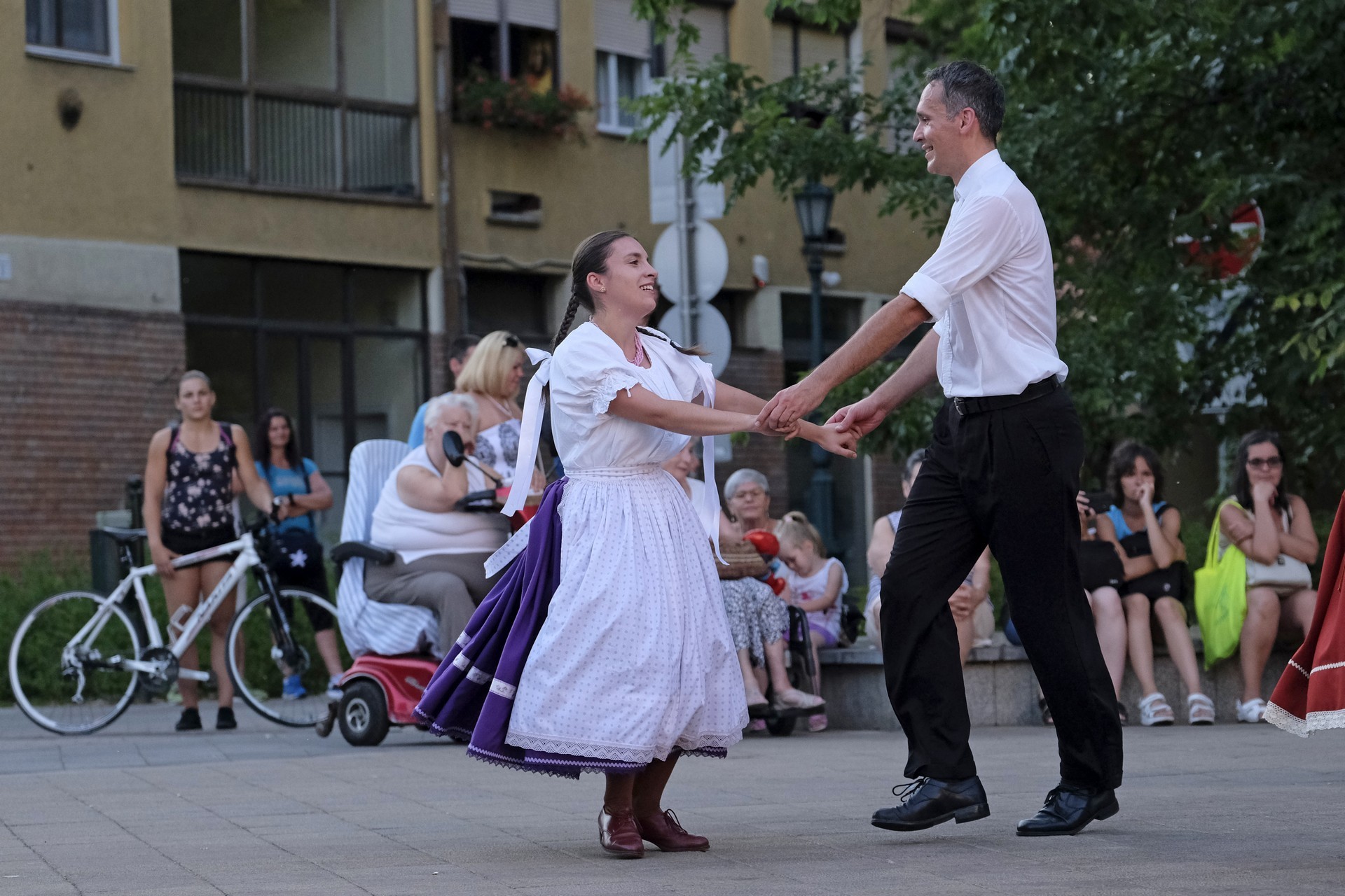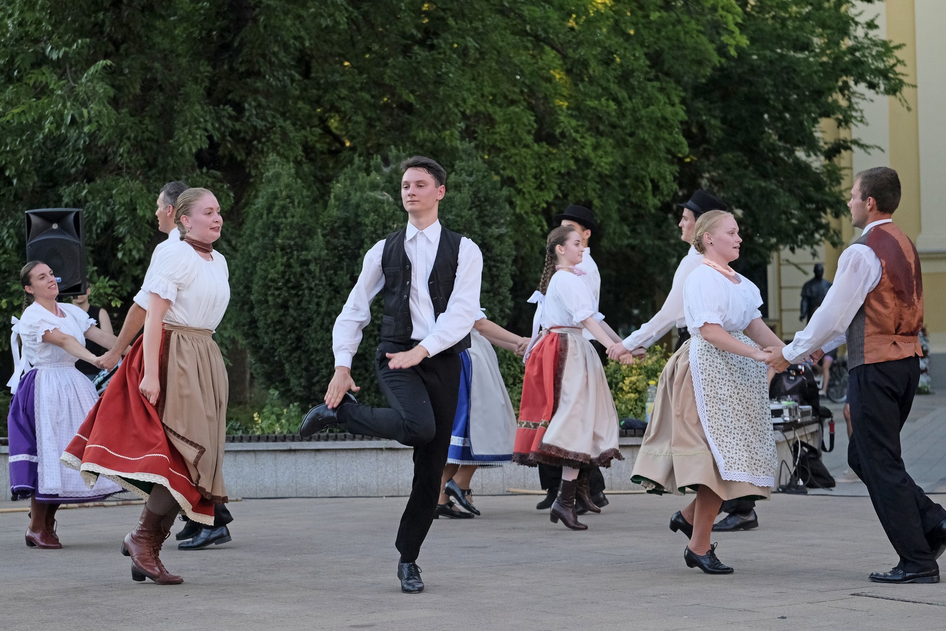A mostani alkalomkor a Harruckern téren járók izgalmas produkciónak lehettek szemtanúi, hiszen a néptánc fürdővárosi képviselői táncolták el repertoárjukat. A népviseletbe öltözött előadók a Körösök-völgyének helyi sajátos tánchagyományaiból adtak elő. A több mint fél órás előadást gyönyörű zenék tették impozánsá.