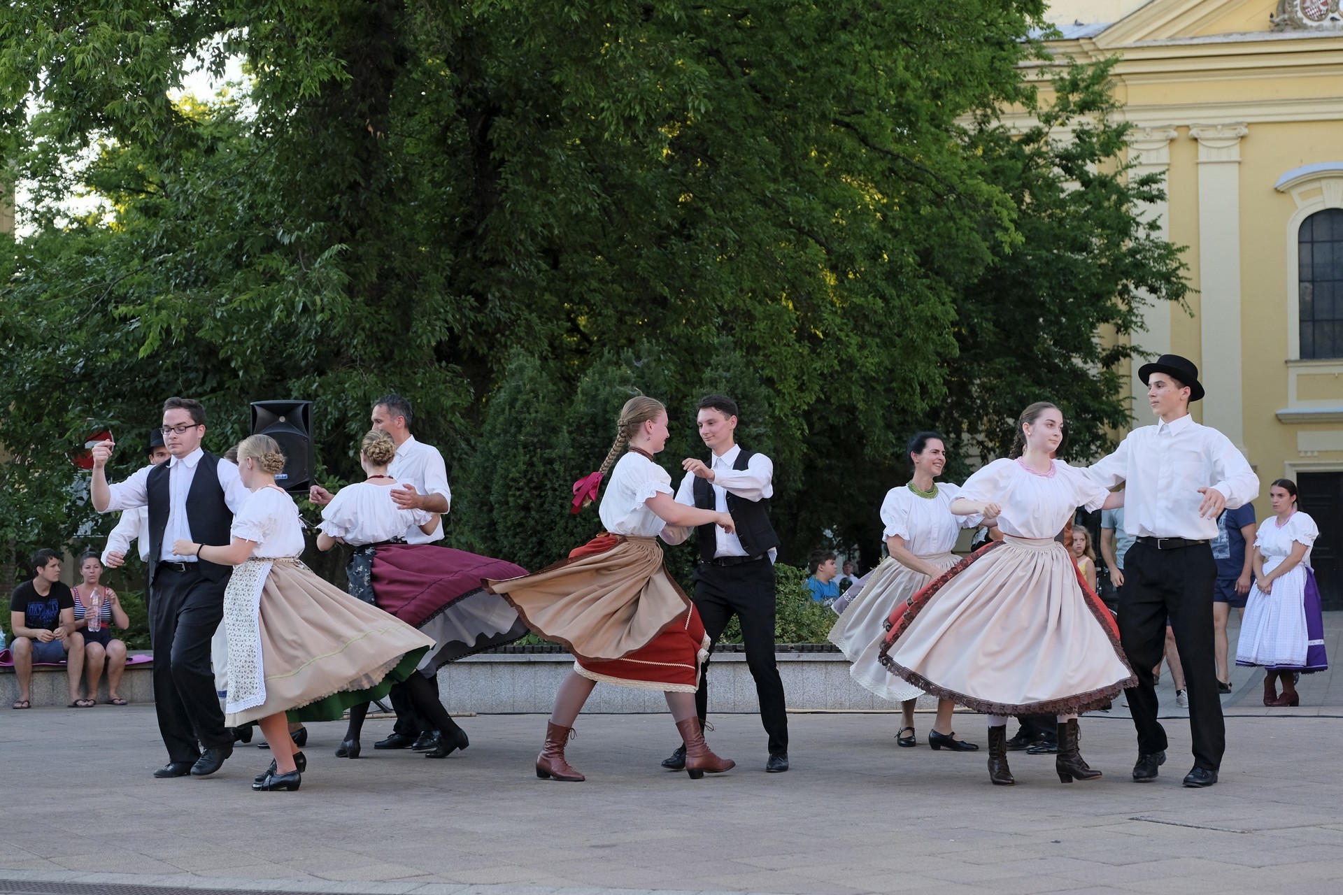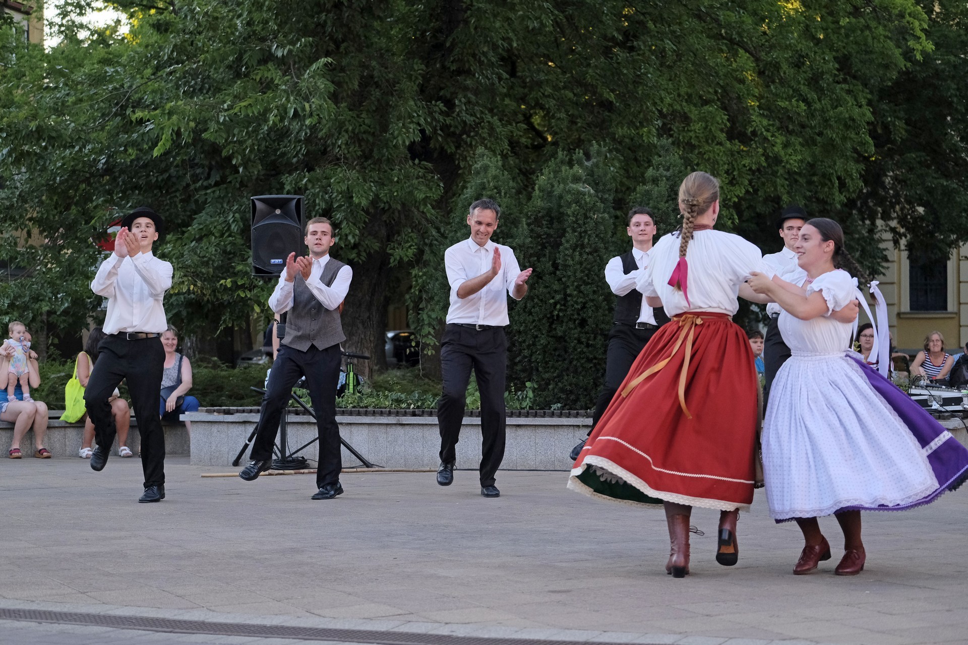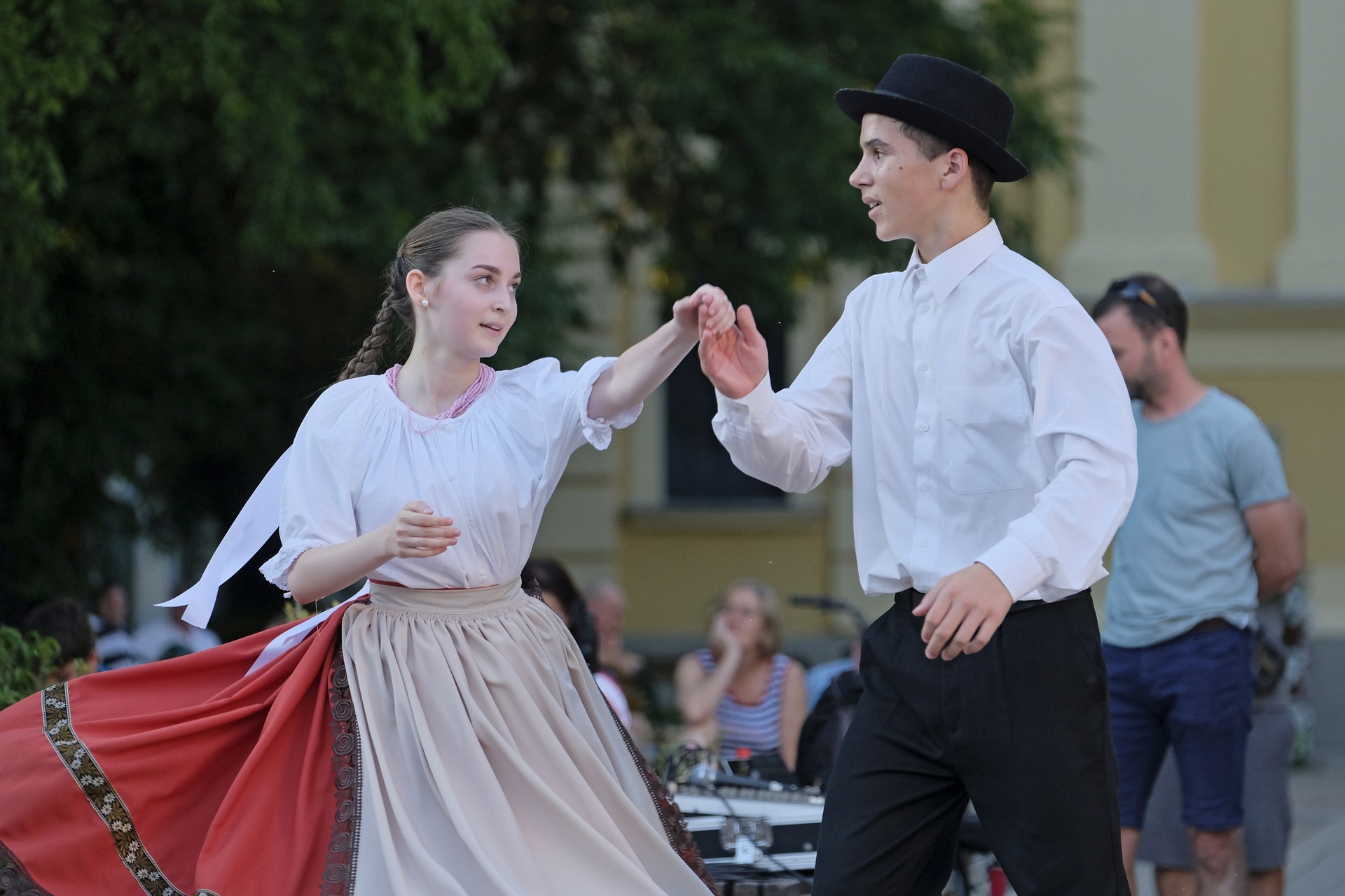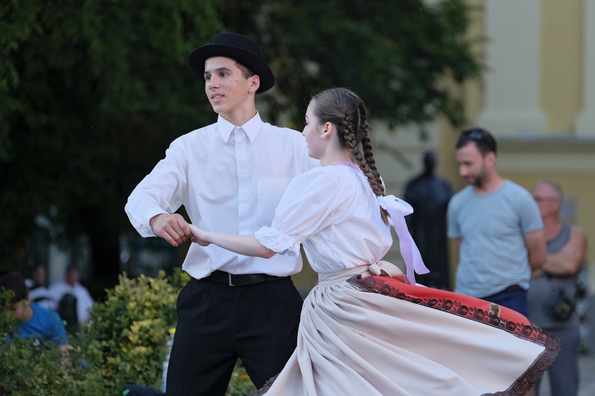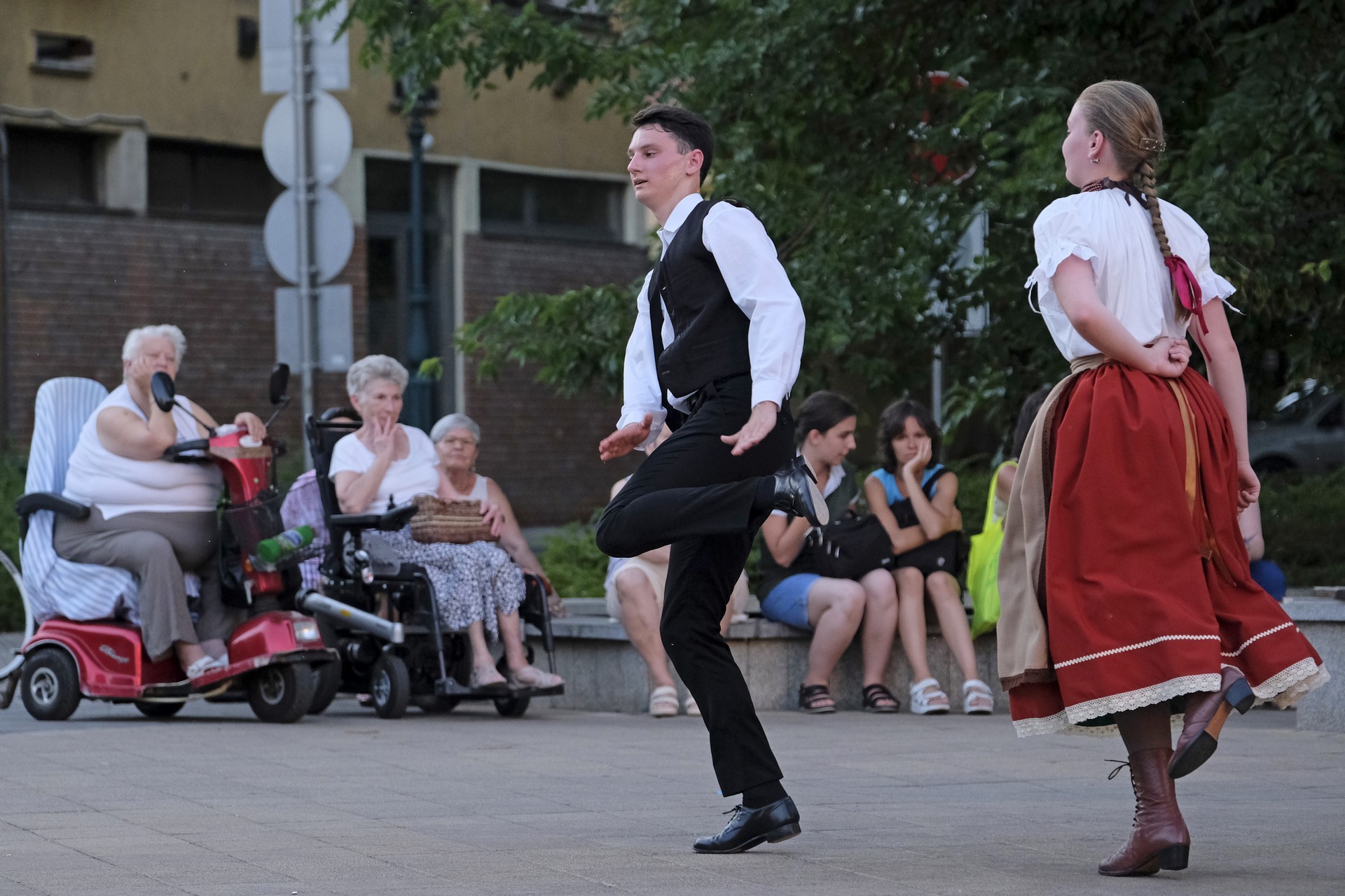 A mostani alkalomkor a Harruckern téren járók izgalmas produkciónak lehettek szemtanúi, hiszen a néptánc fürdővárosi képviselői táncolták el repertoárjukat. A népviseletbe öltözött előadók a Körösök-völgyének helyi sajátos tánchagyományaiból adtak elő. A több mint fél órás előadást gyönyörű zenék tették impozánsá.
