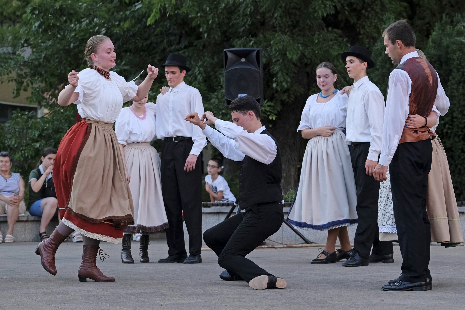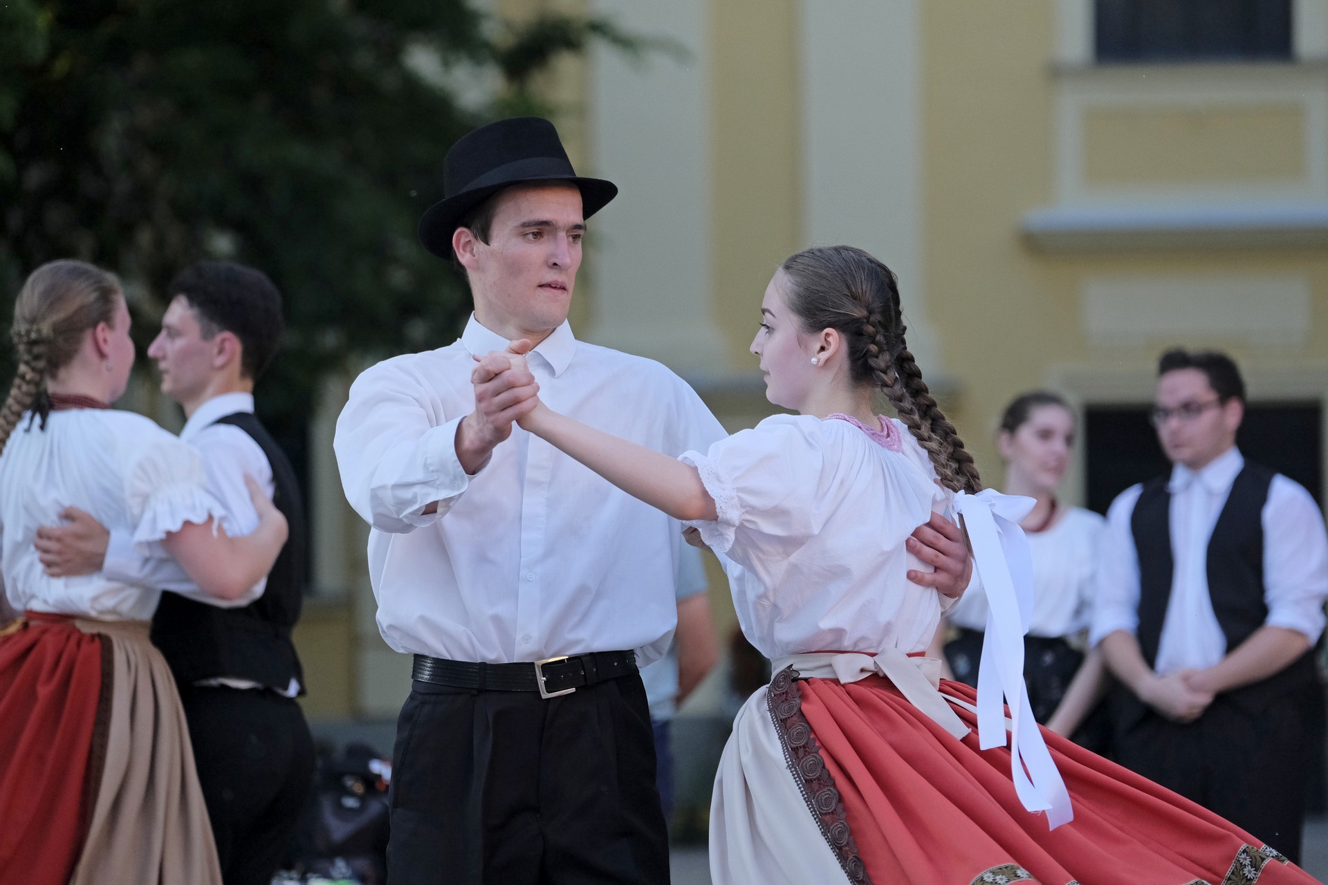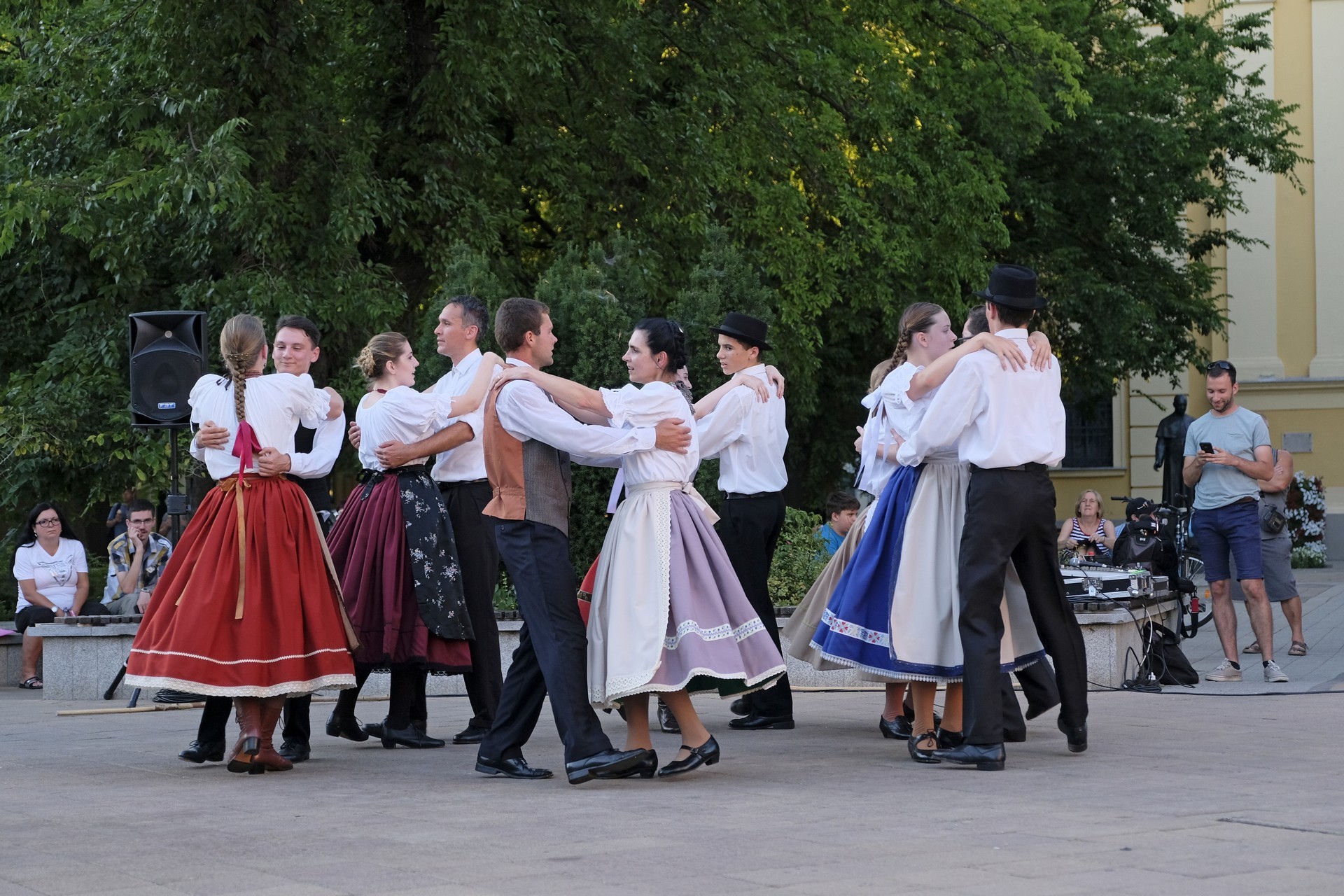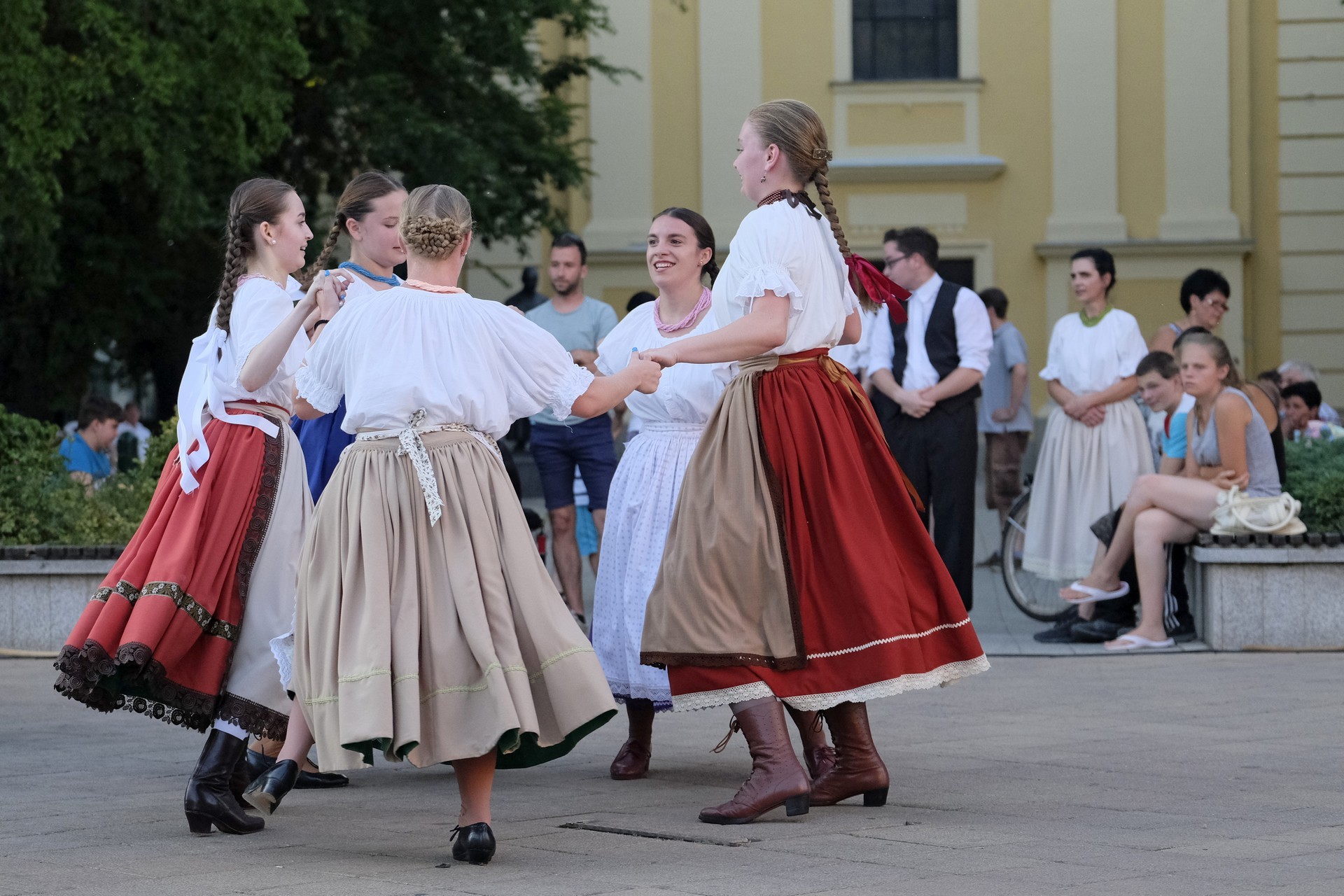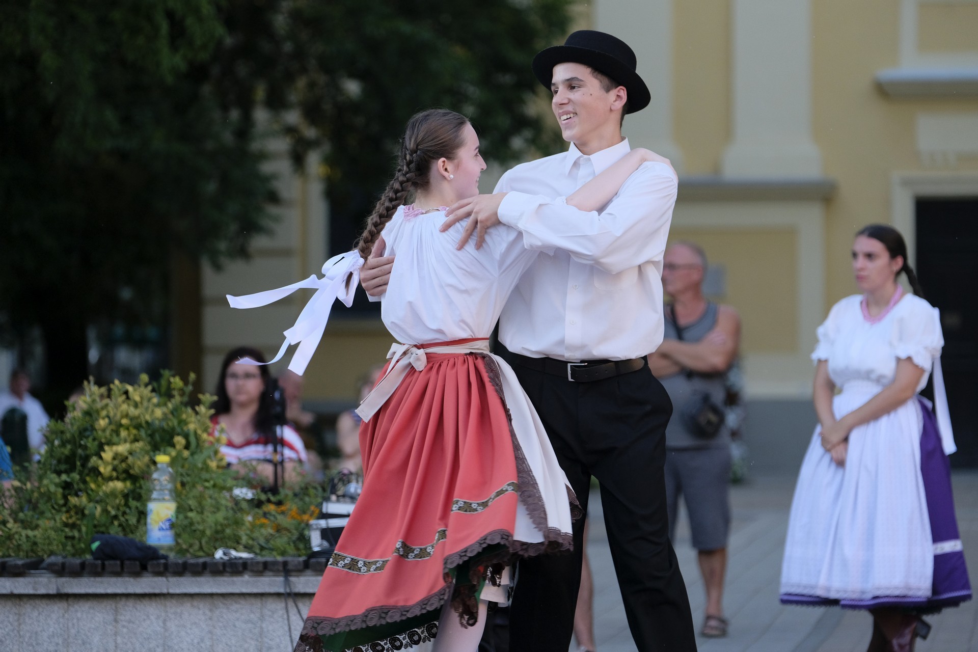 A mostani alkalomkor a Harruckern téren járók izgalmas produkciónak lehettek szemtanúi, hiszen a néptánc fürdővárosi képviselői táncolták el repertoárjukat. A népviseletbe öltözött előadók a Körösök-völgyének helyi sajátos tánchagyományaiból adtak elő. A több mint fél órás előadást gyönyörű zenék tették impozánsá.