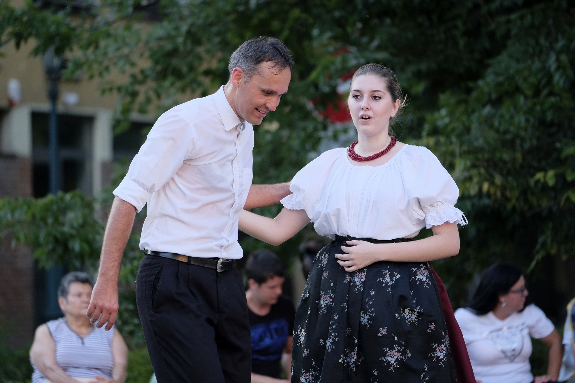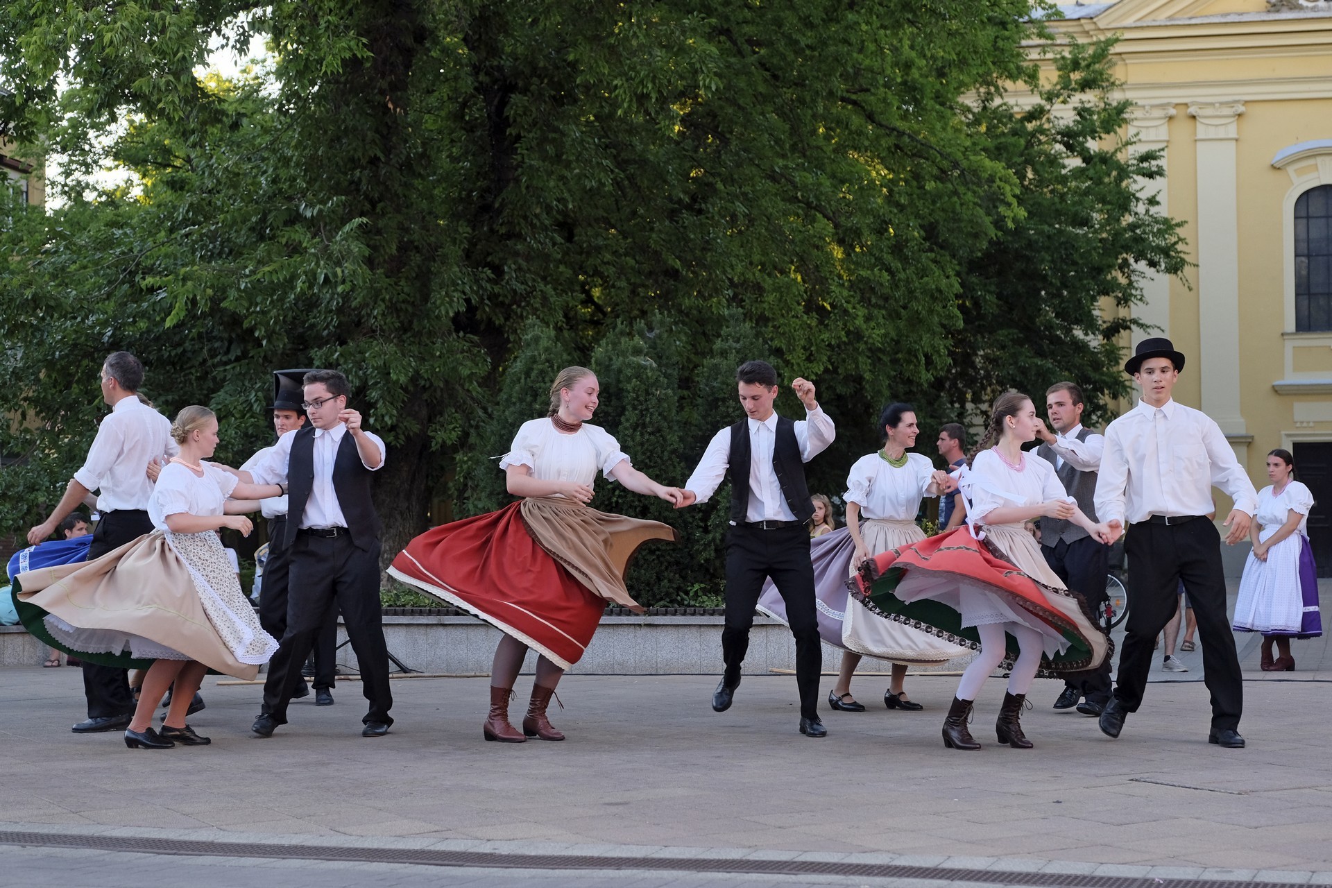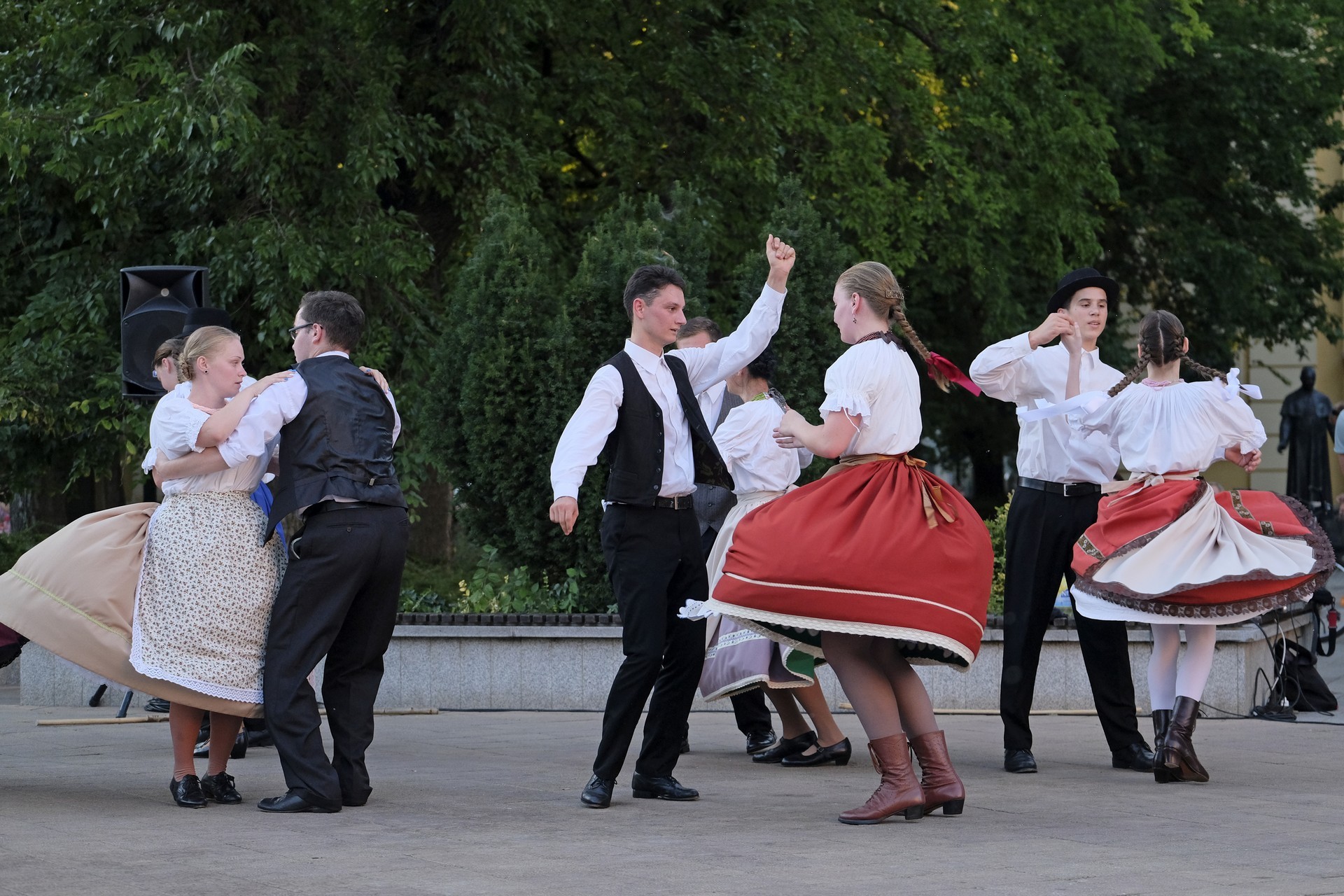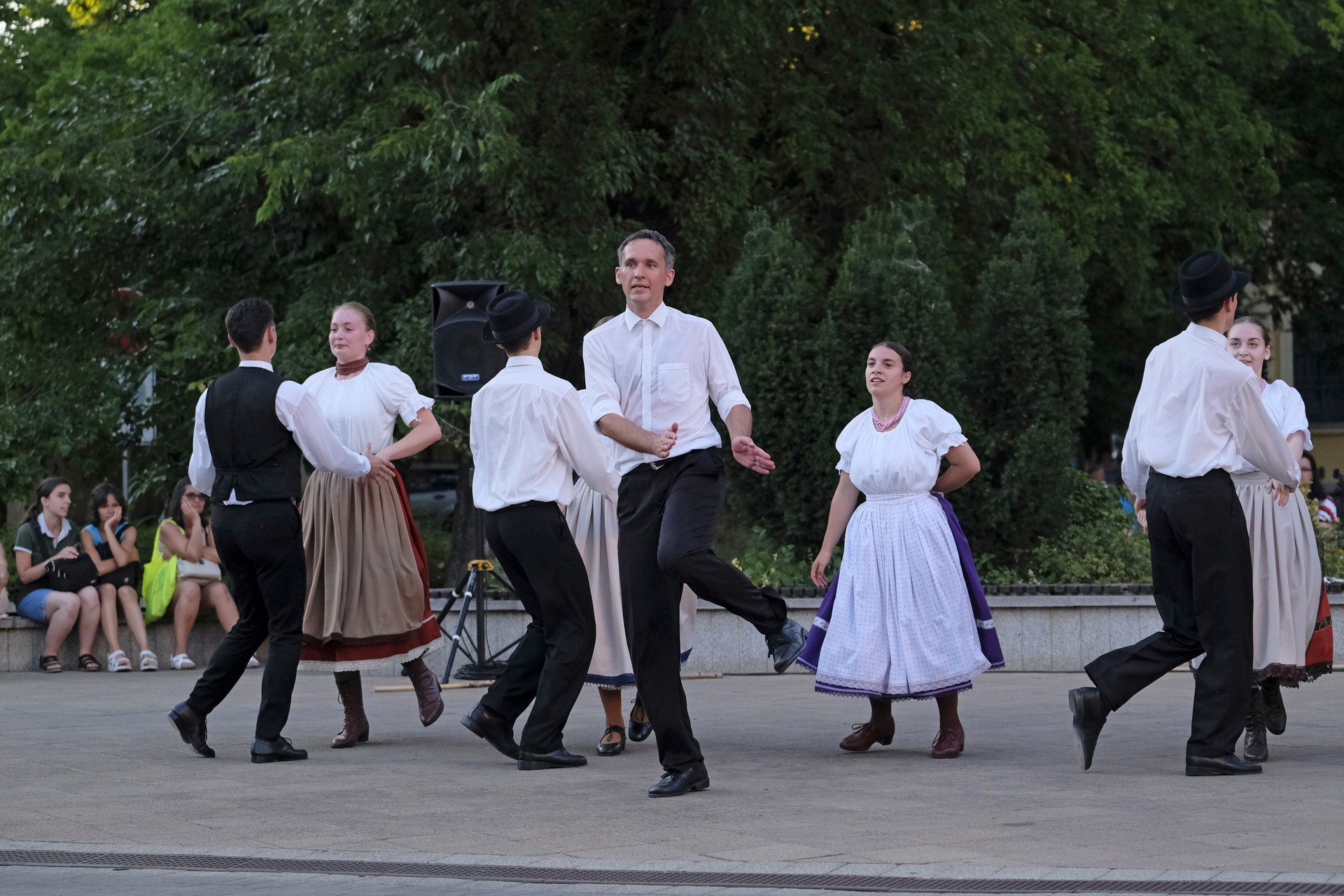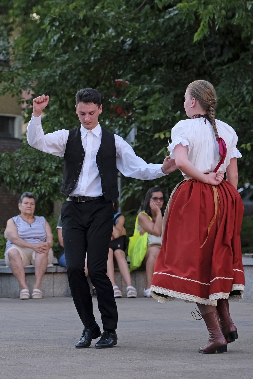 A mostani alkalomkor a Harruckern téren járók izgalmas produkciónak lehettek szemtanúi, hiszen a néptánc fürdővárosi képviselői táncolták el repertoárjukat. A népviseletbe öltözött előadók a Körösök-völgyének helyi sajátos tánchagyományaiból adtak elő. A több mint fél órás előadást gyönyörű zenék tették impozánsá.