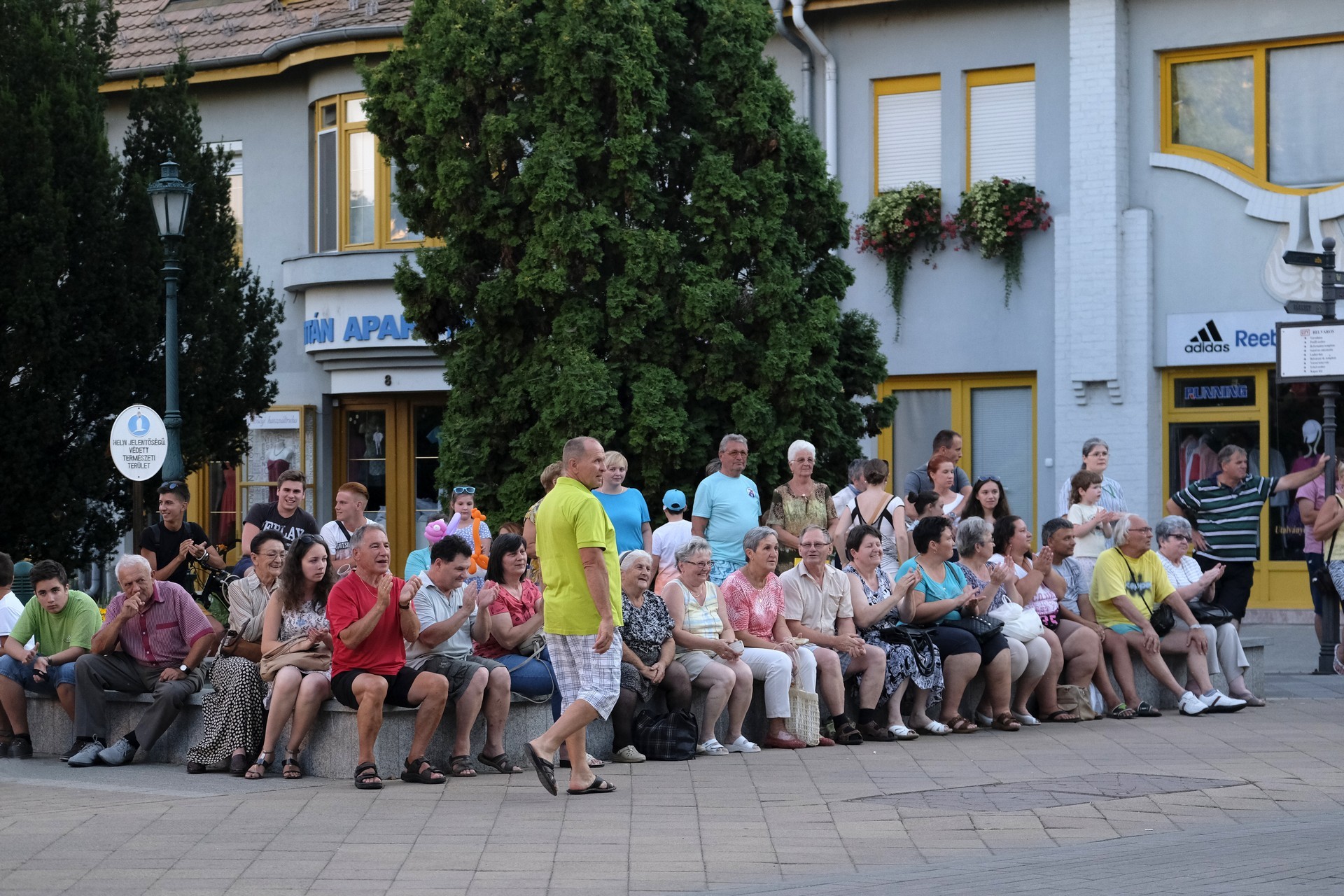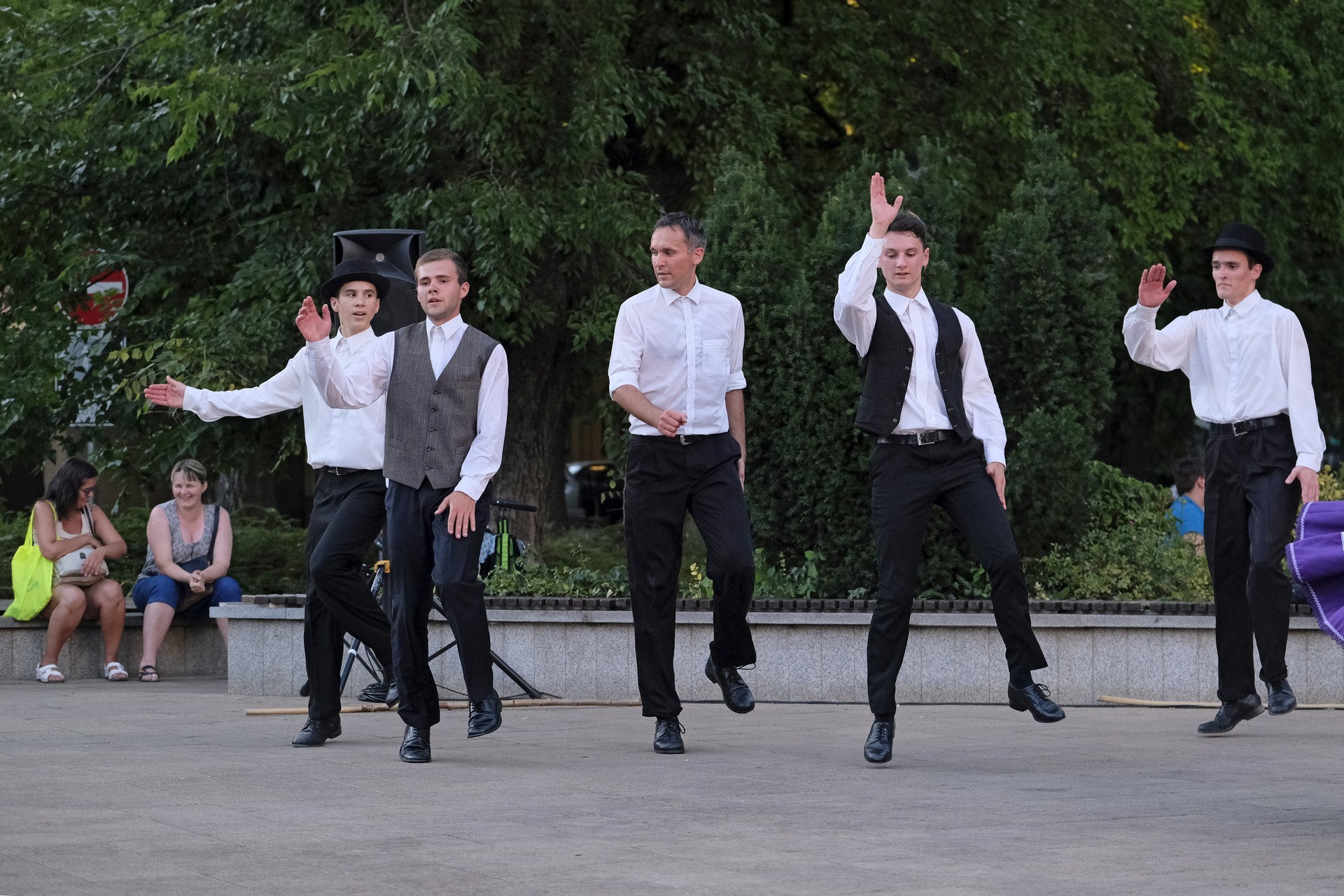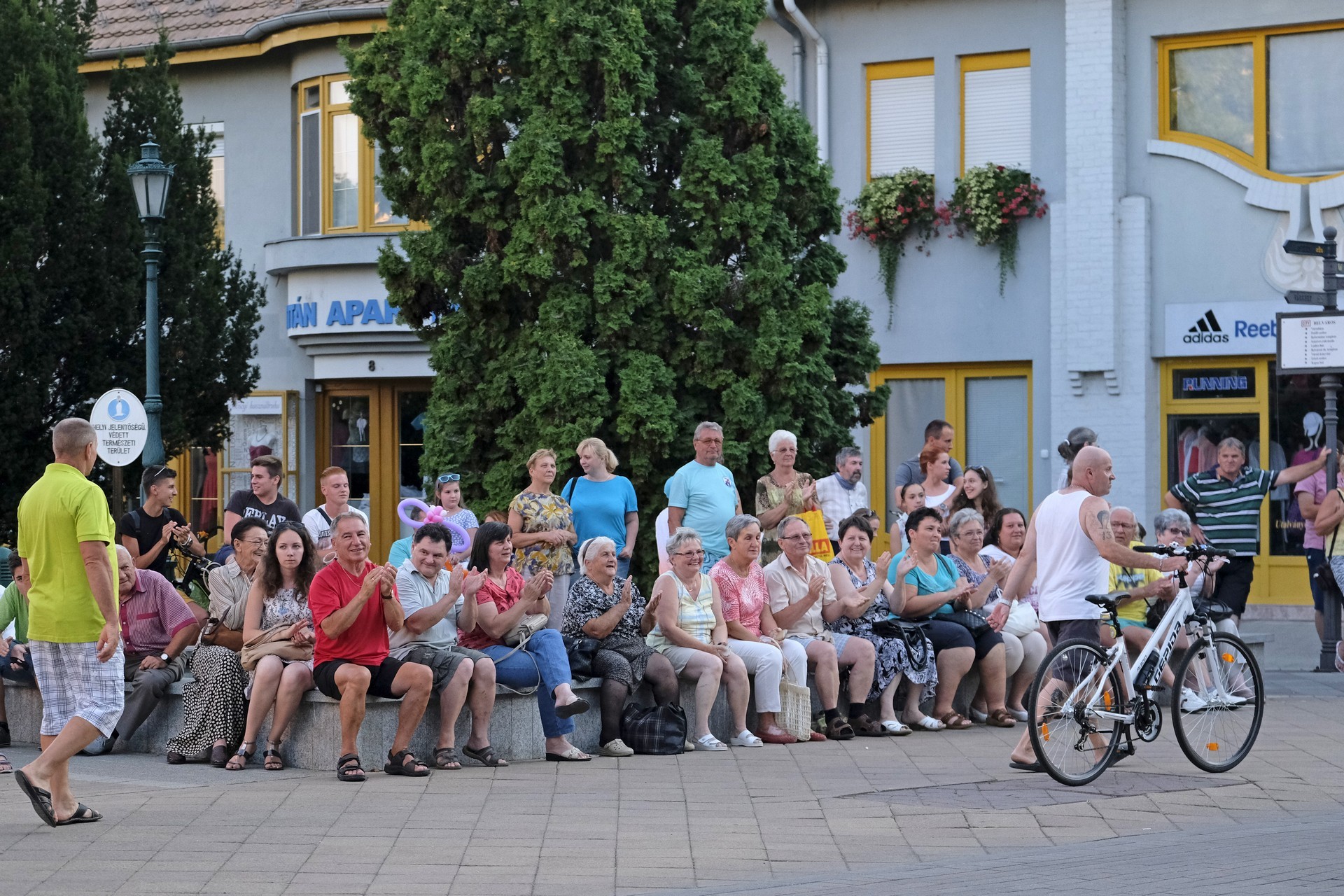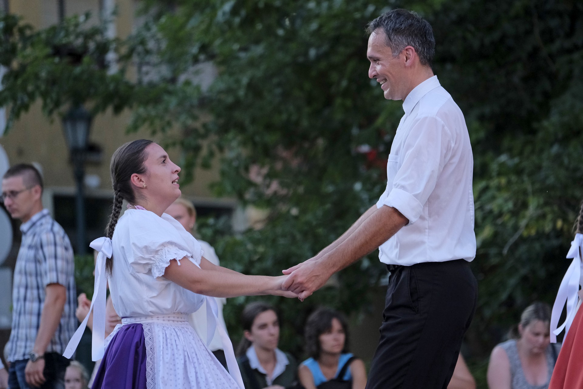 A mostani alkalomkor a Harruckern téren járók izgalmas produkciónak lehettek szemtanúi, hiszen a néptánc fürdővárosi képviselői táncolták el repertoárjukat. A népviseletbe öltözött előadók a Körösök-völgyének helyi sajátos tánchagyományaiból adtak elő. A több mint fél órás előadást gyönyörű zenék tették impozánsá.