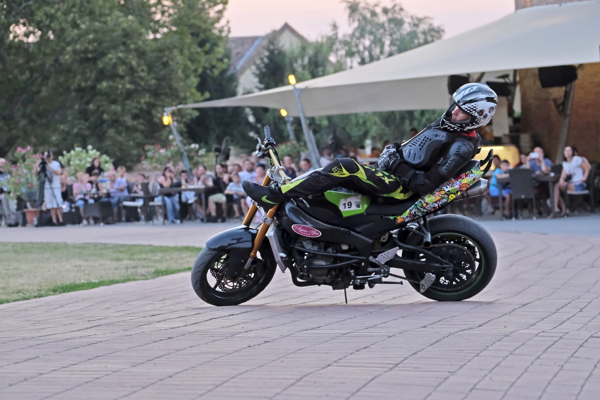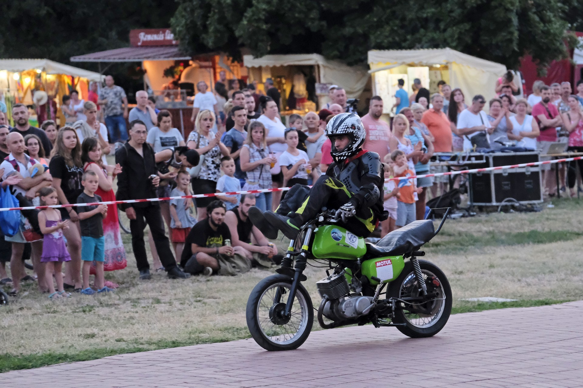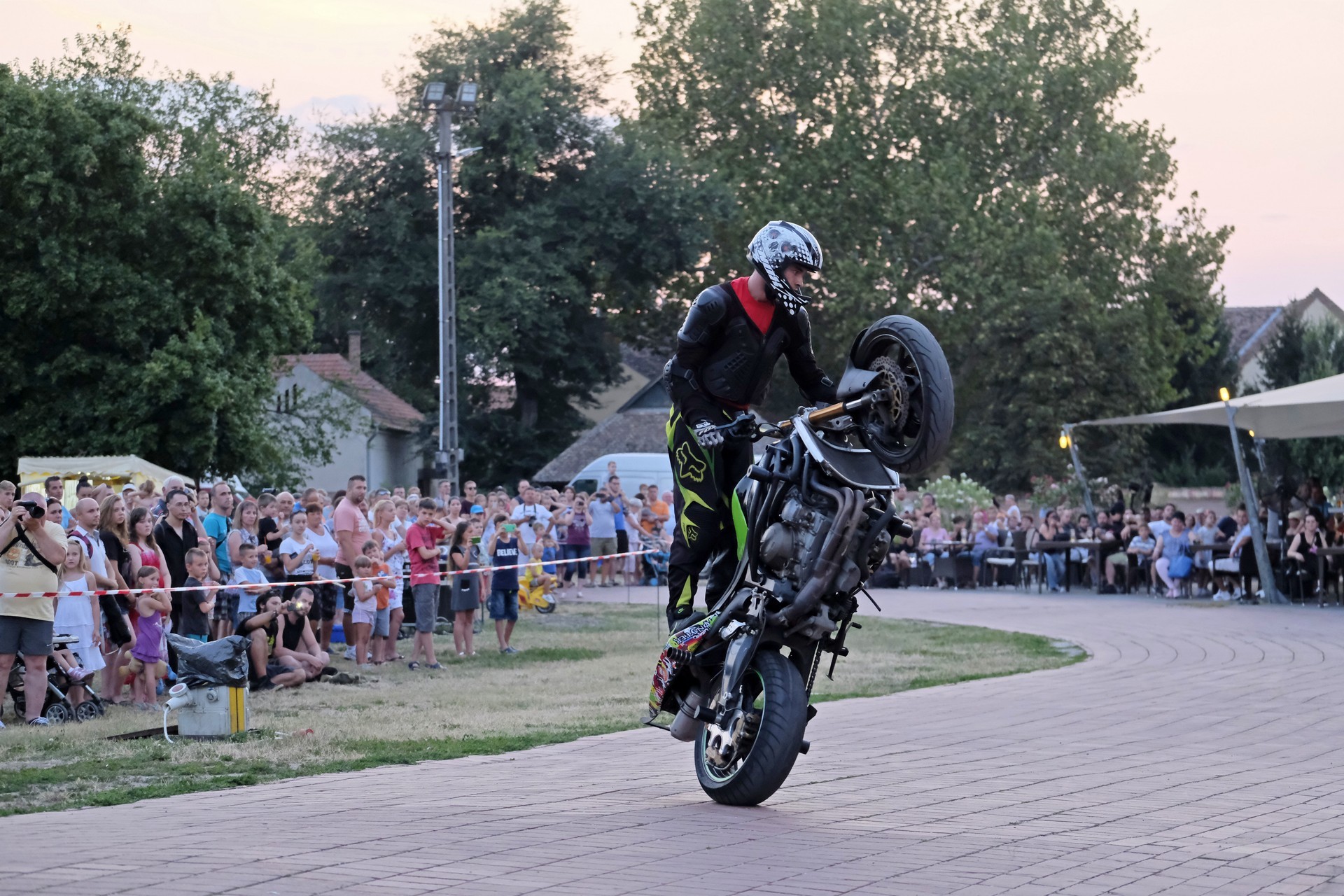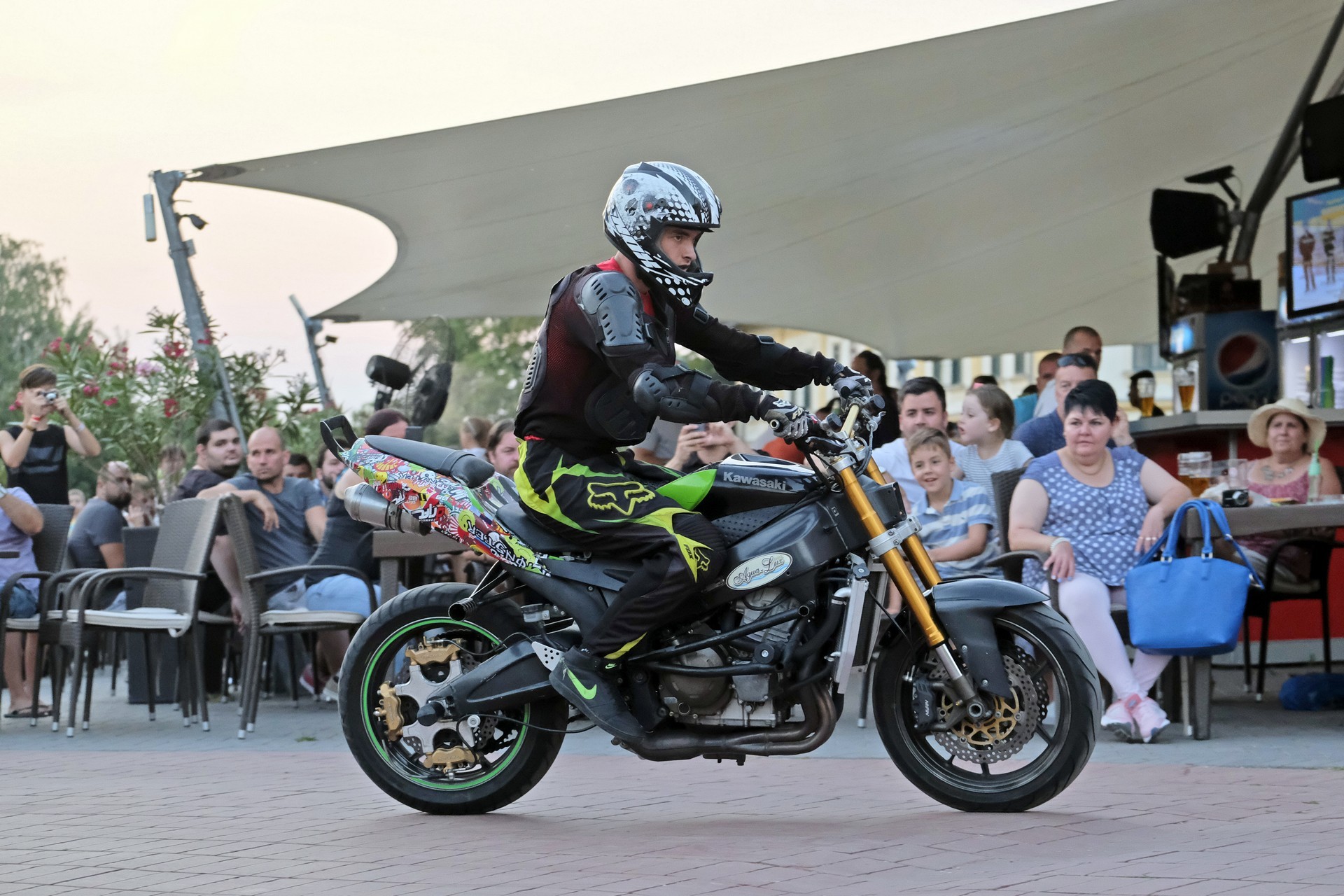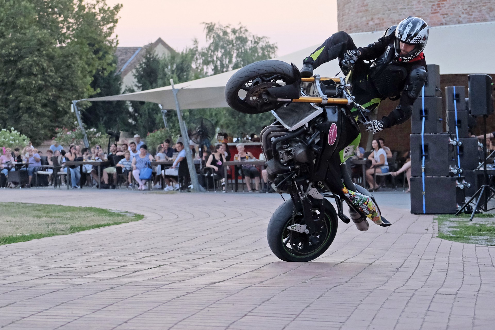 Az este Podani Milán látványos bemutatójával kezdődött. A szarvasi fiatalember öt éves kora óta motorozik, és meglehet, hogy szűkös volt a rondella mellett kialakított terület számára, de így is lélegzetelállító trükkökkel szórakoztatta a közönséget.