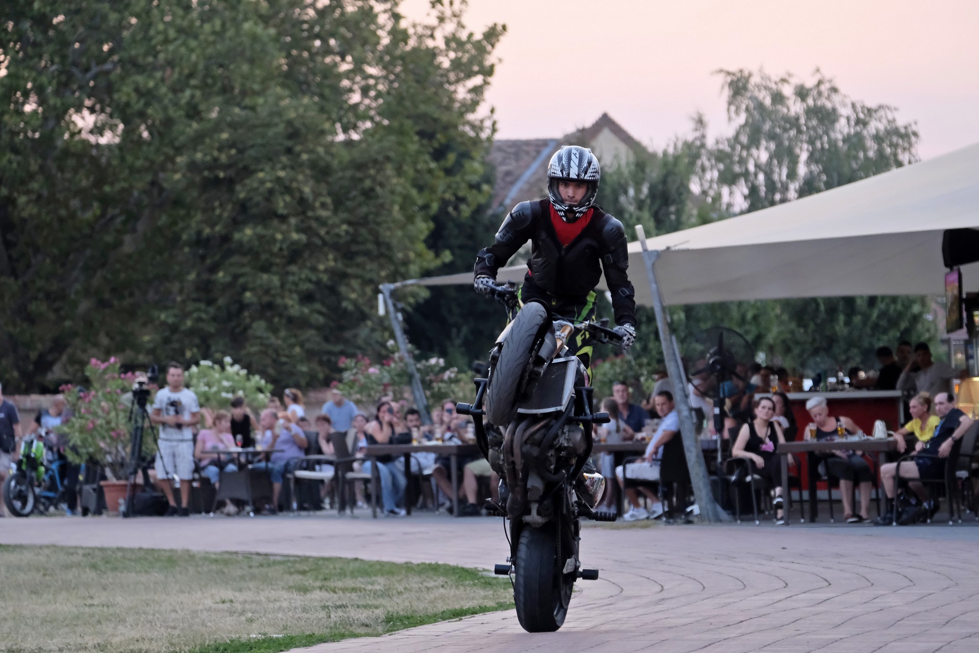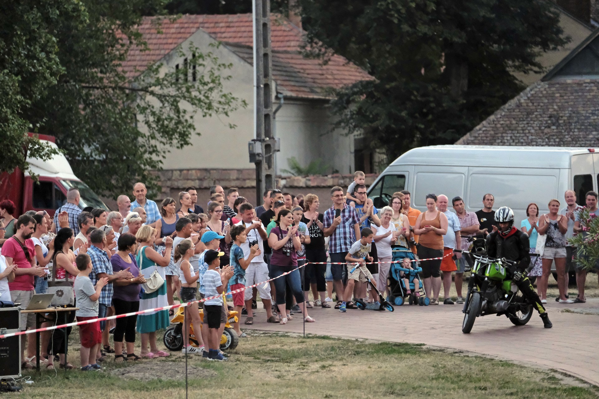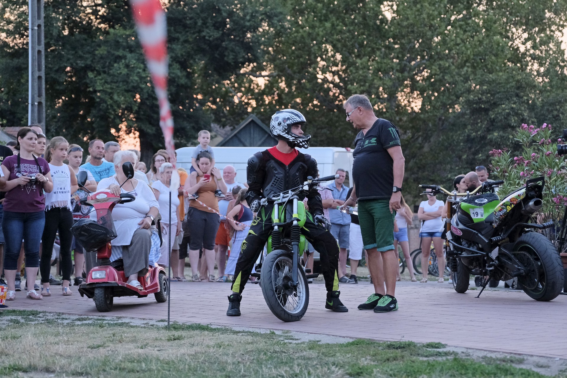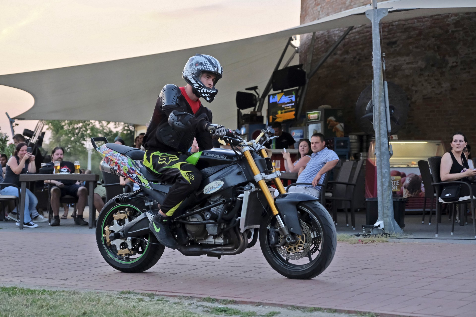 Az este Podani Milán látványos bemutatójával kezdődött. A szarvasi fiatalember öt éves kora óta motorozik, és meglehet, hogy szűkös volt a rondella mellett kialakított terület számára, de így is lélegzetelállító trükkökkel szórakoztatta a közönséget.