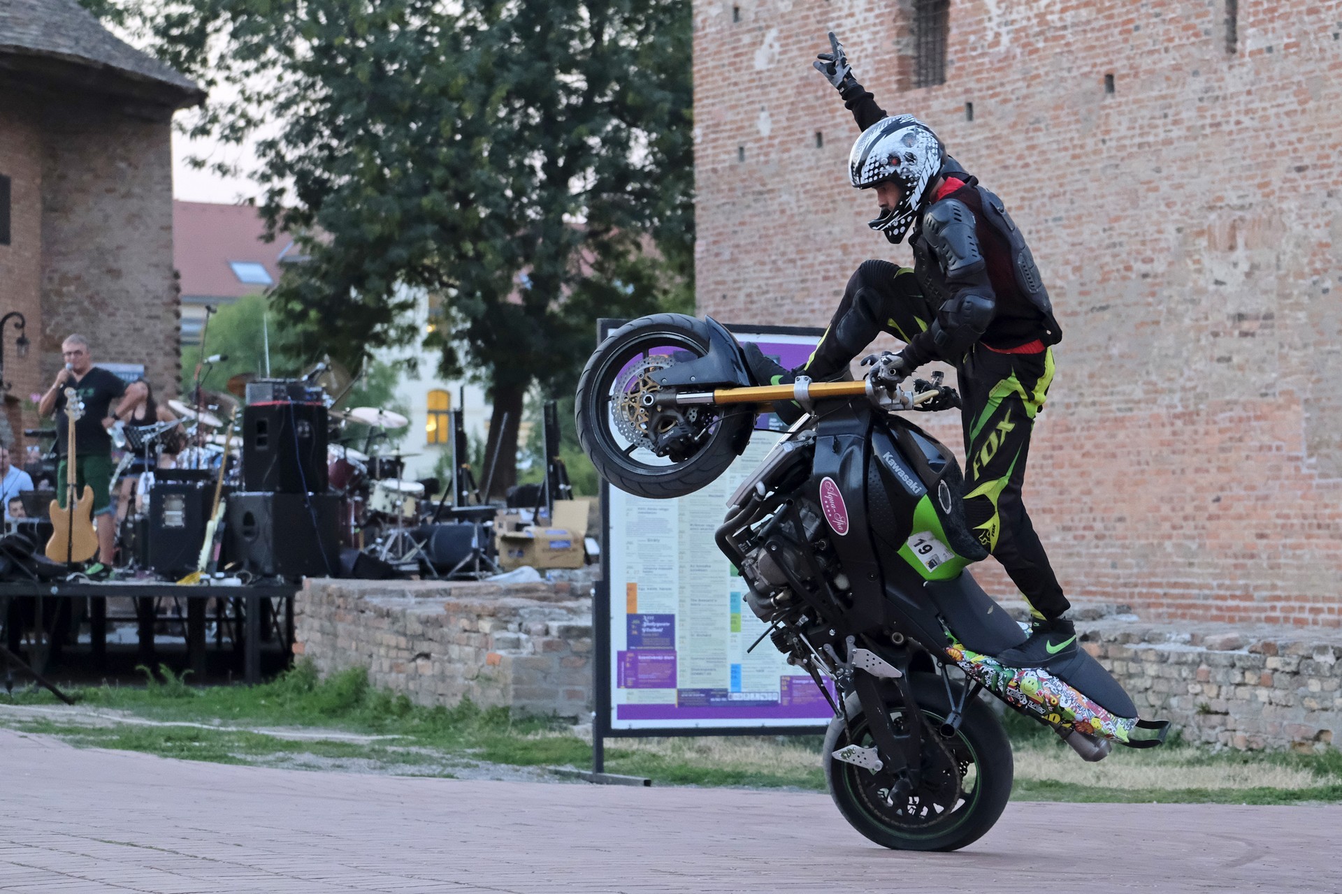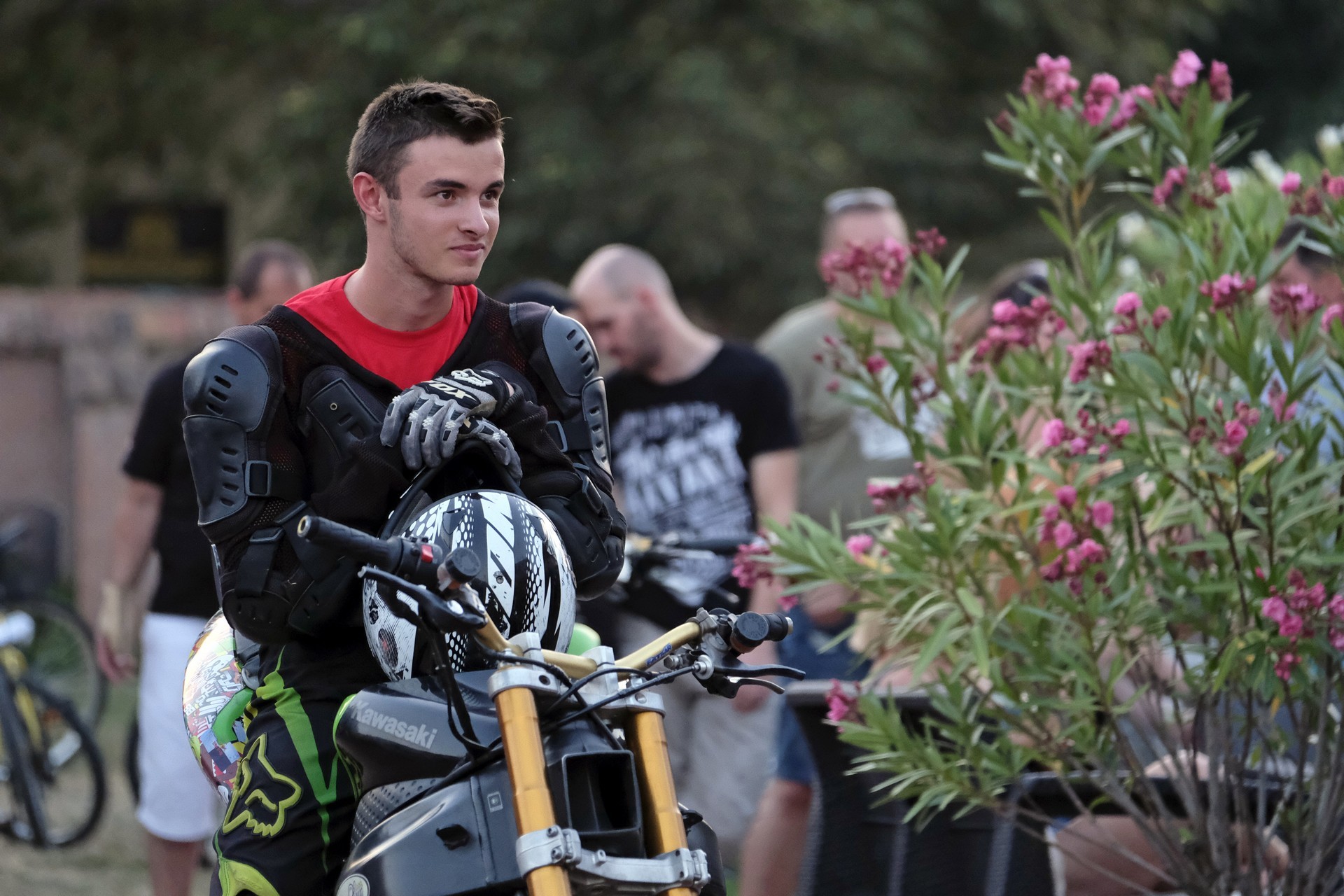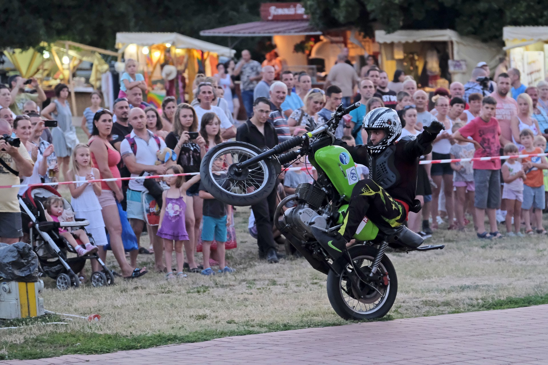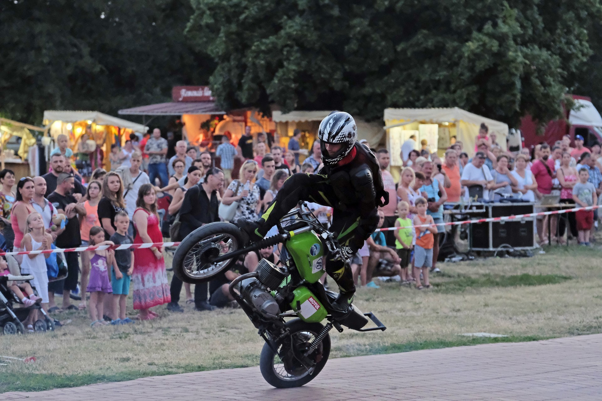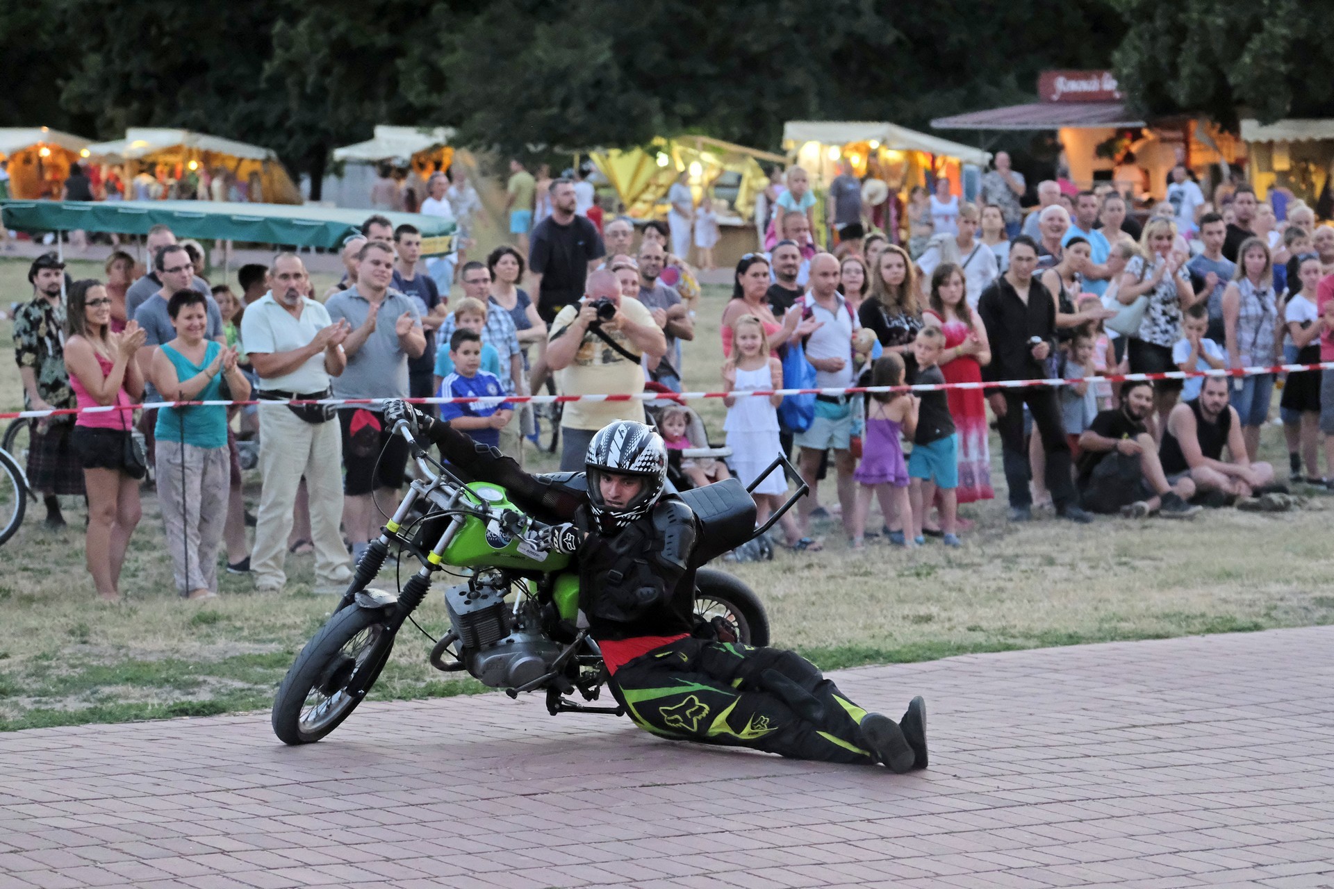 Az este Podani Milán látványos bemutatójával kezdődött. A szarvasi fiatalember öt éves kora óta motorozik, és meglehet, hogy szűkös volt a rondella mellett kialakított terület számára, de így is lélegzetelállító trükkökkel szórakoztatta a közönséget.