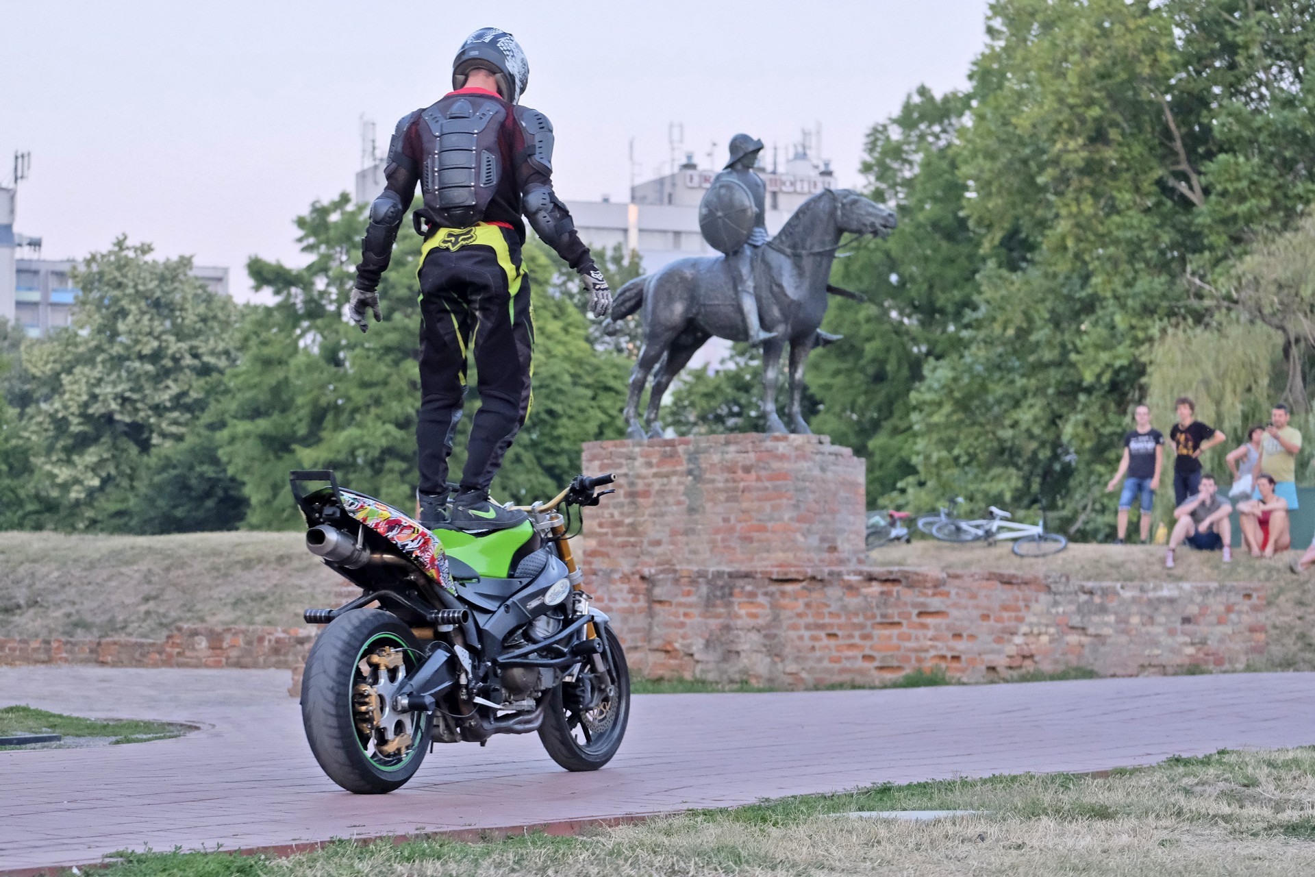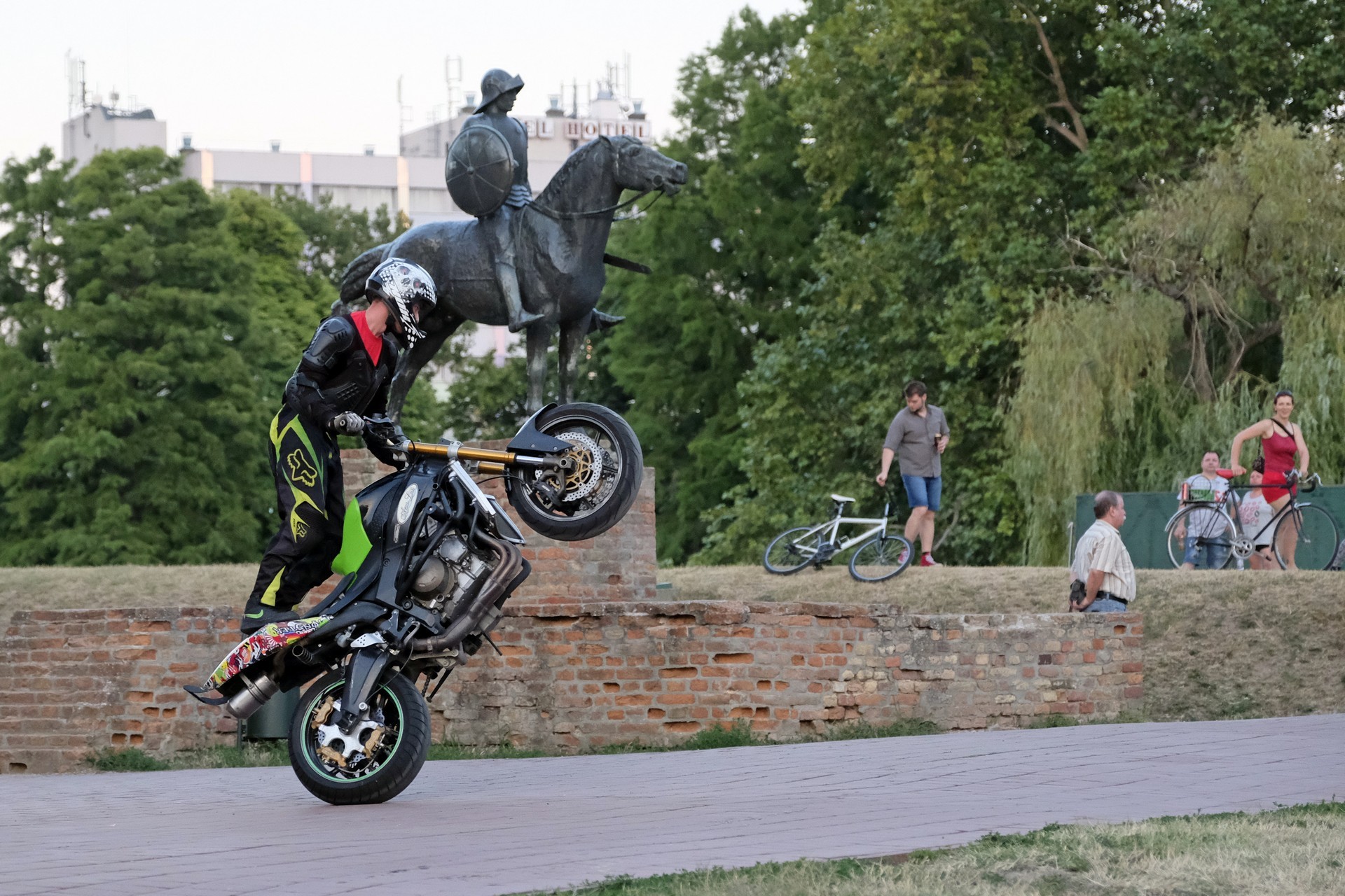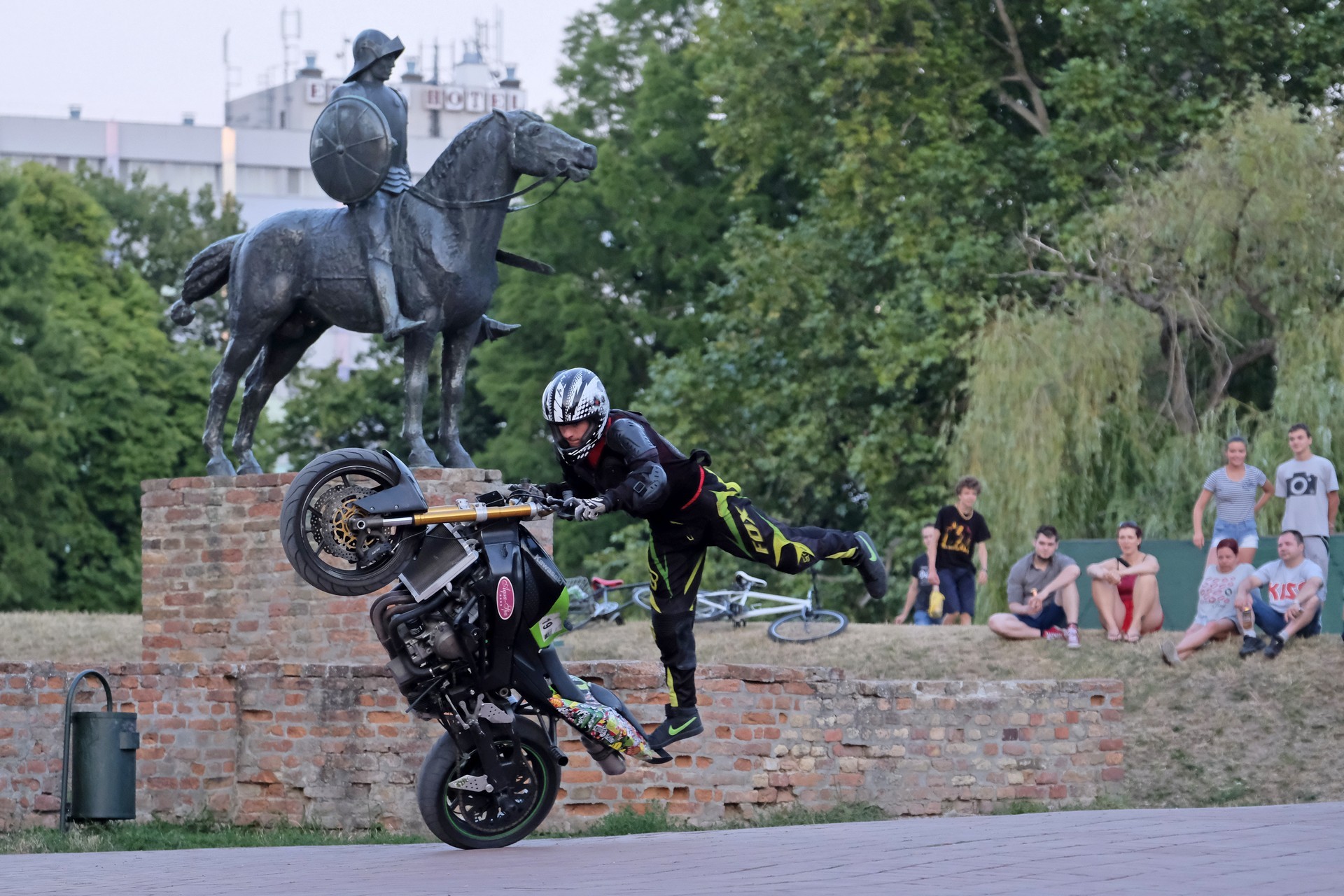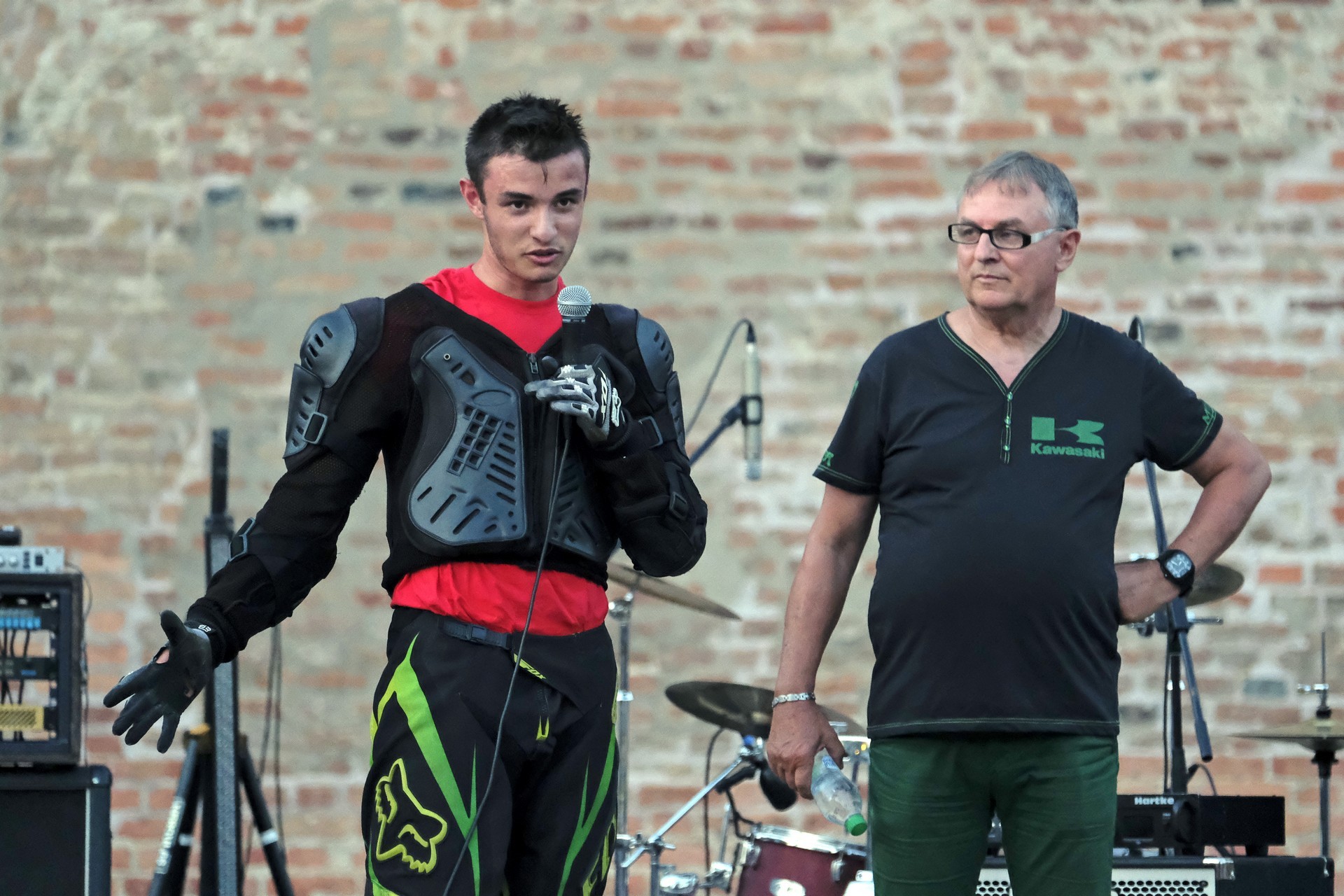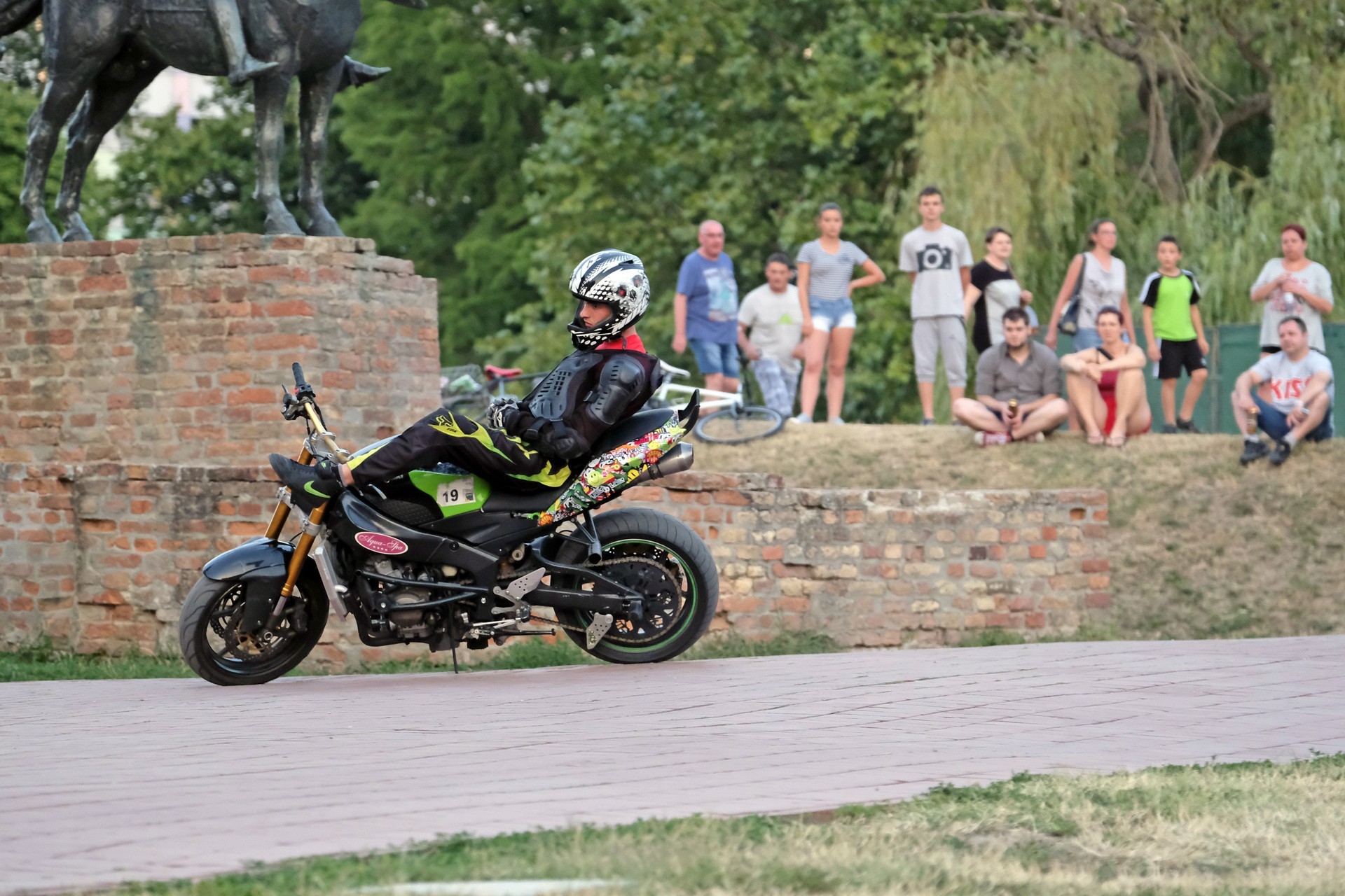 Az este Podani Milán látványos bemutatójával kezdődött. A szarvasi fiatalember öt éves kora óta motorozik, és meglehet, hogy szűkös volt a rondella mellett kialakított terület számára, de így is lélegzetelállító trükkökkel szórakoztatta a közönséget.
