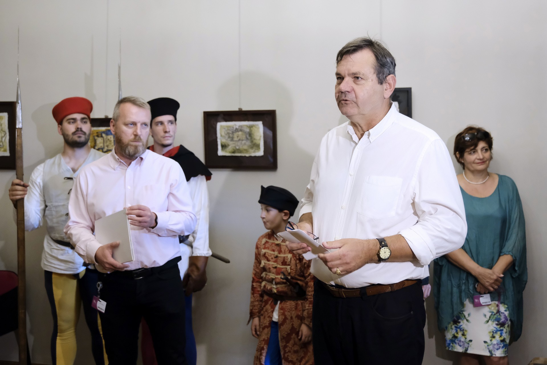 Csikány Tamás ezredes, az MTA doktora, tanszékvezető egyetemi tanár megnyitóbeszédében elmondta: A hadmérnök feljegyzései című kiállításon bemutatott alkotások régi, 16. századi rajzok, vázlatok alapján készültek. Mint kifejtette, a korabeli terveket Ölveczky Gábor saját látásmódja szerint értelmezte újra, ezzel ráirányította a figyelmet a számára fontos részletekre.