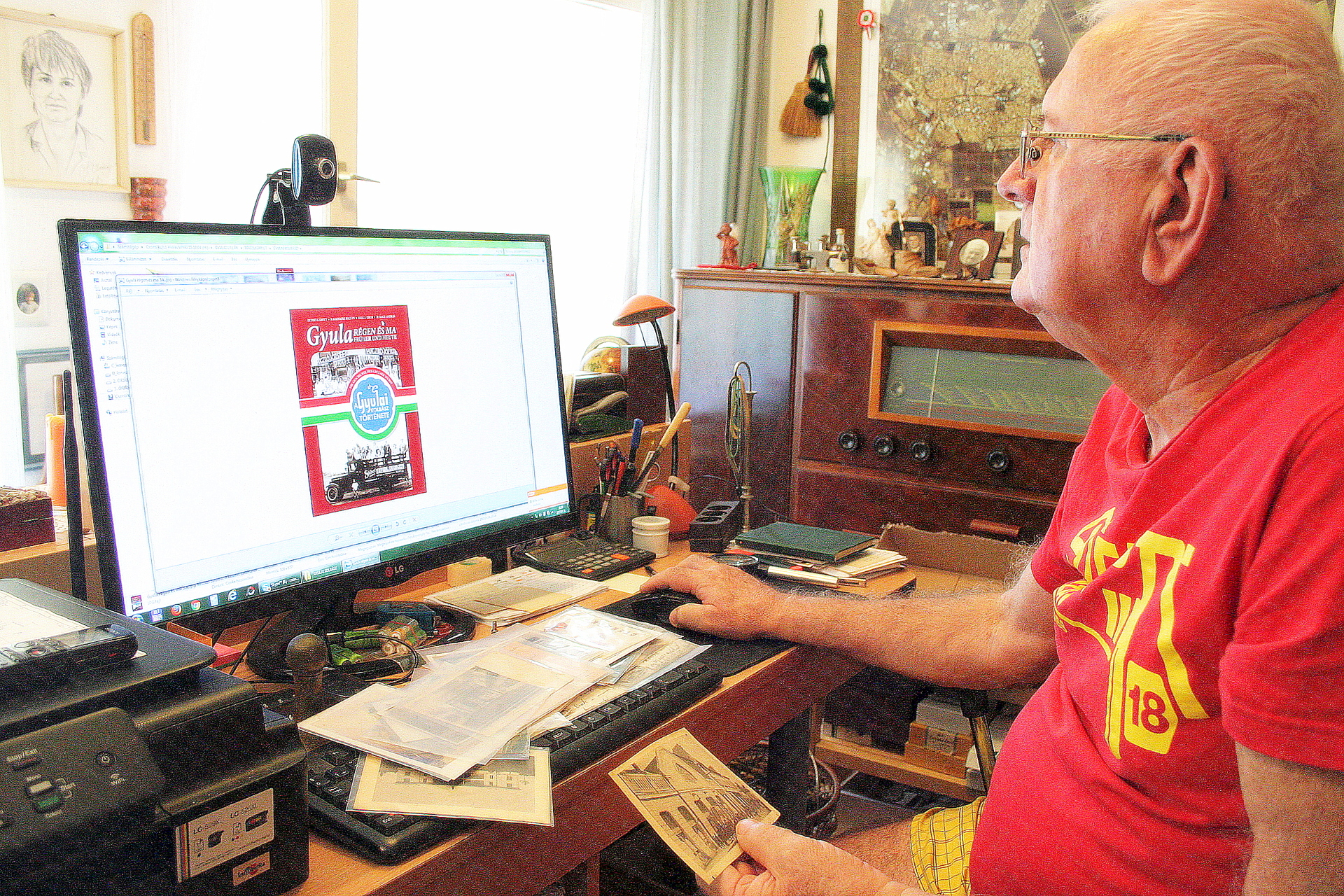 Képes családfák és családi fényképek, festmények és kisplasztikák, könyvek Gyuláról és a világtörténelemről, a Békés című újság több évfolyama albumokba kötve, az Almásy grófi család gyulai konyhája a kiszolgáló személyzettel, és persze, utóbbi is egy régi fotográfián. Hogy honnan került az újvári házba a példány? Herczeg Gábor köszörűsmestertől, aki Gyula városának egyik legendás figurája volt. De akár az ócskapiacról is érkezhetett volna ide, egy szerencsés nap után, mint az említett hírlapkollekció.