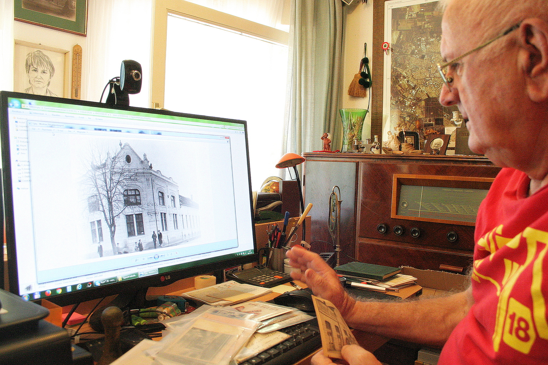 Csak nézegetjük a képeket, bőven van, mit, hisz a gépen már annyi a tárolt fotómennyiség, hogy még egy nagy adatbázist kezelő informatikus is elcsodálkozott rajta, amikor vészhelyzet miatt kihívták. Utcanevek, helyszínek, személyek, események szerint válogathatunk, és dönthetjük el, mire vagyunk jobban kíváncsiak. Előkerül a Százéves cukrászda, Gyula biciklis múltja, a Gyulahús története, az egykori iparosok, a Polgári Kör lebontott székháza, a németvárosi katolikus plébános szerelmes levele. Megcsodáljuk az első képeslapok egyikét is, amelyen riportalanyunk dédnagyapja, Kohlmann Ferenc aranyműves háza látható. Ez sincs már meg, korábban a pártszékház, most az ügyészség épülete magasodik a helyén, világosít fel Balla Tibor, és felvázolja röviden, hogy a második világháború után sok minden egyébbel együtt elvették tőlük az épületet.