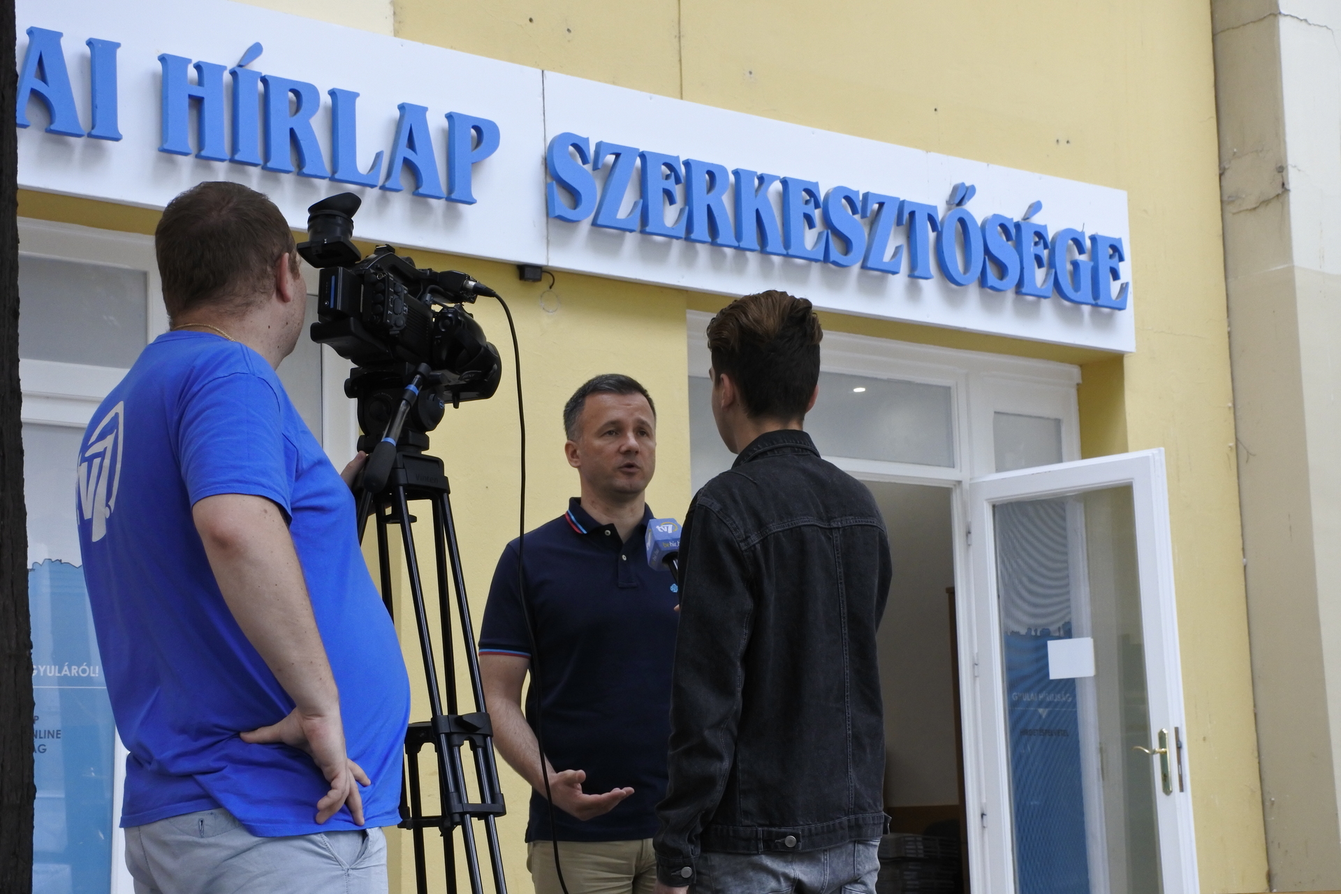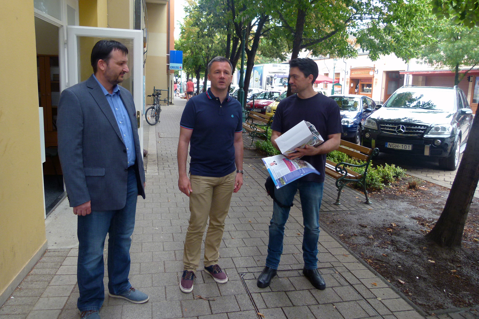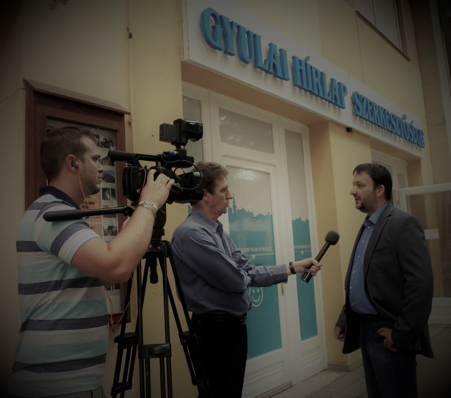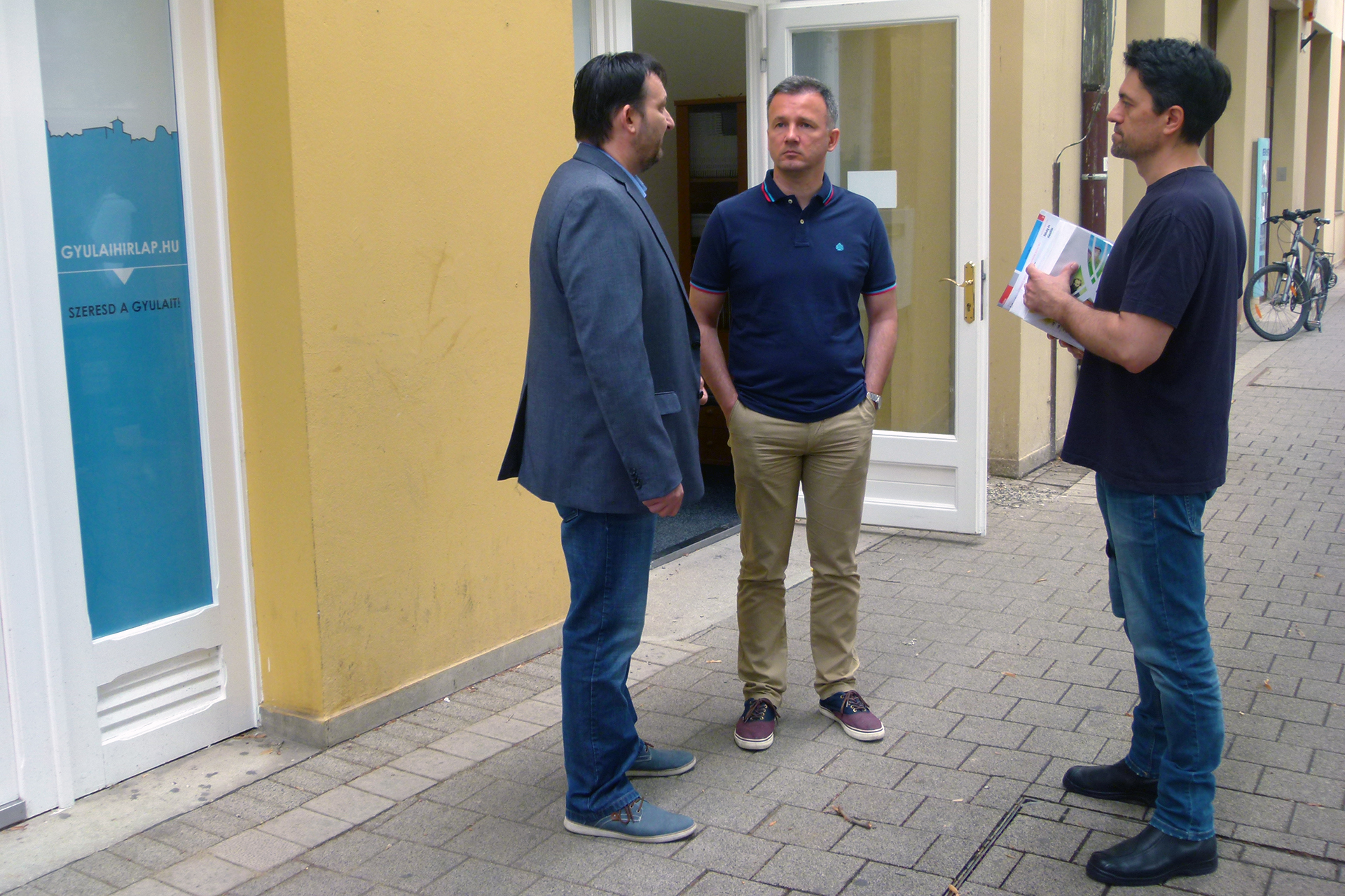 Németh Antal, Görgényi Ernő és Mocsár-Pörjés József a Gyulai Hírlap szerkesztősége előtt