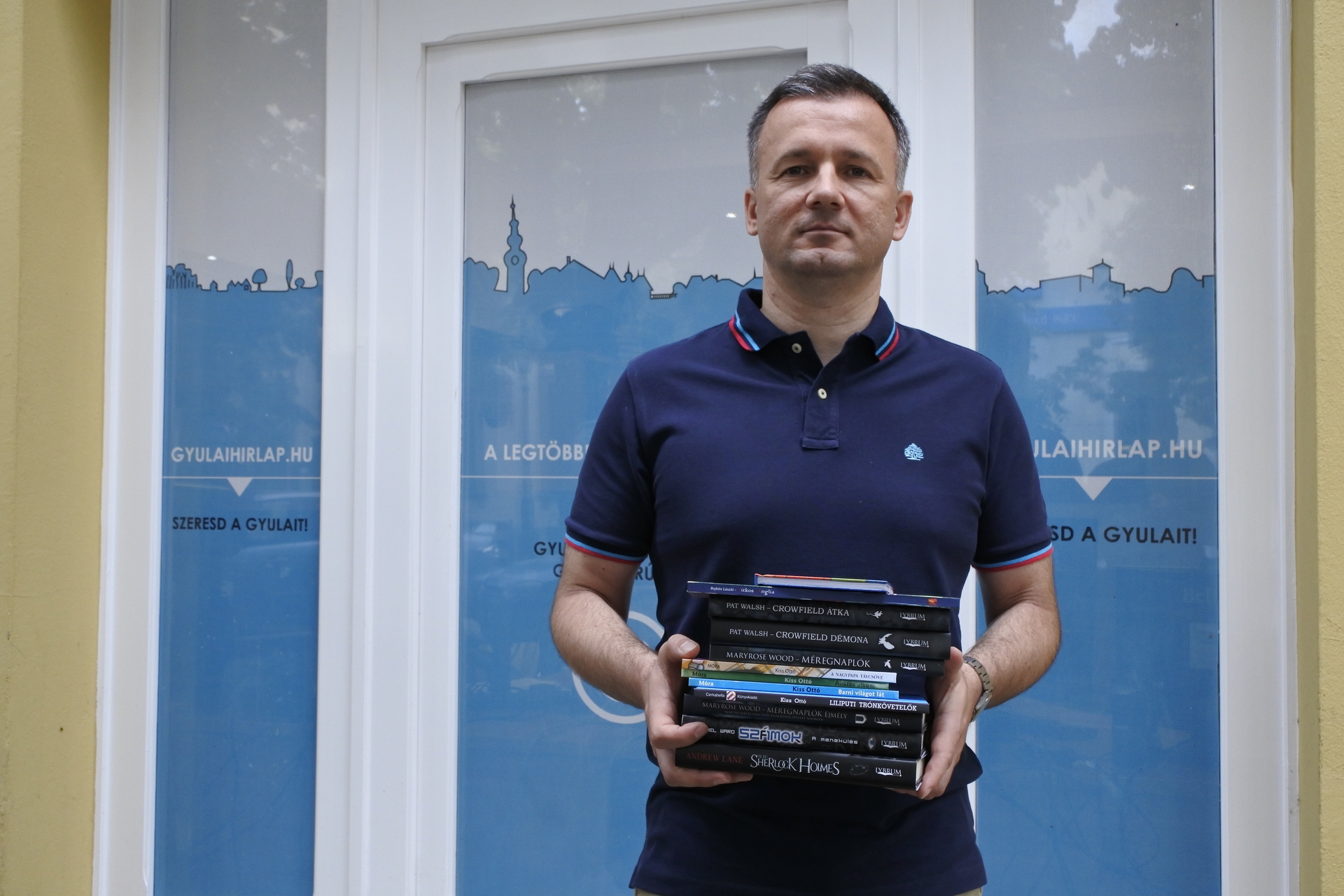 A sajtótájékoztatóval egybekötött átadón a polgármester gyermekkönyveket és ifjúsági regényeket nyújtott át lapunk főszerkesztőjének, Mocsár-Pörjés Józsefnek.