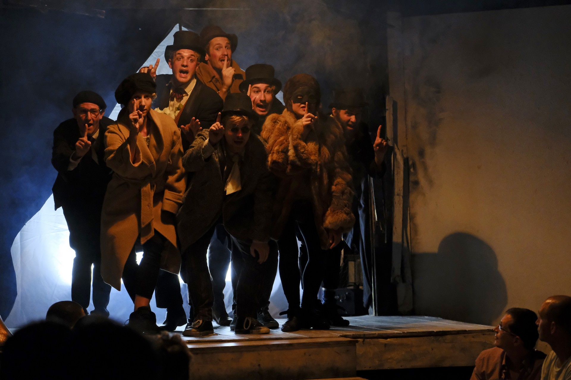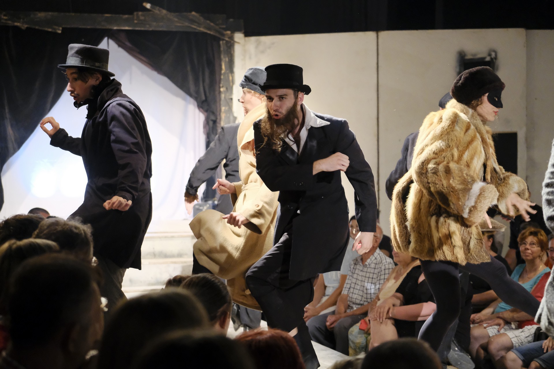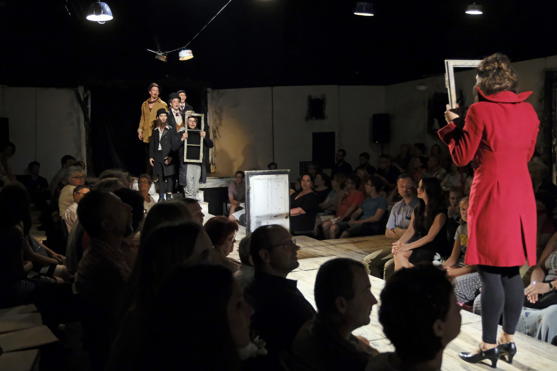 Ifj. Vidnyászky mellett a darab átdolgozásában dramaturgként az egykori évfolyamtárs, a vele megosztva Junior Prima-díjas, költőként is sikeres, egyetemi doktorandusz Vecsei H. Miklós segített (aki eljátszotta Ifj. Schwartz Adolfka, a bécsi nemes szerepét is), a zenei vezető Kovács Adrián volt. A nézők nem a hagyományos nézőtéren, hanem a színpadon berendezett kis színházban foglaltak helyet, tényleg karnyújtásnyira a színészektől, teljesen belehelyezkedve a darabba. Jómagam az első sorból élvezhettem a parádét, hiszen itt senki sem az, aki, és semmi nem az, ami. Minden színész tudatában van, hogy színész, színház a színházban, lehetőség a játékban, interaktív és halmozottan üdítő.