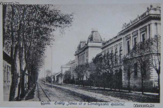 A törvényszék épülete, balról pedig a kisvasút egy korabeli képeslapon