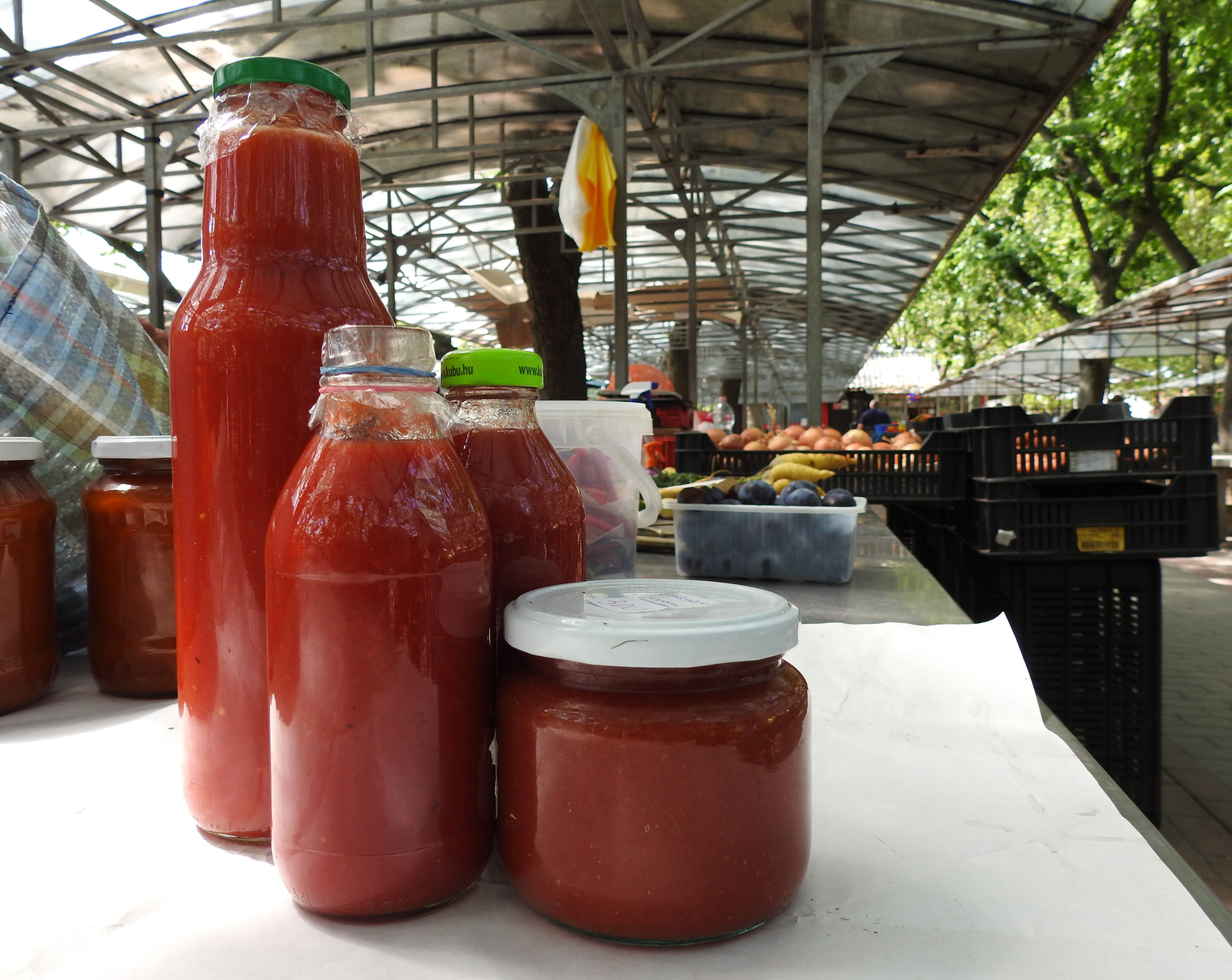 A standos lapunk érdeklődésére elmondta: a standján árusított, kisebb és nagyobb üvegekbe töltött paradicsomlé a saját kertjében megtermelt zöldségből készül. Mint kifejtette, addig árulja a kézművesterméket a piacon, amíg paradicsom van a kertjében.
