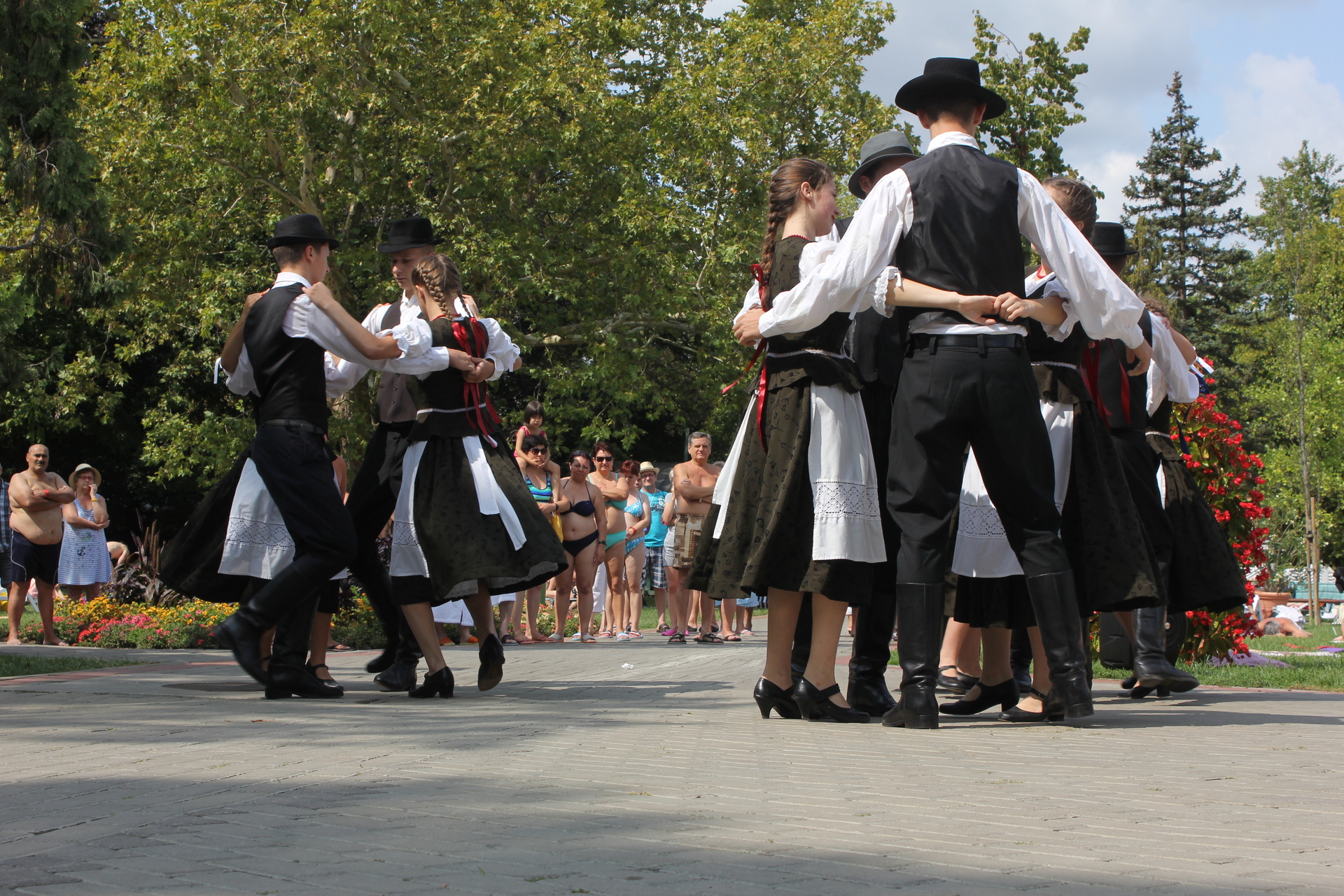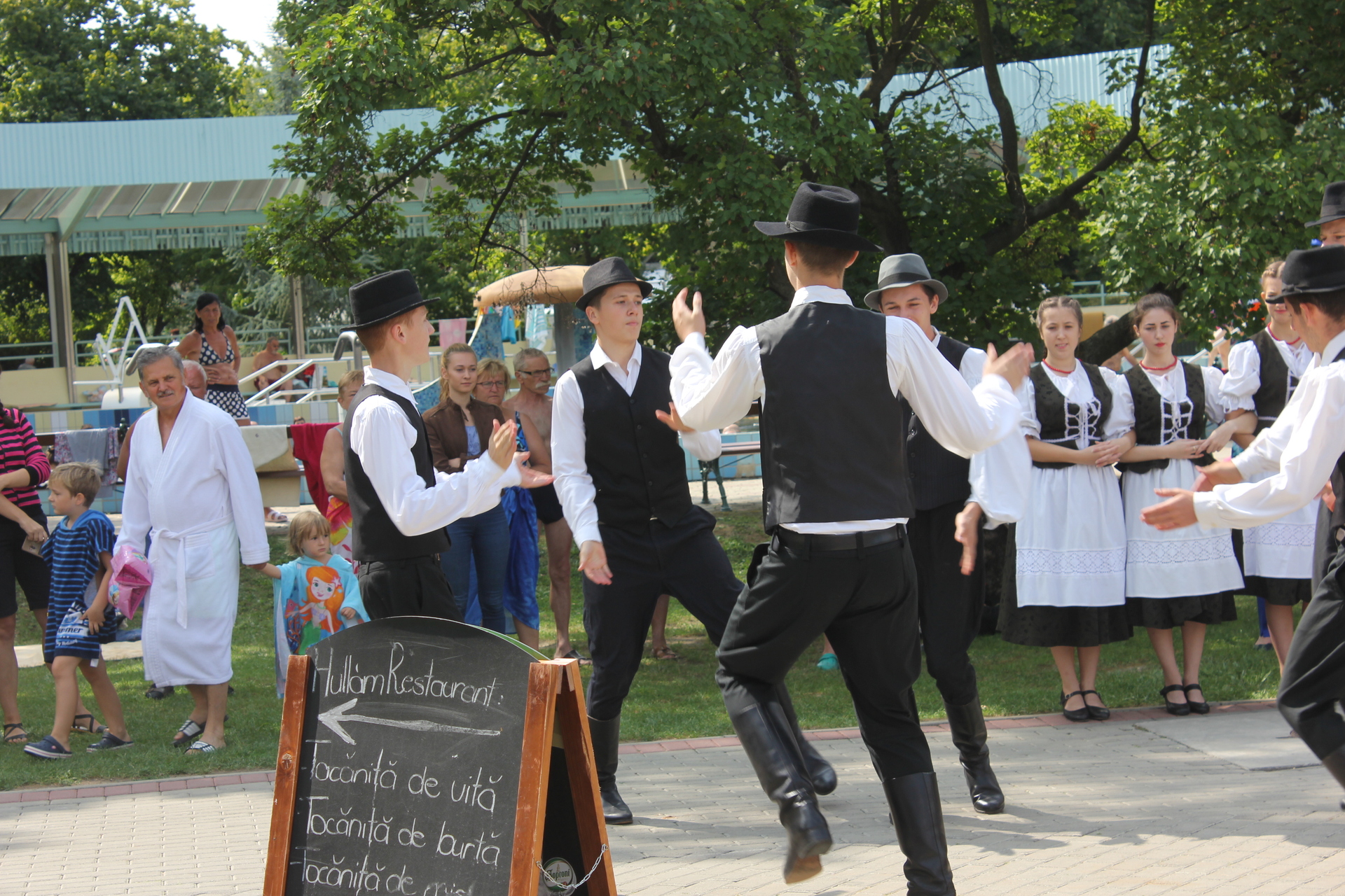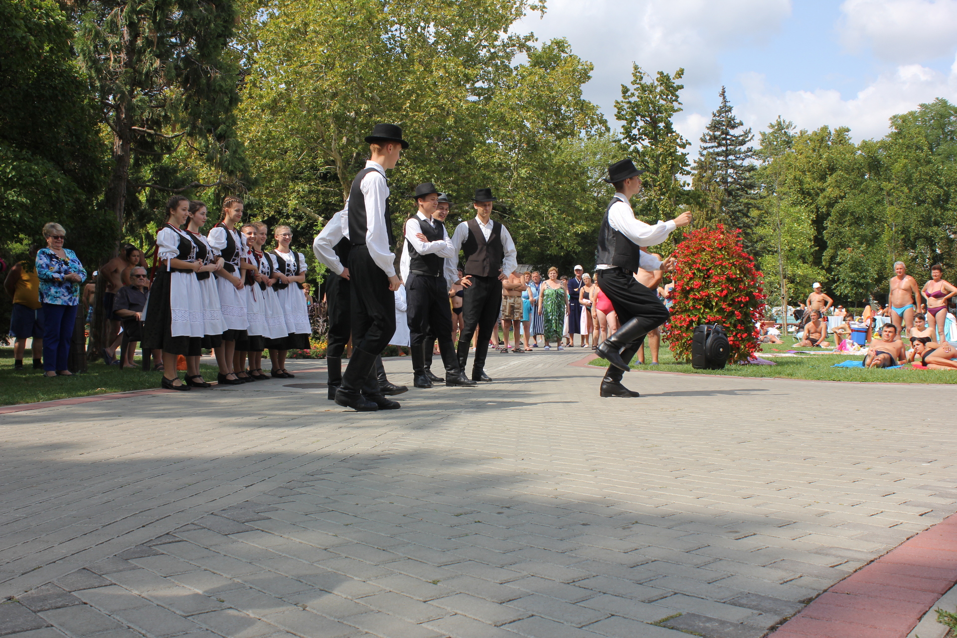 Nem mindennapi élményben volt része azoknak a látogatóknak, akik a Gyulai Várfürdőt választották augusztus 23-án. Délelőtt 11 órakor ugyanis néptáncosok lepték el az AquaPalota melletti területet, és mintegy fél órán át szórakoztatták a meglepett látogatókat, akik hamar körbeállták az Arad megyei iskolásokat.