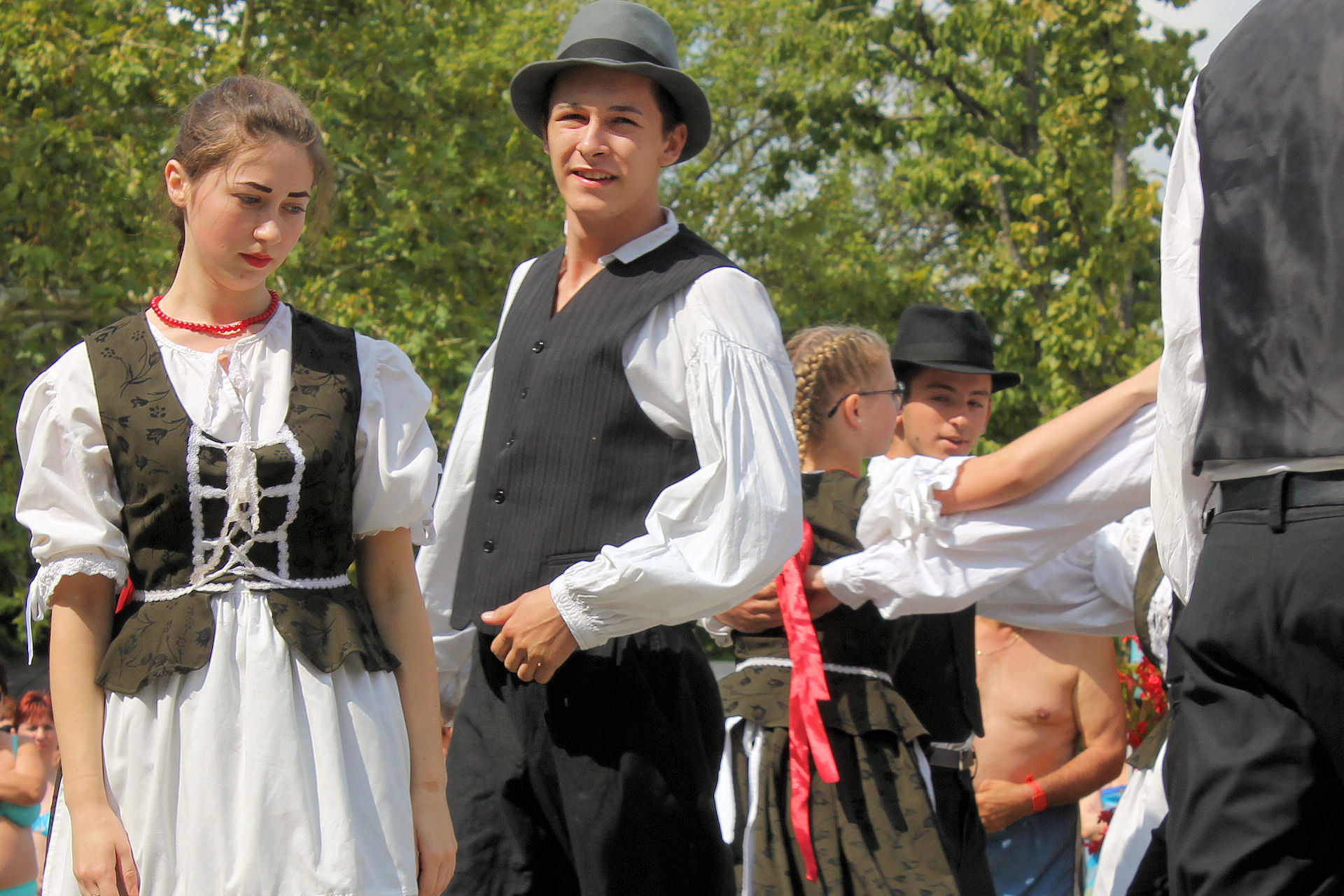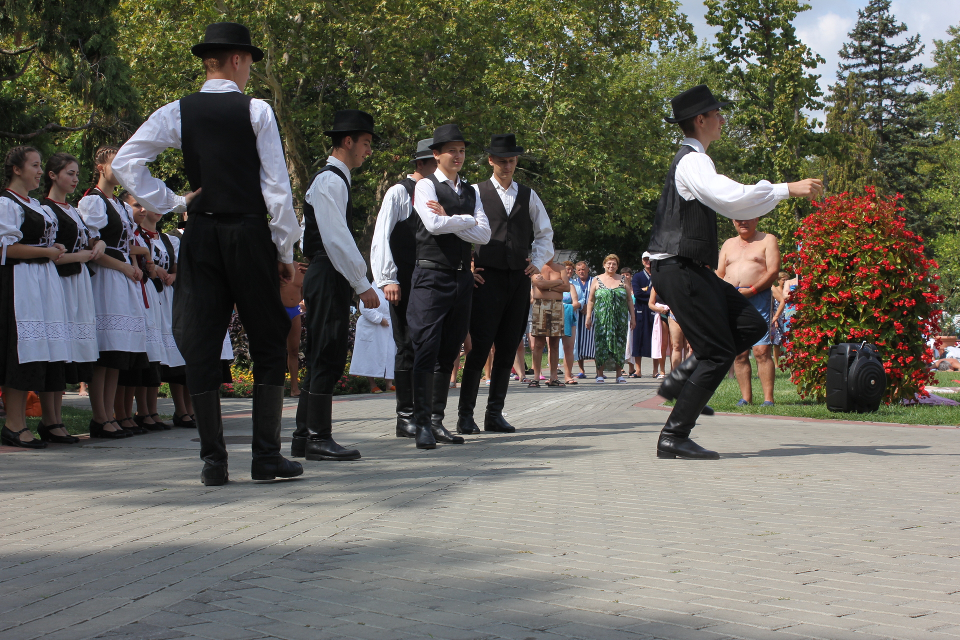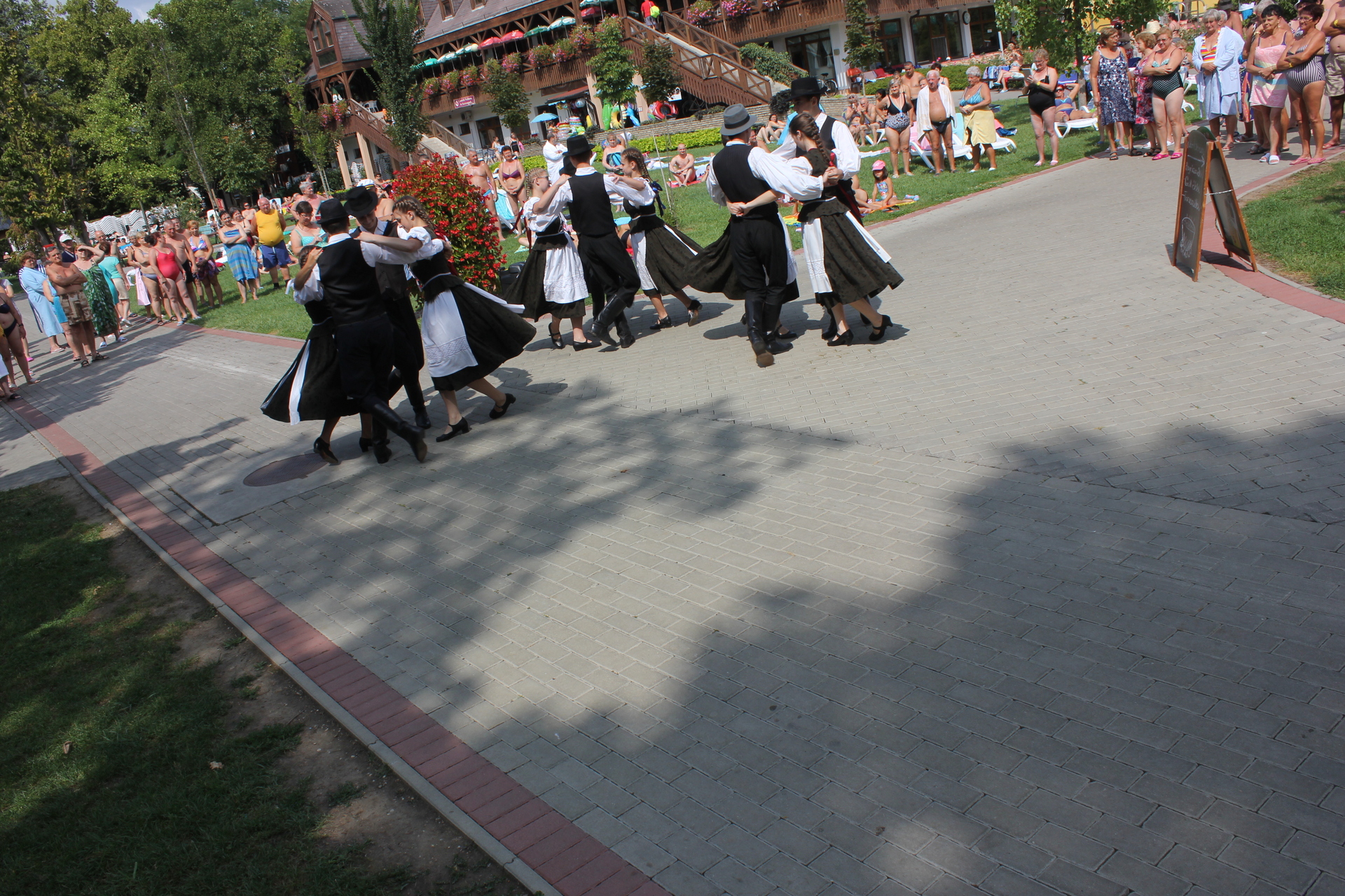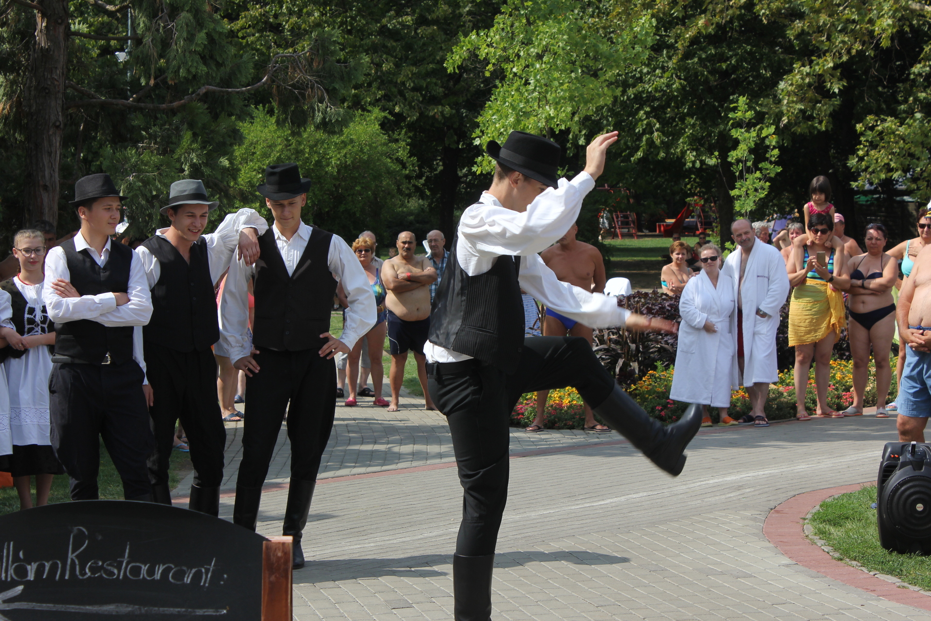 Nem mindennapi élményben volt része azoknak a látogatóknak, akik a Gyulai Várfürdőt választották augusztus 23-án. Délelőtt 11 órakor ugyanis néptáncosok lepték el az AquaPalota melletti területet, és mintegy fél órán át szórakoztatták a meglepett látogatókat, akik hamar körbeállták az Arad megyei iskolásokat.