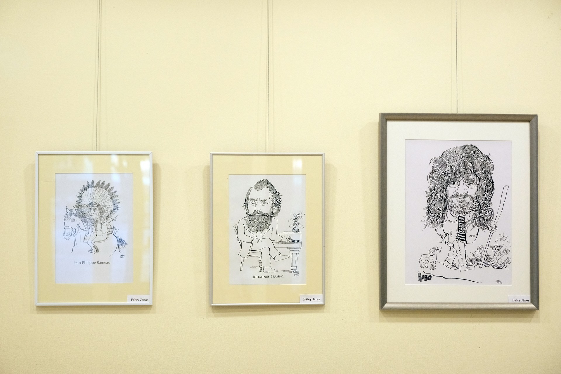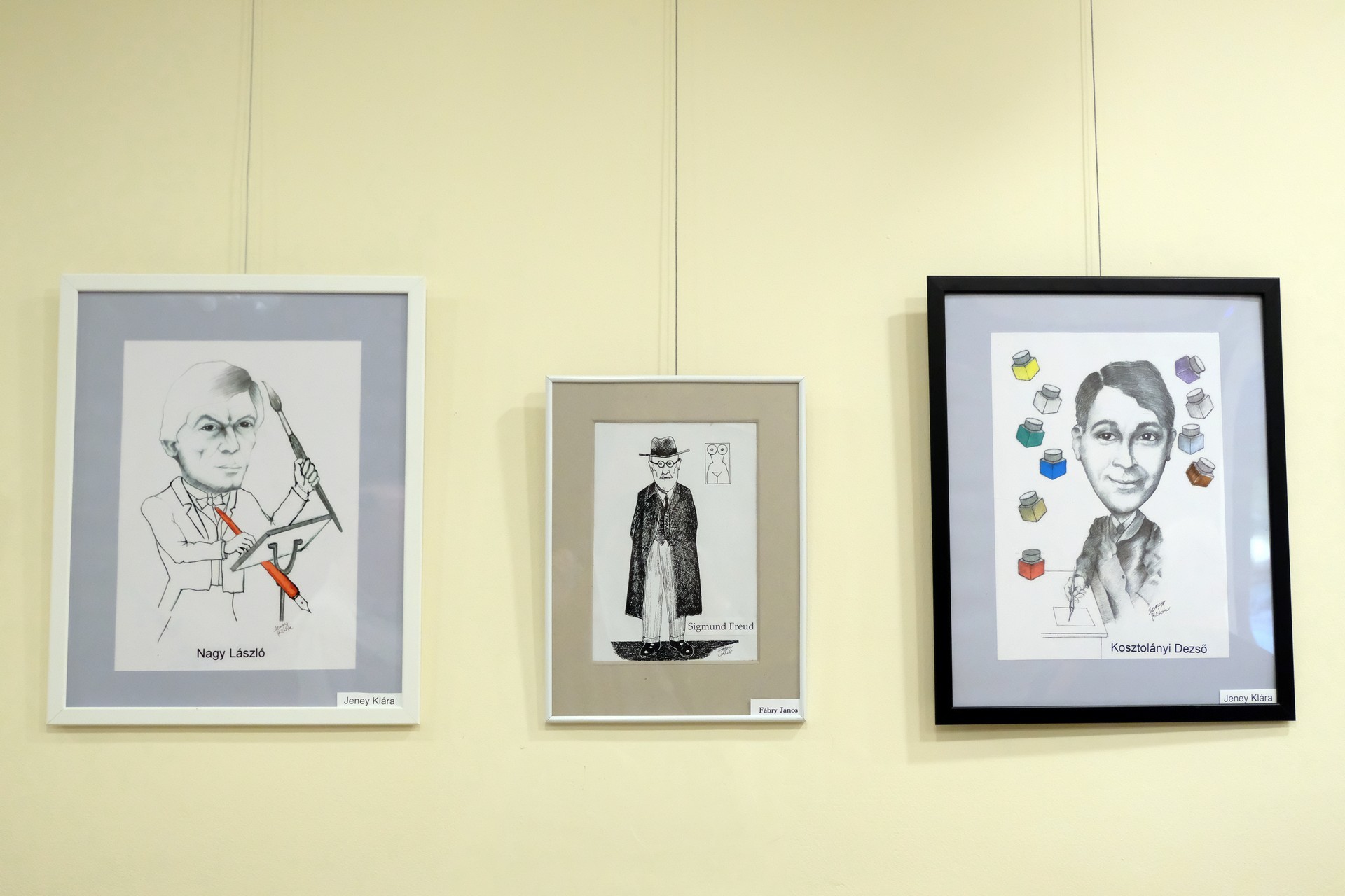 Ha végignézünk a falakon, két alkotó munkáit látjuk, mutatott rá a képzőművész pedagógus. Két olyan személyét, akik ugyanazzal a technikával dolgoznak, mégis teljesen másképp. Jeney Klára ceruzával, Fábry János tussal. Amennyiben naivan közelítünk munkáikhoz, azt látjuk, a ceruzás rajzok pontos megfigyelésen alapuló formákból indulnak ki, ezek mellé kerülnek kiegészítőként az ábrázoltak attribútumai, tárgyai. Az összhatás viszont, amit az egyes testrészek aránytalansága teremt meg, első ránézésre egyet mondat velünk: hogy a készítője nem tud rajzolni. Pedig tud, mert a fej, az arc esetében ezt demonstrálja. A tussal készült kompozíciókat más jellemzi, legfőképpen az, hogy nagyon alapos előmunkát kívánnak meg. Ahhoz, hogy a vonal ott legyen, ahol kell, óriási technikai tudás szükséges.